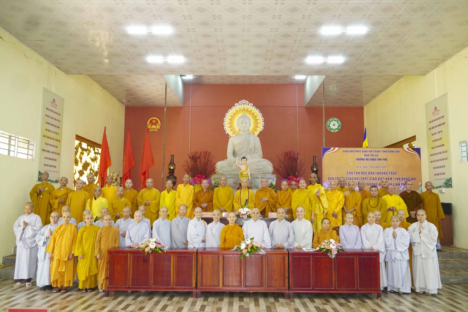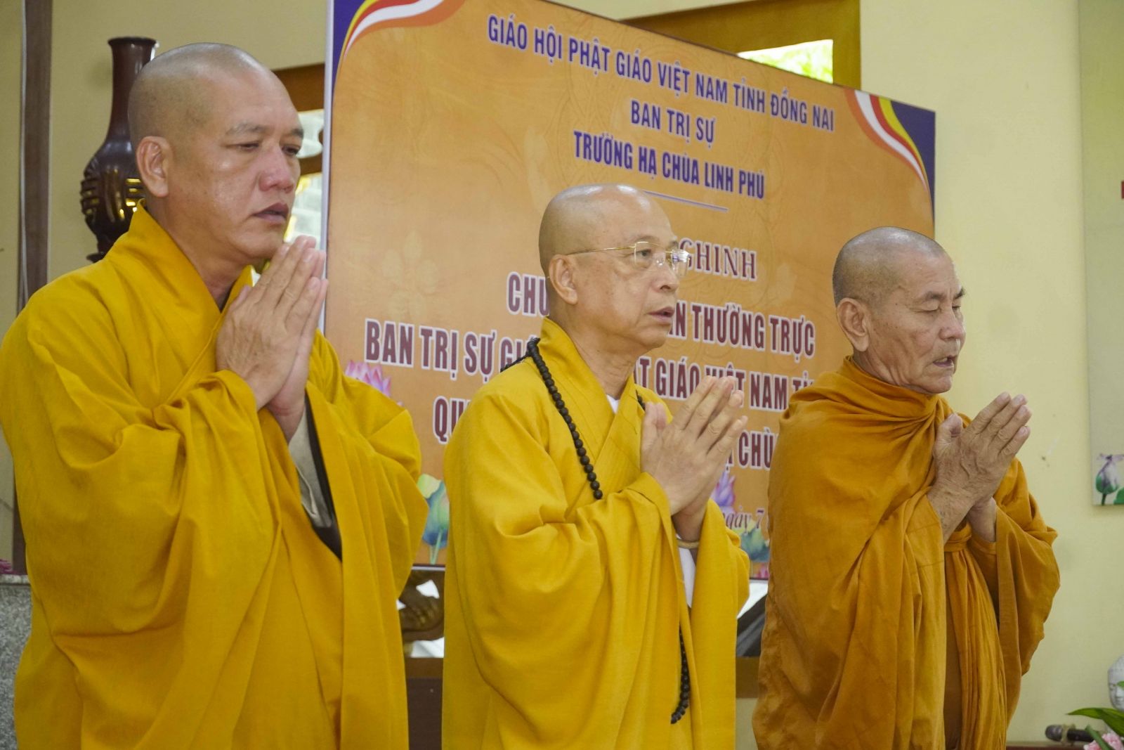 Tiếp đoàn đến thăm có HT. Thích Pháp Cần - Ủy viên Ban Trị sự GHPGVN tỉnh, Trưởng Ban Tổ chức, Thiền chủ kiêm Hóa chủ Hạ trường; ĐĐ. Thích Nguyên Trung – Phó Ban Tổ chức, Chánh na Hạ trường; NS. Thích nữ Hạnh Liên - Ủy viên Ban Trị sự GHPGVN tỉnh, Ủy viên Ban Tổ chức, Giáo thọ Hạ trường Ni; NS. Thích nữ Như Phương – Đặc trách Ni giới Hạ trường; cùng chư Tôn đức Ban Tổ chức, Tăng Ni hành giả An cư tại Hạ trường Chùa Linh Phú.