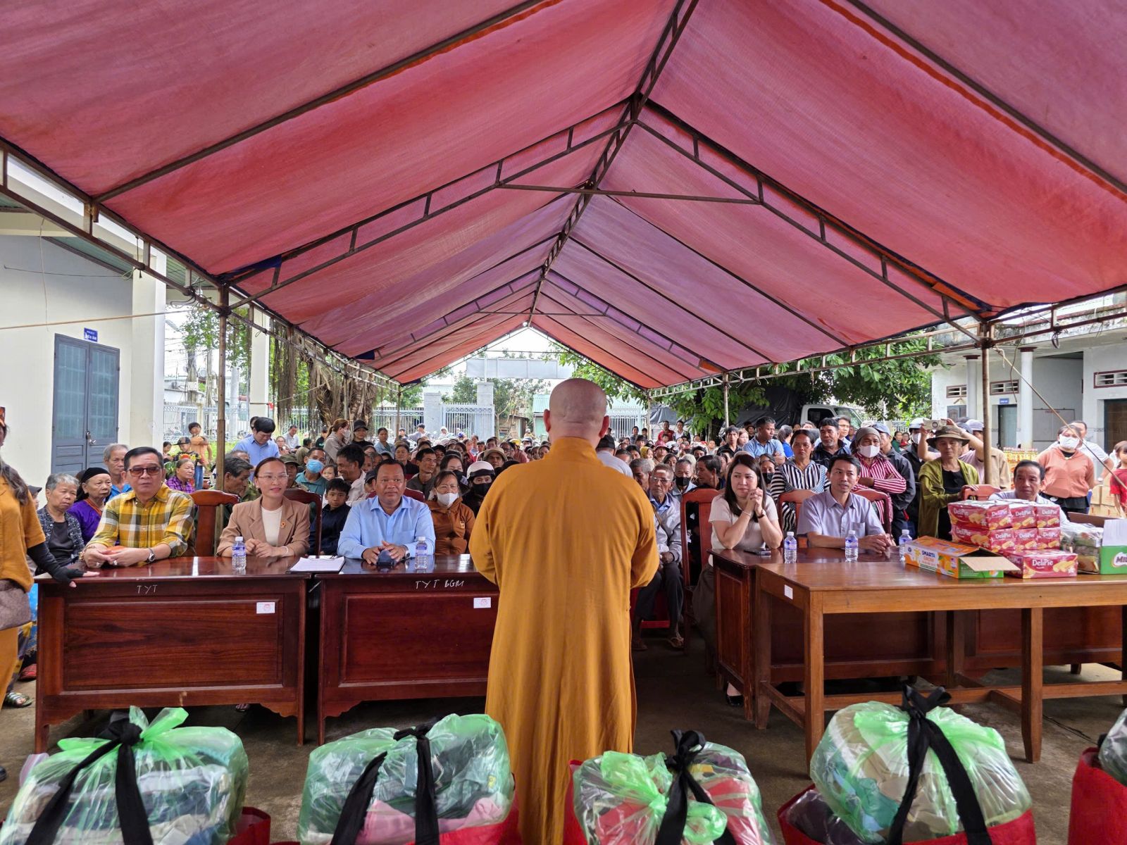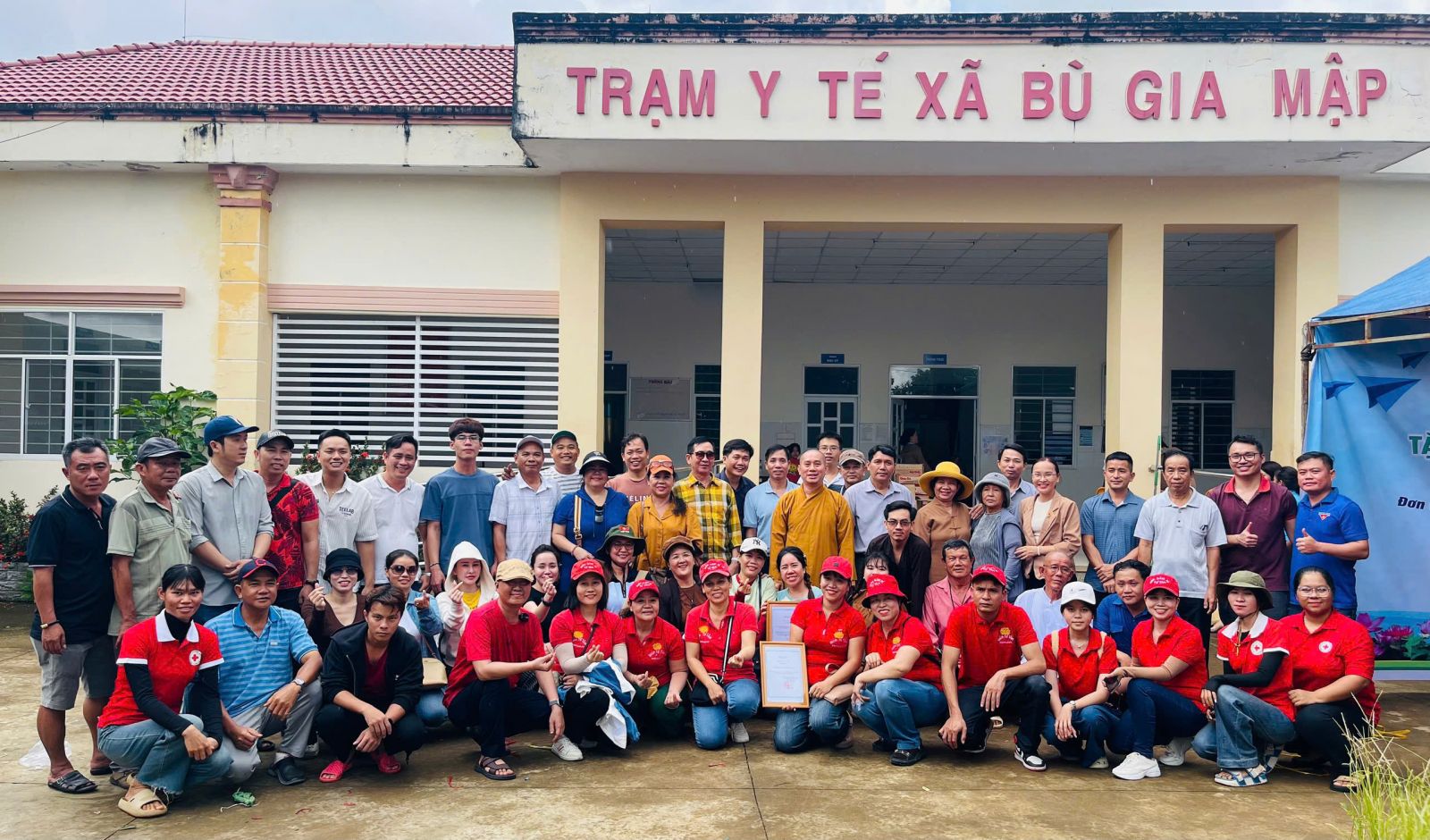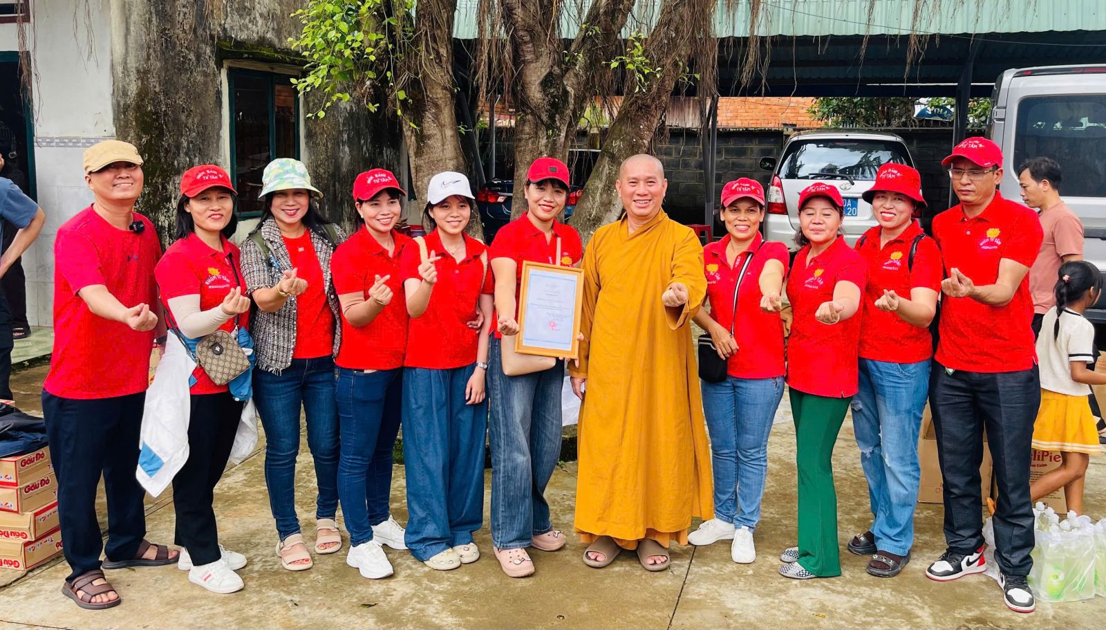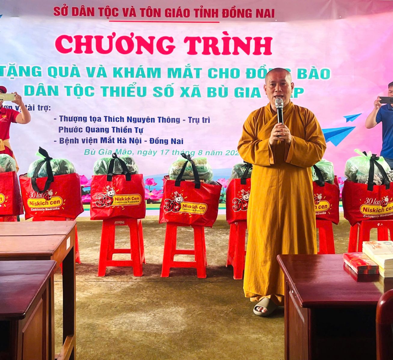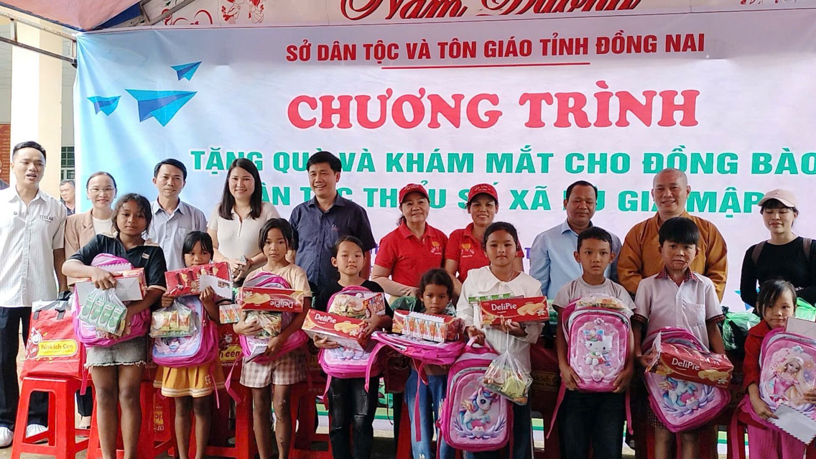 Đoàn do ĐĐ. Thích Nguyên Thông - Ủy viên Ban Trị sự, Phó trưởng ban Từ thiện xã hội GHPGVN tỉnh Đồng Nai, Trụ trì Thiền tự Phước Quang làm Trưởng đoàn; đi cùng đoàn có ông Thổ Úc – Đại biểu Quốc hội, Phó Giám đốc sở Dân tộc và Tôn giáo tỉnh Đồng Nai, ông Hoàn Cư – Phó Giám đốc sở Dân Tộc và Tôn giáo tỉnh Đồng Nai; ông Trần Đức Hòa – Chủ tịch xã Bình Minh; về phía mạnh thường quân có Resort Hoa Đệ Nhất – xã An Phước; ông Phạm Minh Triết – xã Long Thành; Cty Cổ phần Hùng Cường Pharma TP. Hồ Chí Minh; cùng thành viên trong đoàn.