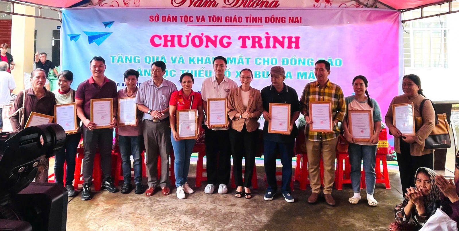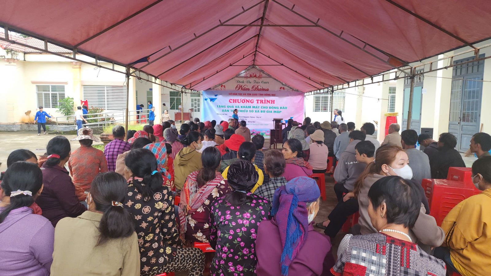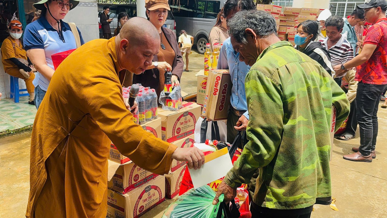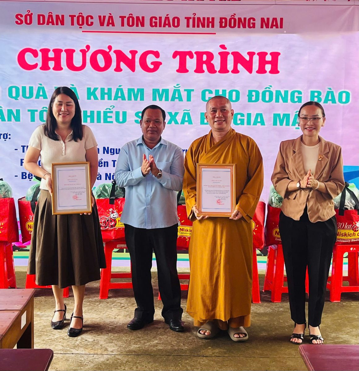 Đoàn do ĐĐ. Thích Nguyên Thông - Ủy viên Ban Trị sự, Phó trưởng ban Từ thiện xã hội GHPGVN tỉnh Đồng Nai, Trụ trì Thiền tự Phước Quang làm Trưởng đoàn; đi cùng đoàn có ông Thổ Úc – Đại biểu Quốc hội, Phó Giám đốc sở Dân tộc và Tôn giáo tỉnh Đồng Nai, ông Hoàn Cư – Phó Giám đốc sở Dân Tộc và Tôn giáo tỉnh Đồng Nai; ông Trần Đức Hòa – Chủ tịch xã Bình Minh; về phía mạnh thường quân có Resort Hoa Đệ Nhất – xã An Phước; ông Phạm Minh Triết – xã Long Thành; Cty Cổ phần Hùng Cường Pharma TP. Hồ Chí Minh; cùng thành viên trong đoàn.