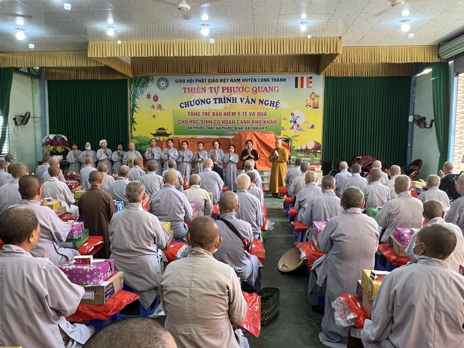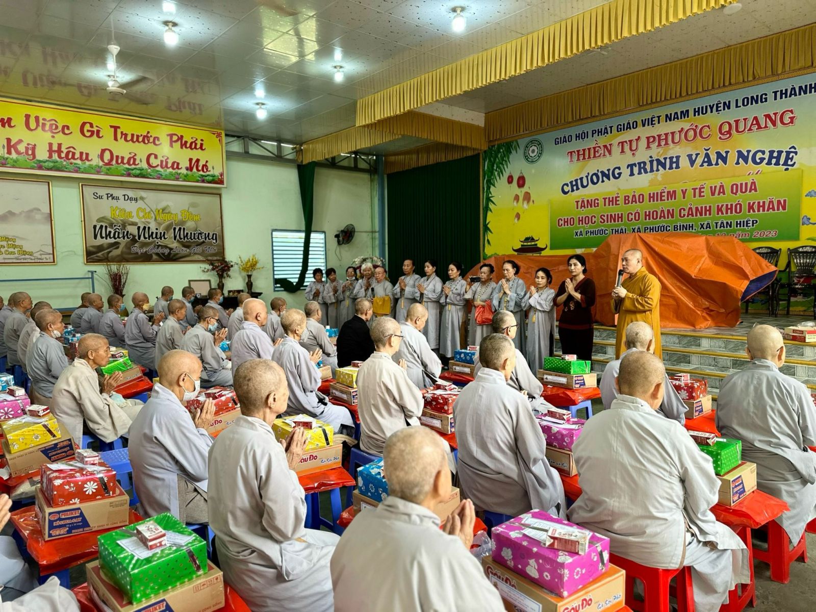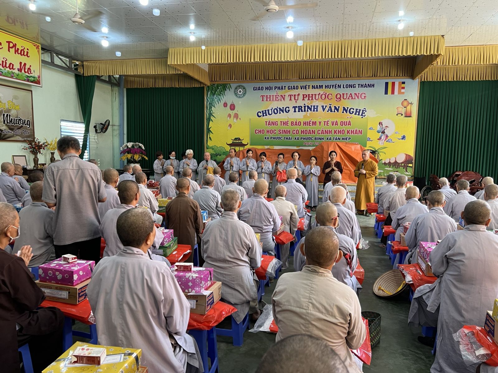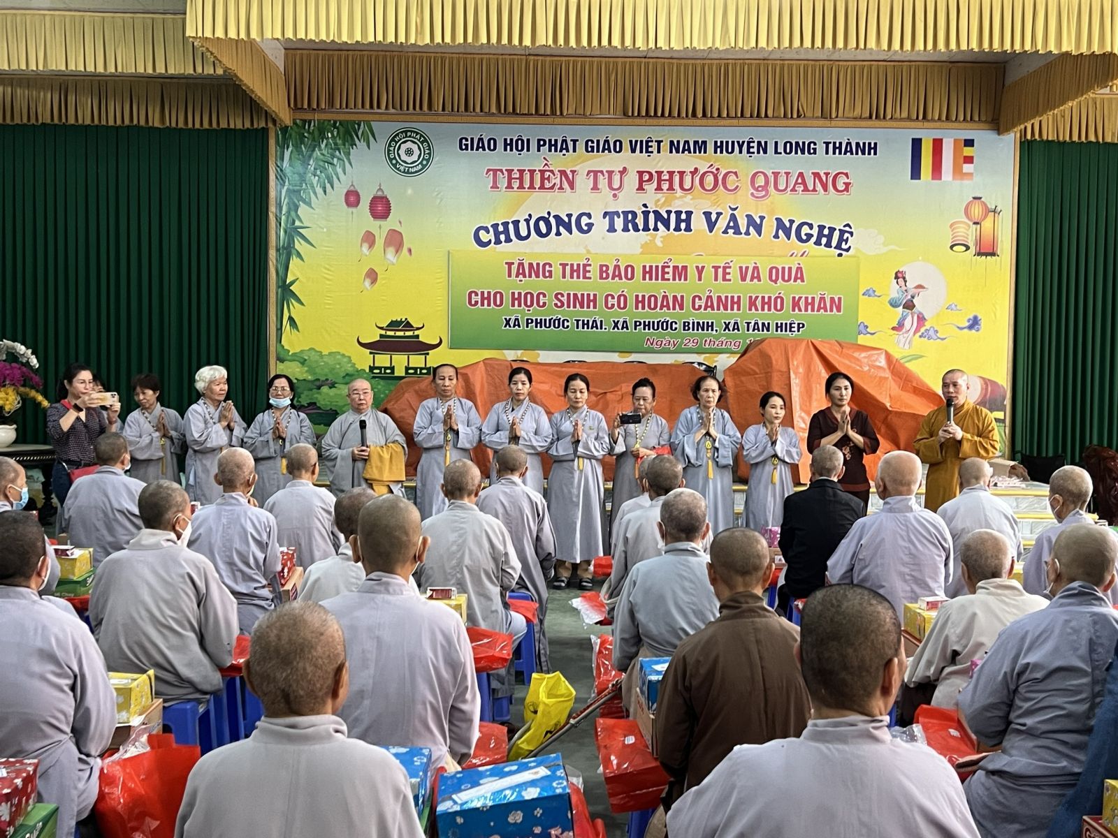 Đến cúng dường có ĐĐ. Thích Nguyên Thông – Phó trưởng ban Thường trực ban Từ thiện xã Hội GHPGVN tỉnh Đồng Nai, Phó ban kiêm Chánh Thư ký Ban Trị sự GHPGVN huyện Long Thành, Trụ trì Thiền tự Phước Quang; cùng chi hội từ thiện báo Giác Ngộ, quý mạnh thường quân, Phật tử xa gần đã về tại Thiền tự Phước Quang để dâng quà cúng dường chư Tăng Ni nhân ngày 20/11. Với tổng trị giá 75 triệu đồng.