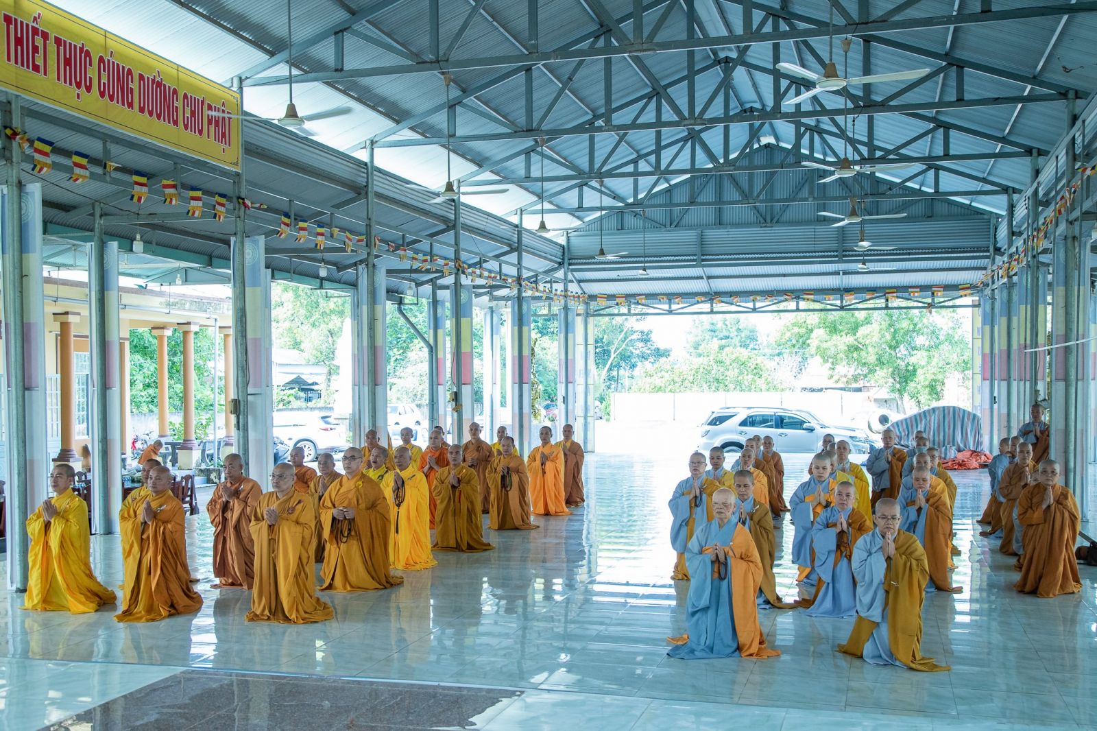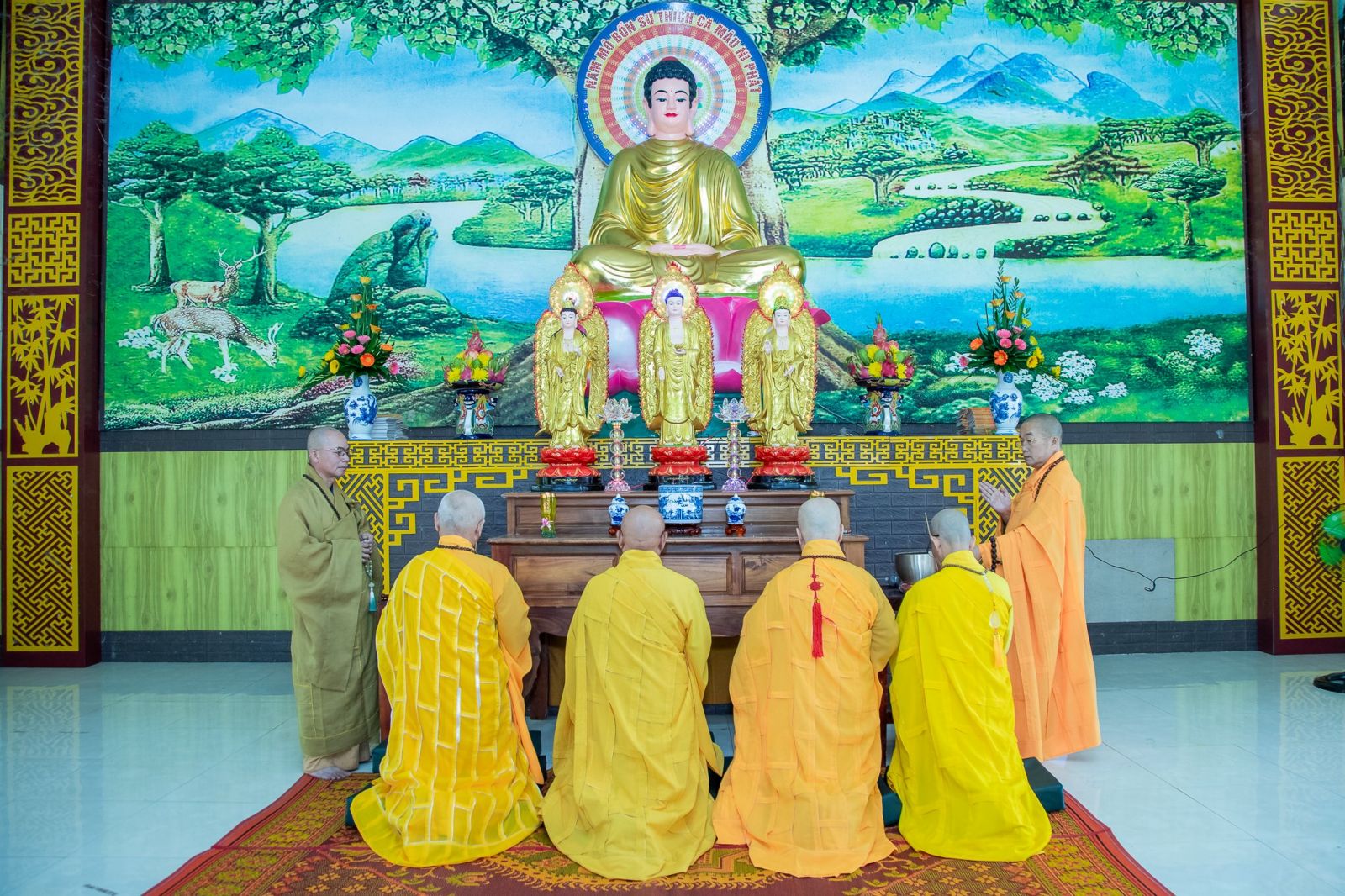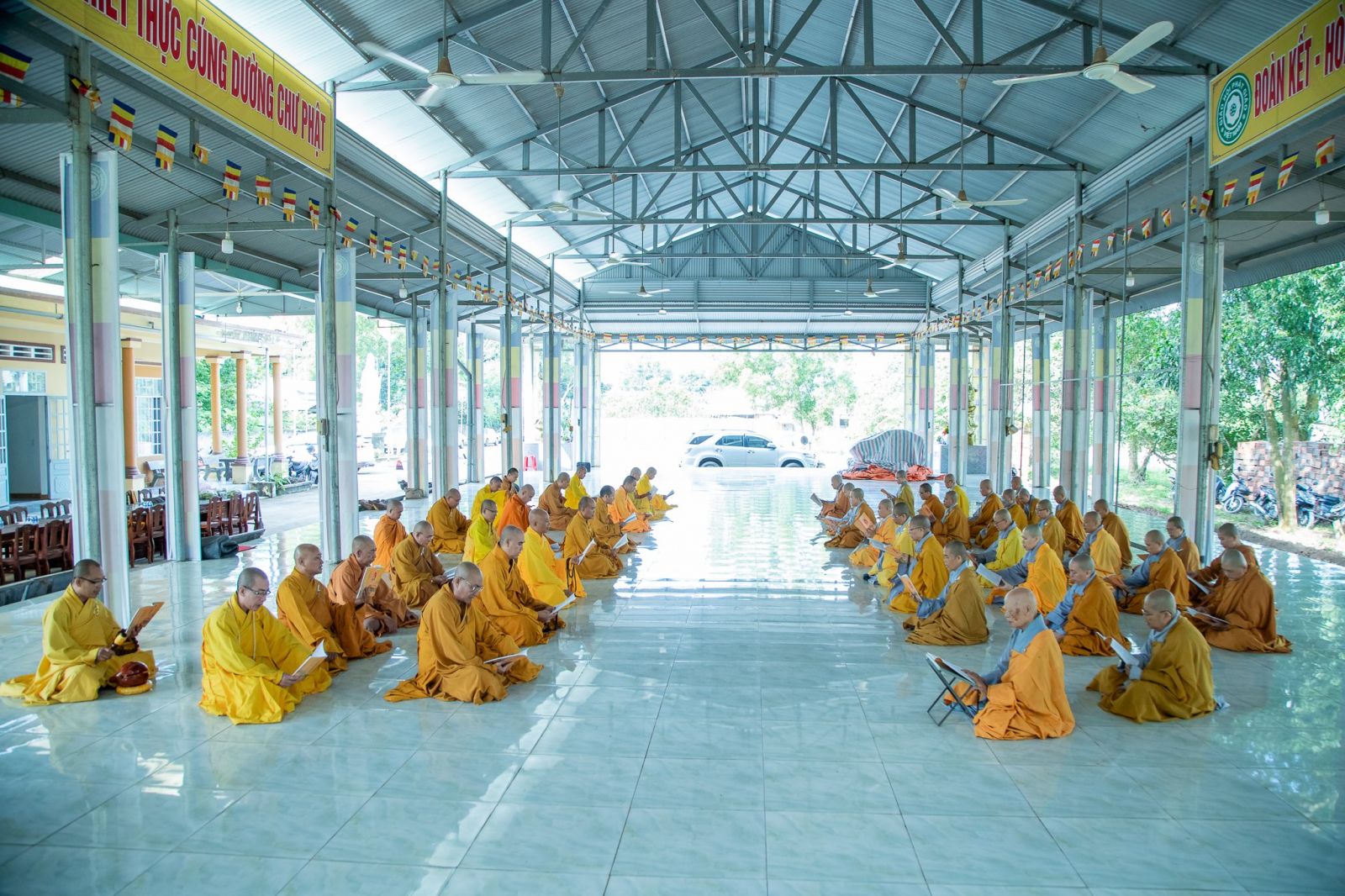 Vào lúc 08h00’ sáng tại Chánh điện Văn phòng Ban Trị sự, chư Tôn Hòa thượng Ban chứng minh niêm hương bạch Phật; toàn thể đại chúng thành kính đảnh lễ Tam bảo, thực hiện nghi thức Yết-ma Bố tát tụng giới.