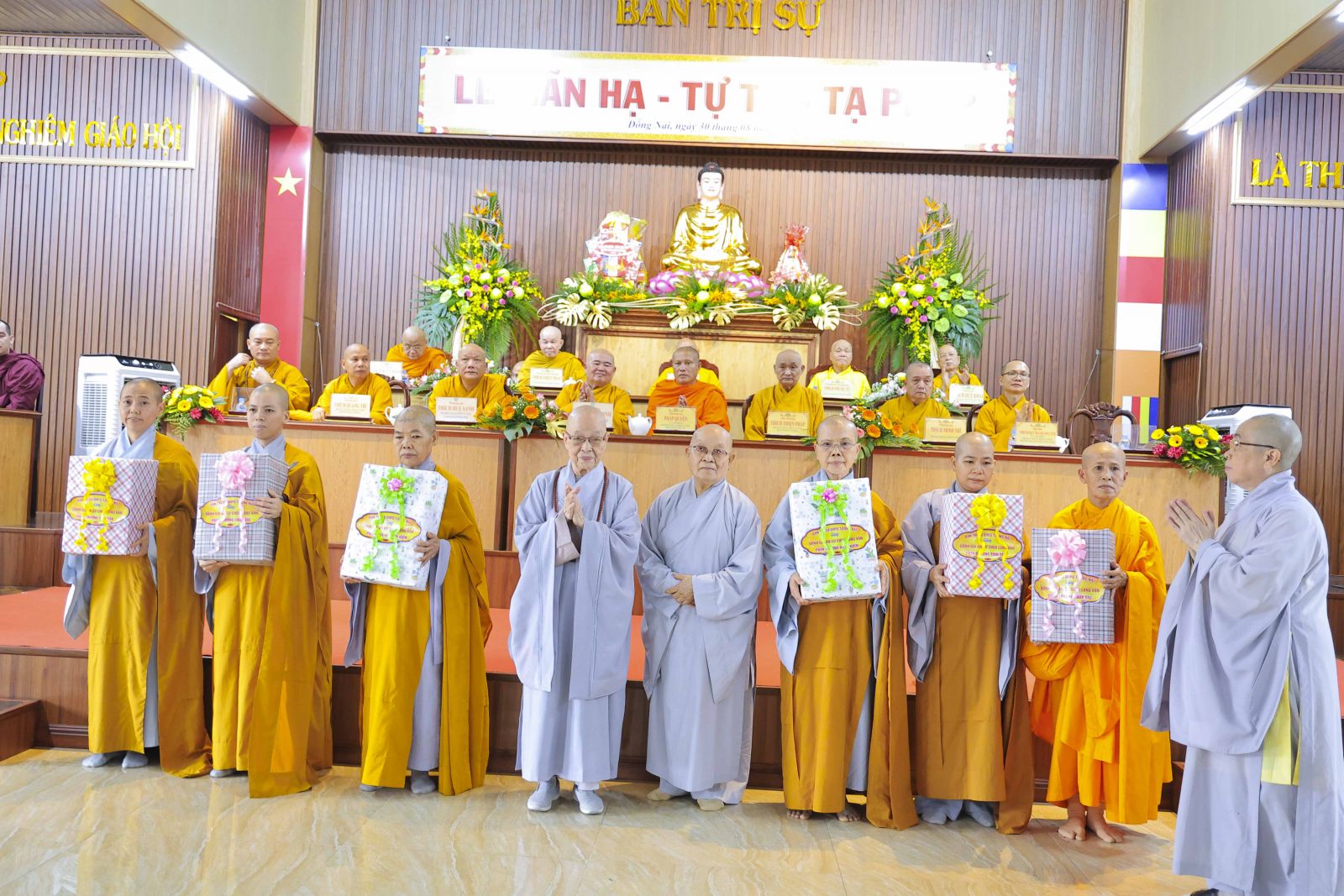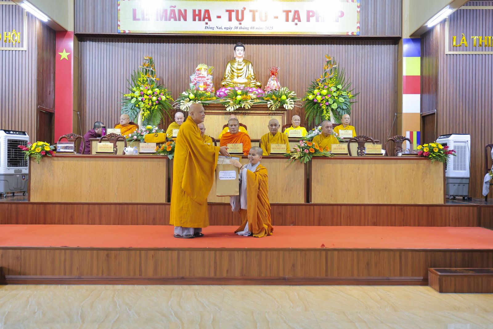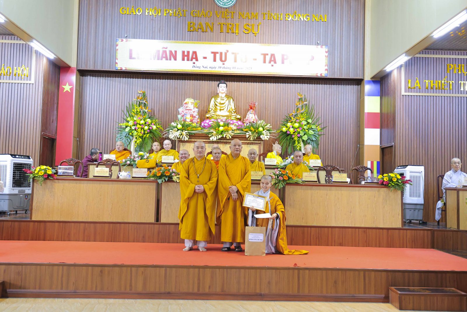 Dịp này, Ban Trị sự Phật giáo tỉnh đã trao tặng những phần quà khích lệ tinh thần Tăng Ni đã cố gắng nỗ lực tu tập, cũng như phụng sự cá Hạ trường trong Ba tháng vừa qua, và Ban Hoằng pháp cũng trao tặng những phần quà của Khóa thi Diễn Giảng Mùa An cư Kiết hạ vừa qua cho Tăng Ni tham dự.