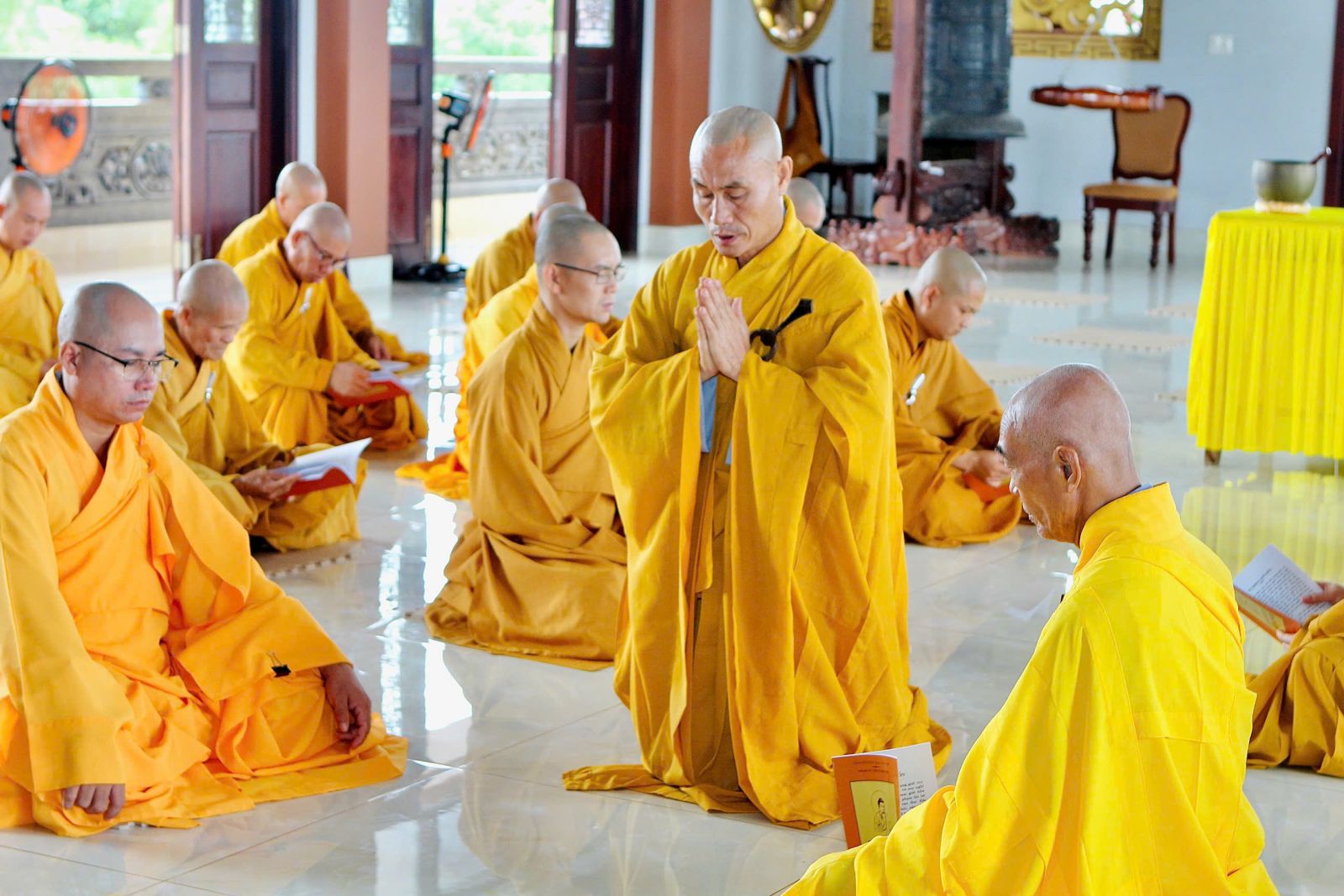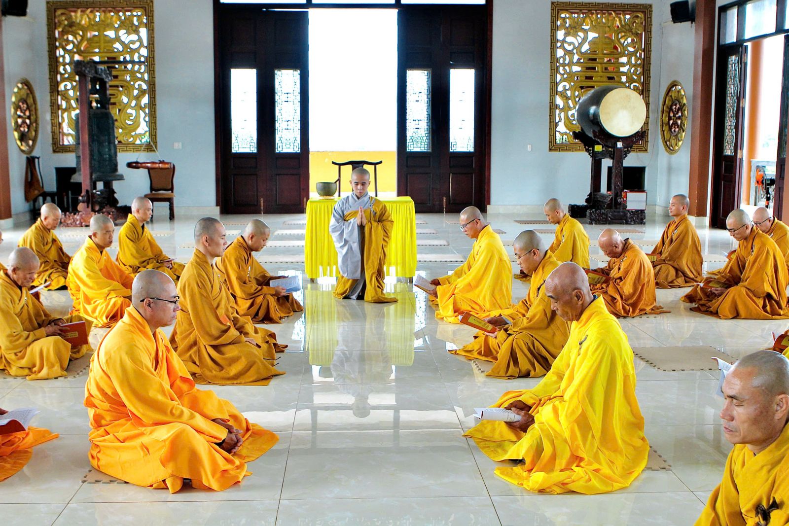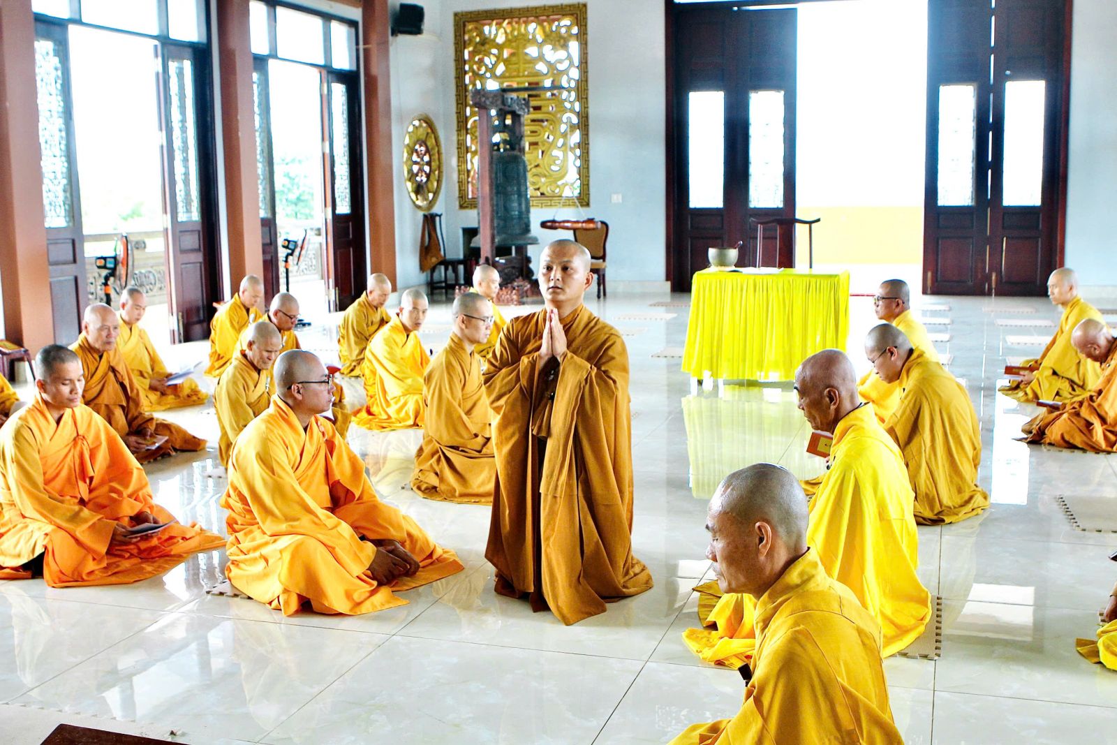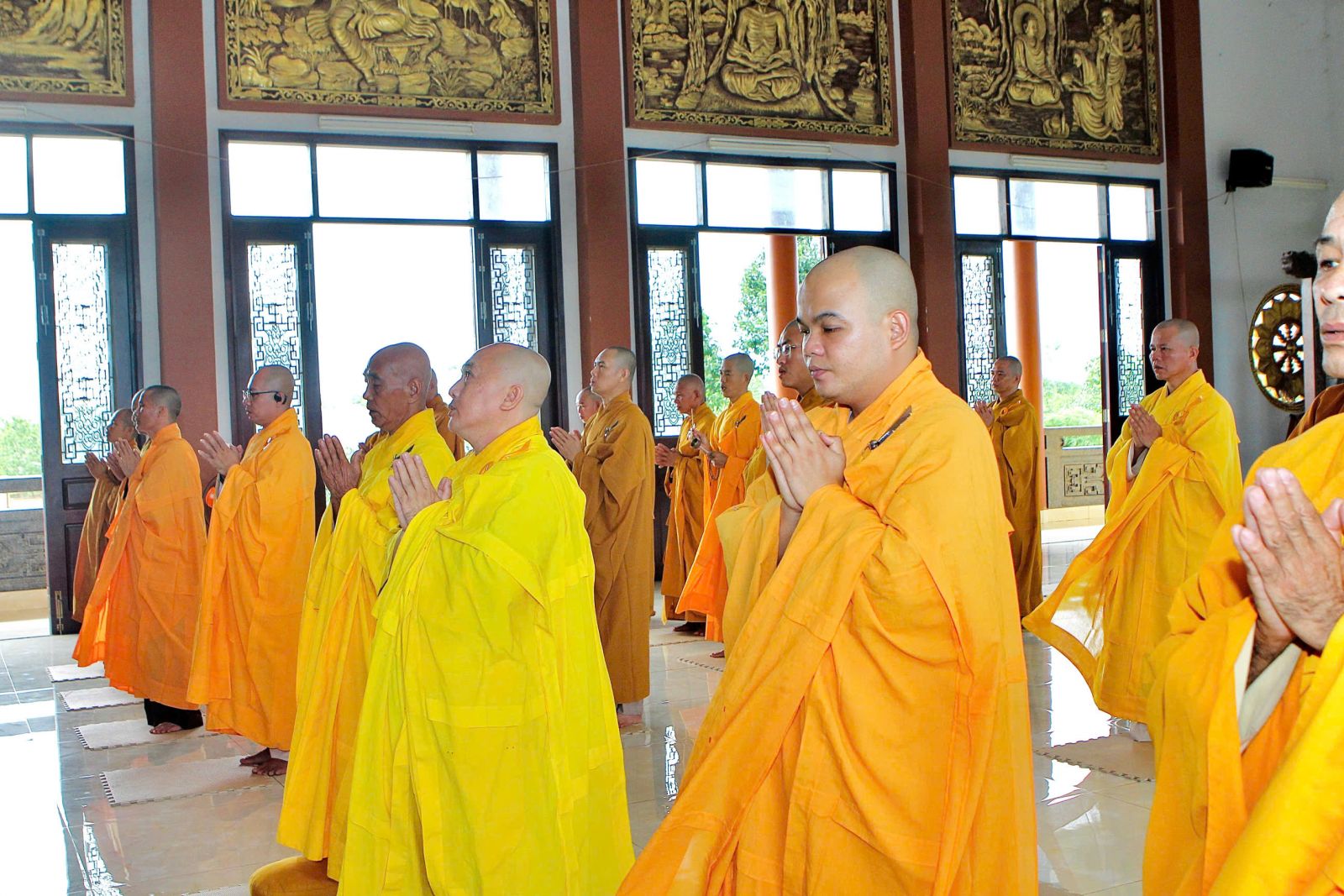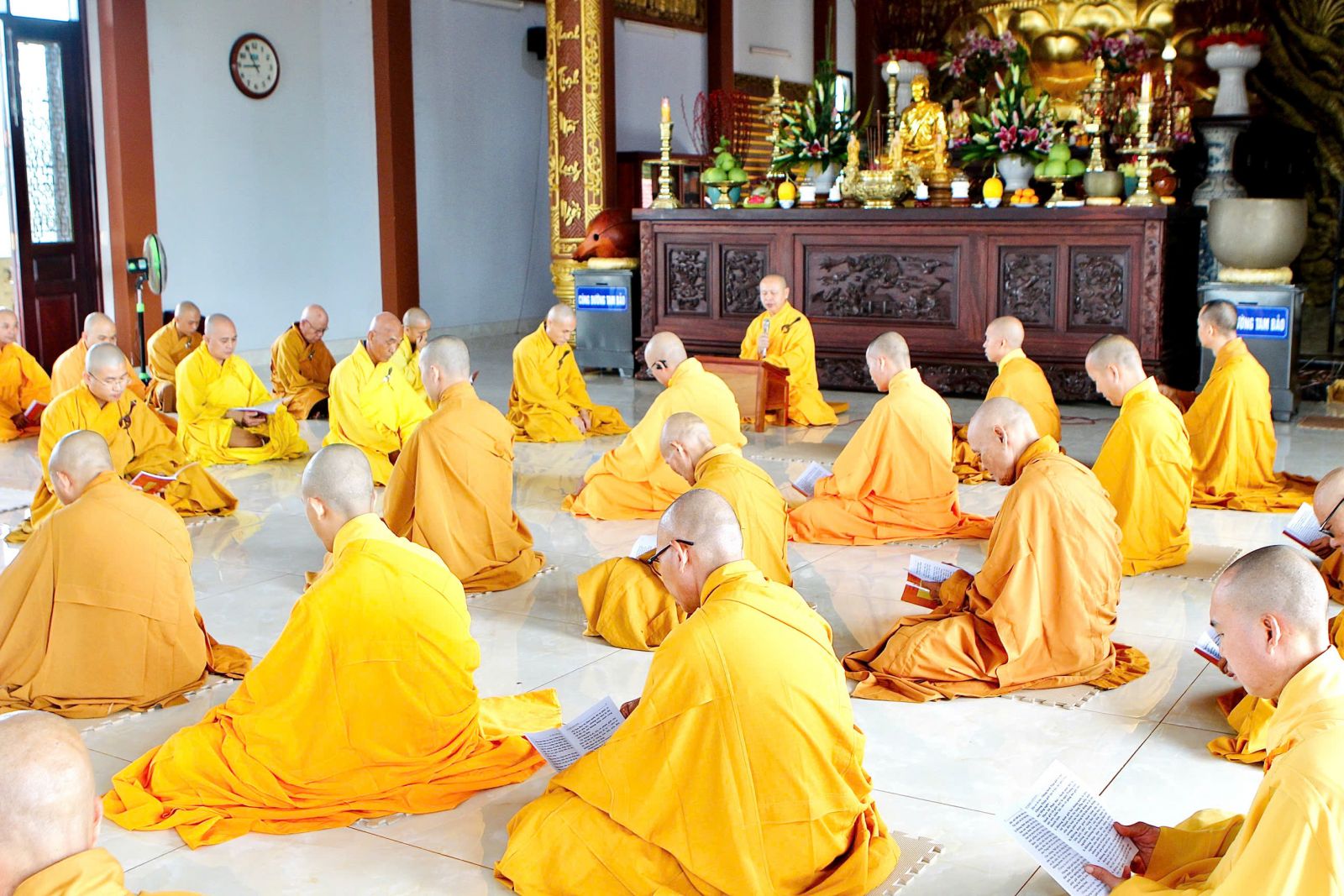 Sau buổi sinh hoạt Tăng sự, chư Tôn đức vân tập về đại hùng bảo điện đảnh lễ Tam bảo và tác pháp yết ma tụng giới.