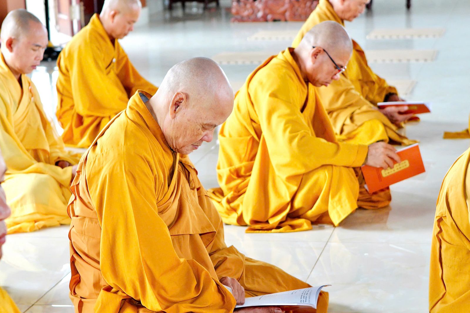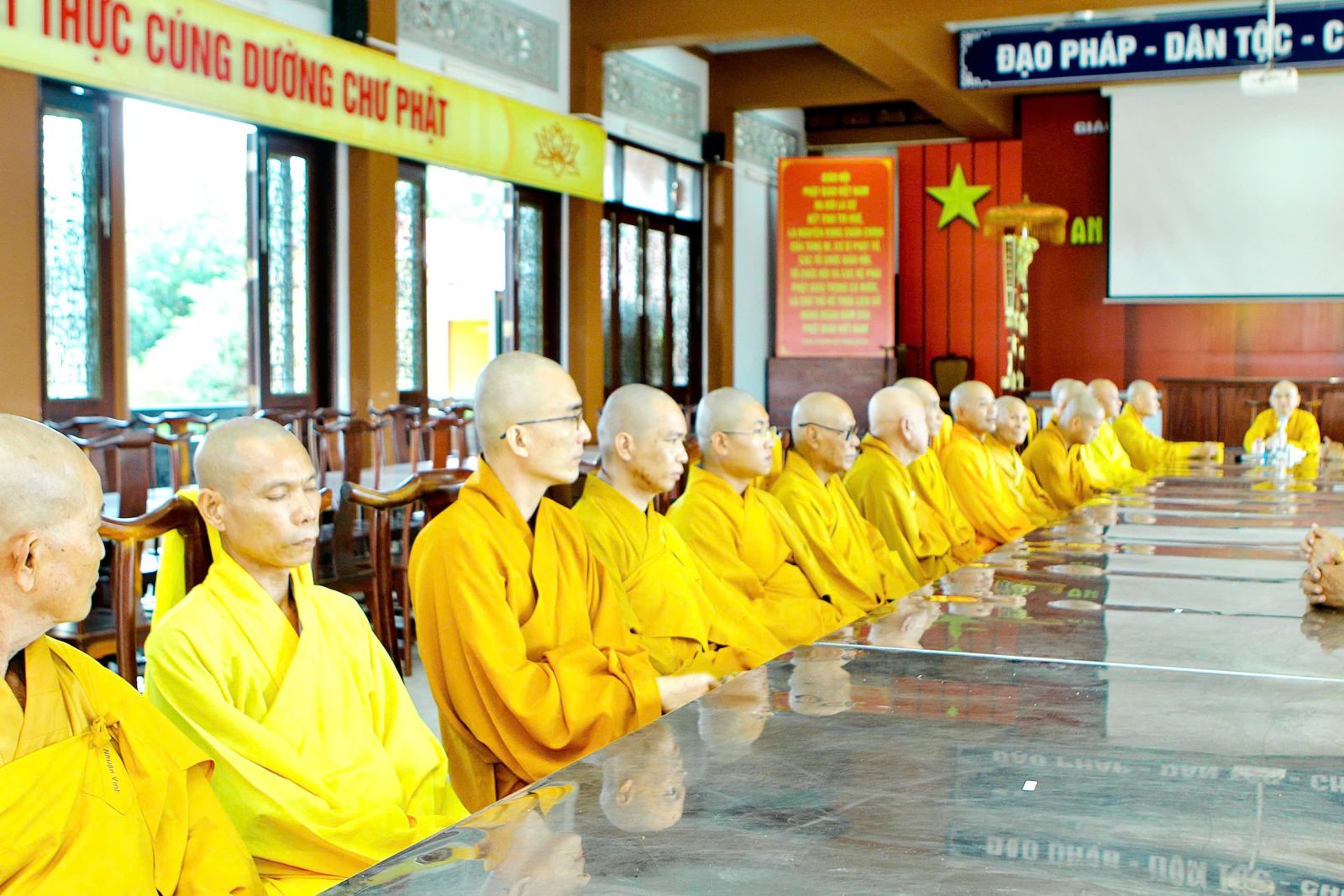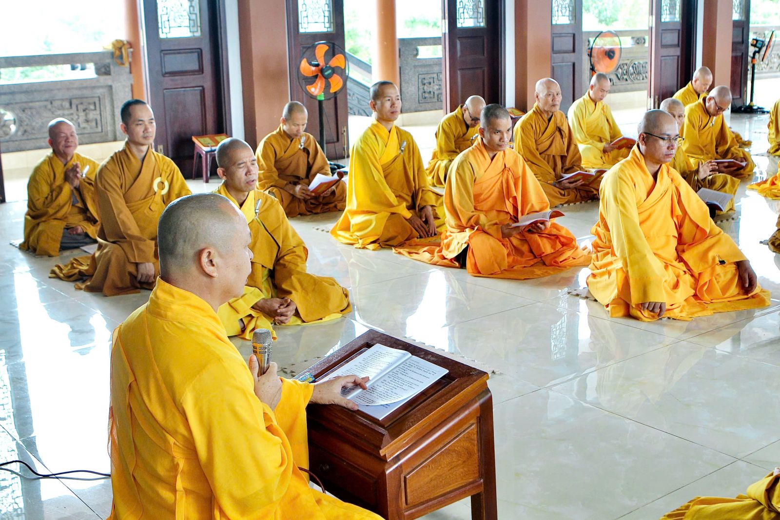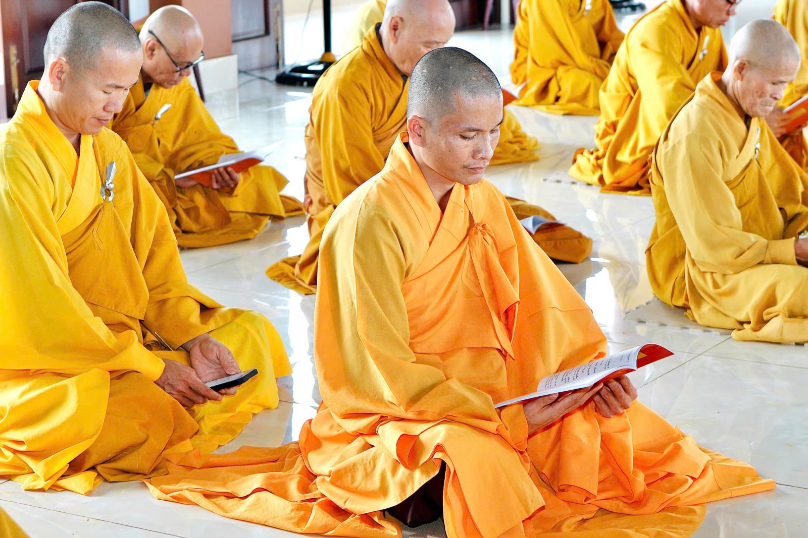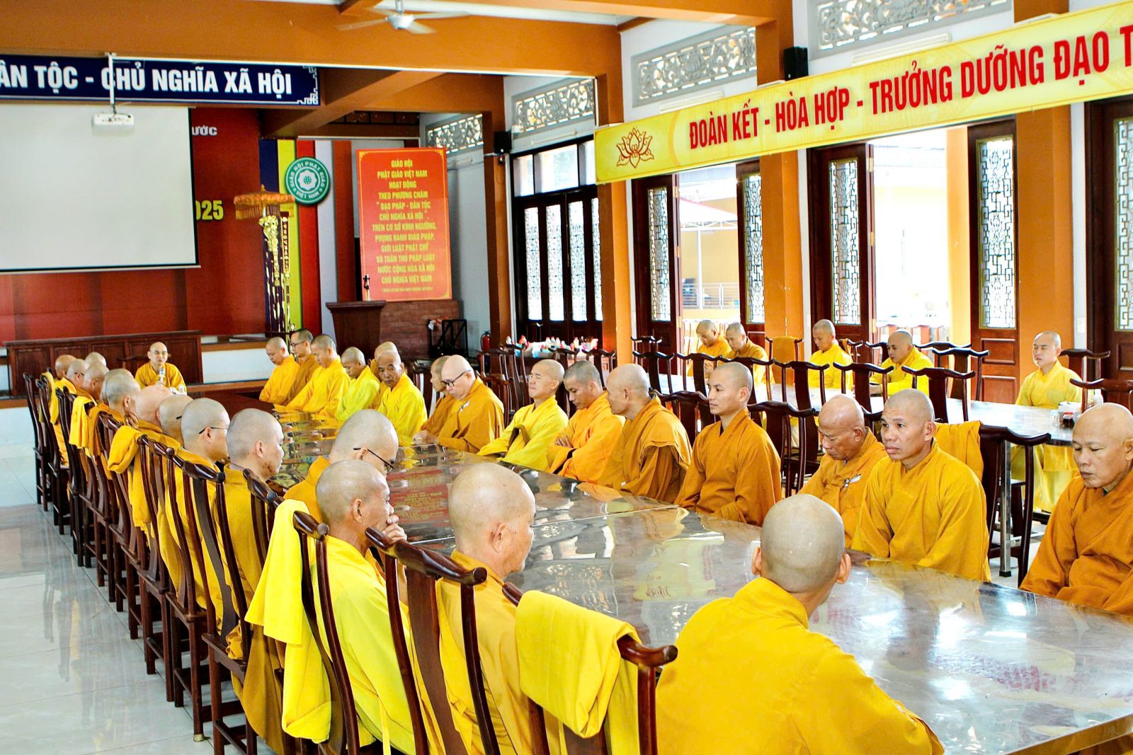Sau buổi sinh hoạt Tăng sự, chư Tôn đức vân tập về đại hùng bảo điện đảnh lễ Tam bảo và tác pháp yết ma tụng giới.