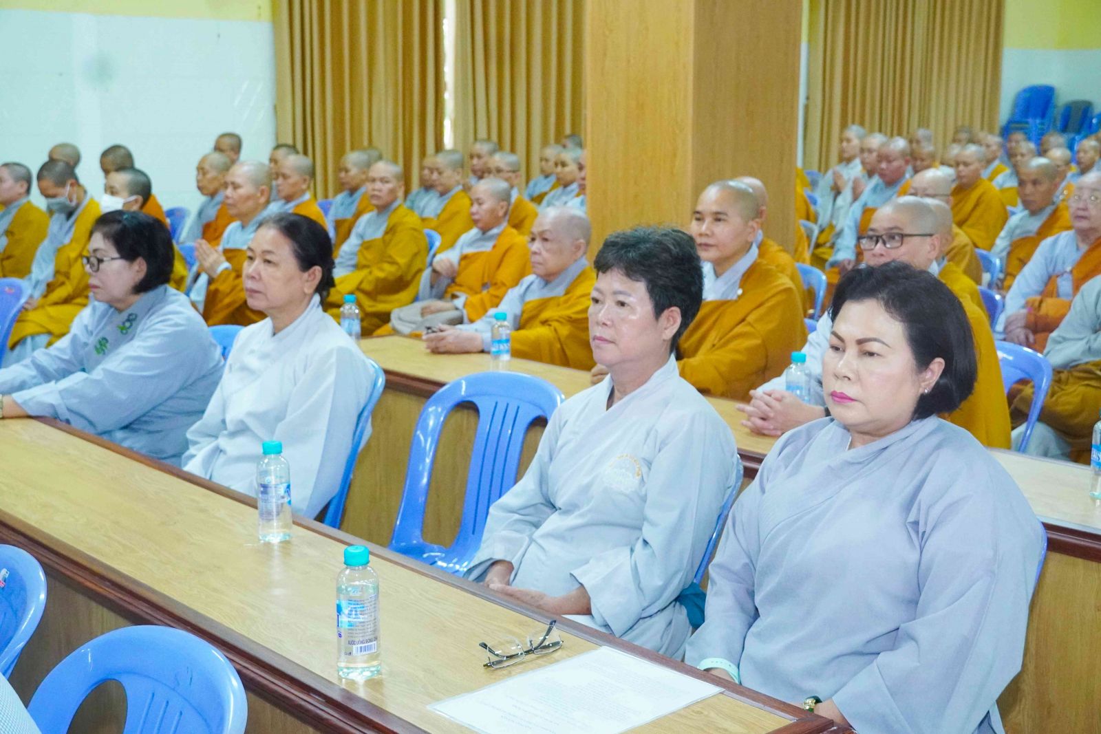 Cuối cùng, buổi lễ trang nghiêm lắng nghe lời sách tấn của HT. Thích Thiện Đạo – Thành viên HĐCM, Chứng minh Ban Trị sự GHPGVN tỉnh. Hòa thượng chỉ dạy rằng: Ba tháng an cư kiết hạ có ý nghĩa rất lớn đối với hàng xuất gia lẫn tại gia. Đó là thời điểm chư Tăng Ni dành trọn thời gian cho việc tu học, thúc liễm thân tâm, trau giồi Giới-Định-Tuệ, đồng thời đây cũng là cơ hội cho hàng Phật tử tại gia phát tâm gieo trồng ruộng phước thông qua việc cúng dường, ngoại hộ, tạo điều kiện thuận lợi cho chư Tăng Ni an cư tu học. An cư kiết hạ cũng là hoạt động củng cố và duy trì nguồn nội lực sau những ngày tháng dấn thân phụng sự đạo pháp, phụng sự chúng sinh. Trong những tháng ngày cấm túc an cư, chư Tăng Ni chẳng những được bồi dưỡng, phát triển trình độ tu học Phật pháp, tăng trưởng công đức, giới hạnh, đạo lực, mà còn có dịp thực hành đời sống tập thể theo tinh thần lục hòa, có cơ hội trao đổi sẻ chia những kiến giải, kinh nghiệm tu hành, đồng thời thể hiện tình huynh đệ, tinh thần hòa hợp như nước với sữa.