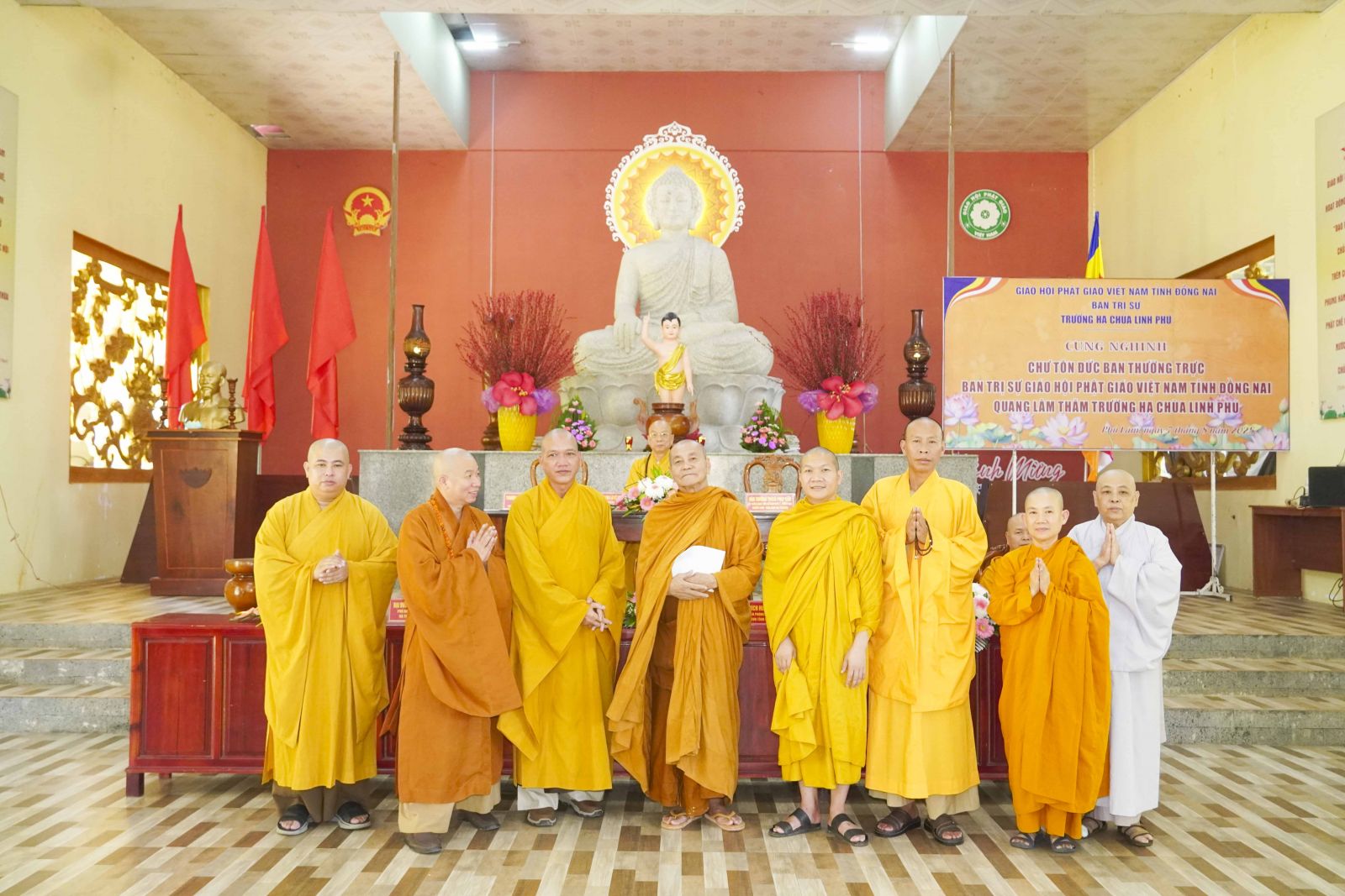 Tiếp đoàn đến thăm có HT. Thích Pháp Cần - Ủy viên Ban Trị sự GHPGVN tỉnh, Trưởng Ban Tổ chức, Thiền chủ kiêm Hóa chủ Hạ trường; ĐĐ. Thích Nguyên Trung – Phó Ban Tổ chức, Chánh na Hạ trường; NS. Thích nữ Hạnh Liên - Ủy viên Ban Trị sự GHPGVN tỉnh, Ủy viên Ban Tổ chức, Giáo thọ Hạ trường Ni; NS. Thích nữ Như Phương – Đặc trách Ni giới Hạ trường; cùng chư Tôn đức Ban Tổ chức, Tăng Ni hành giả An cư tại Hạ trường Chùa Linh Phú.