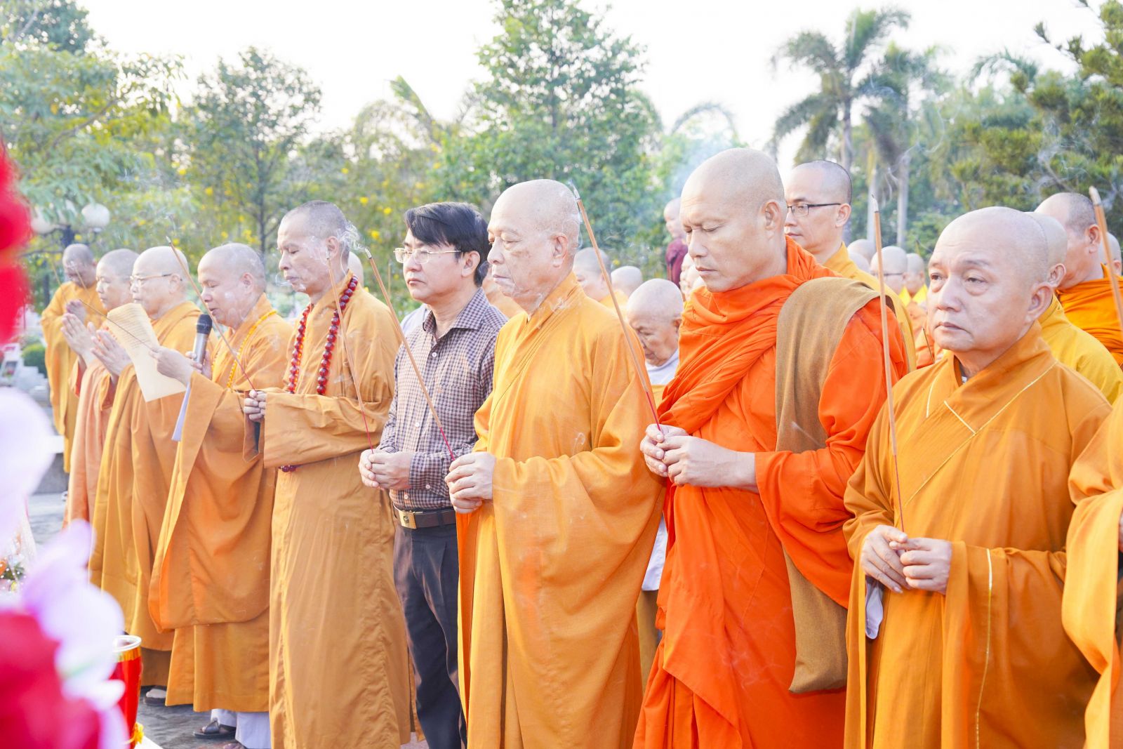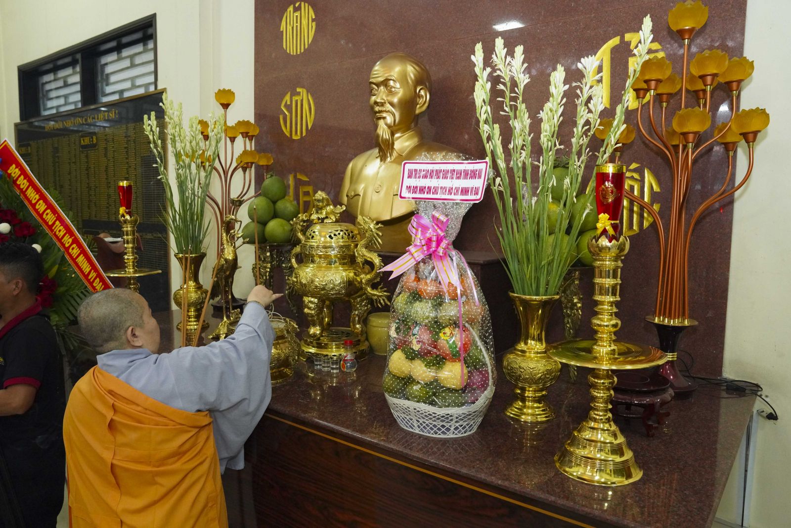 Tiếp đó, Ban Trị sự đã trang nghiêm cử hành nghi thức dâng hương tưởng niệm Chủ tịch Hồ Chí Minh – vị lãnh tụ vĩ đại của dân tộc Việt Nam, người đã cống hiến trọn đời mình cho sự nghiệp cách mạng, vì độc lập dân tộc và hạnh phúc của nhân dân. Trước anh linh của Người, chư Tôn đức và toàn thể đại chúng nhất tâm cầu nguyện quốc thái dân an, thế giới hòa bình, chúng sinh an lạc.