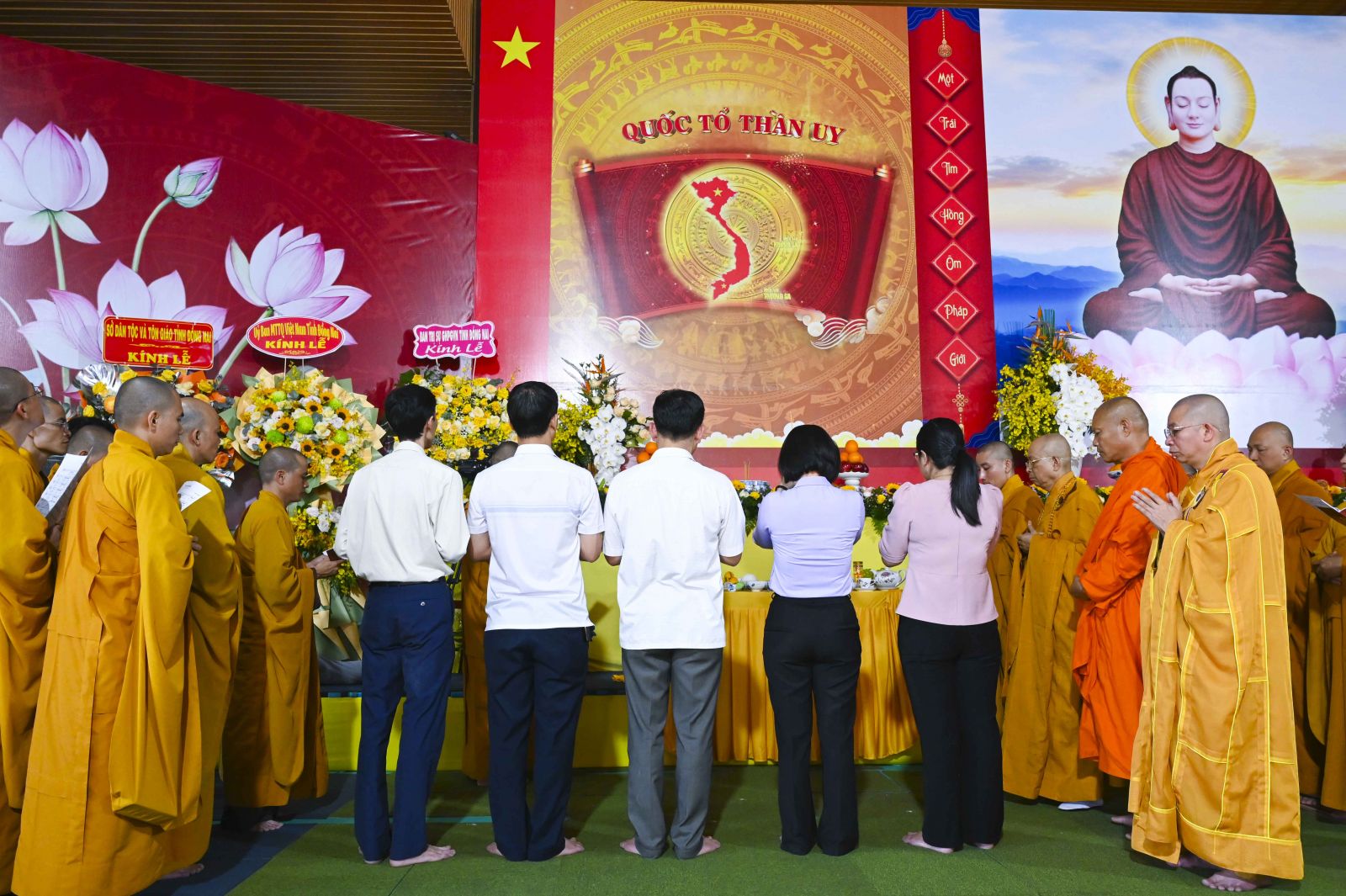 Mở đầu buổi lễ là nghi thức chào cờ Quốc kỳ, Đạo kỳ và tưởng niệm. Tiếp đó, chư Tôn đức cử hành nghi thức dâng hương tưởng niệm Quốc Tổ trong niềm tri ân sâu sắc đối với các bậc tiền nhân đã có công dựng nước và giữ nước. Đây không chỉ là nghi lễ mang ý nghĩa tâm linh mà còn thể hiện truyền thống “uống nước nhớ nguồn”, kết nối đạo pháp với dân tộc trong dòng chảy lịch sử lâu dài.