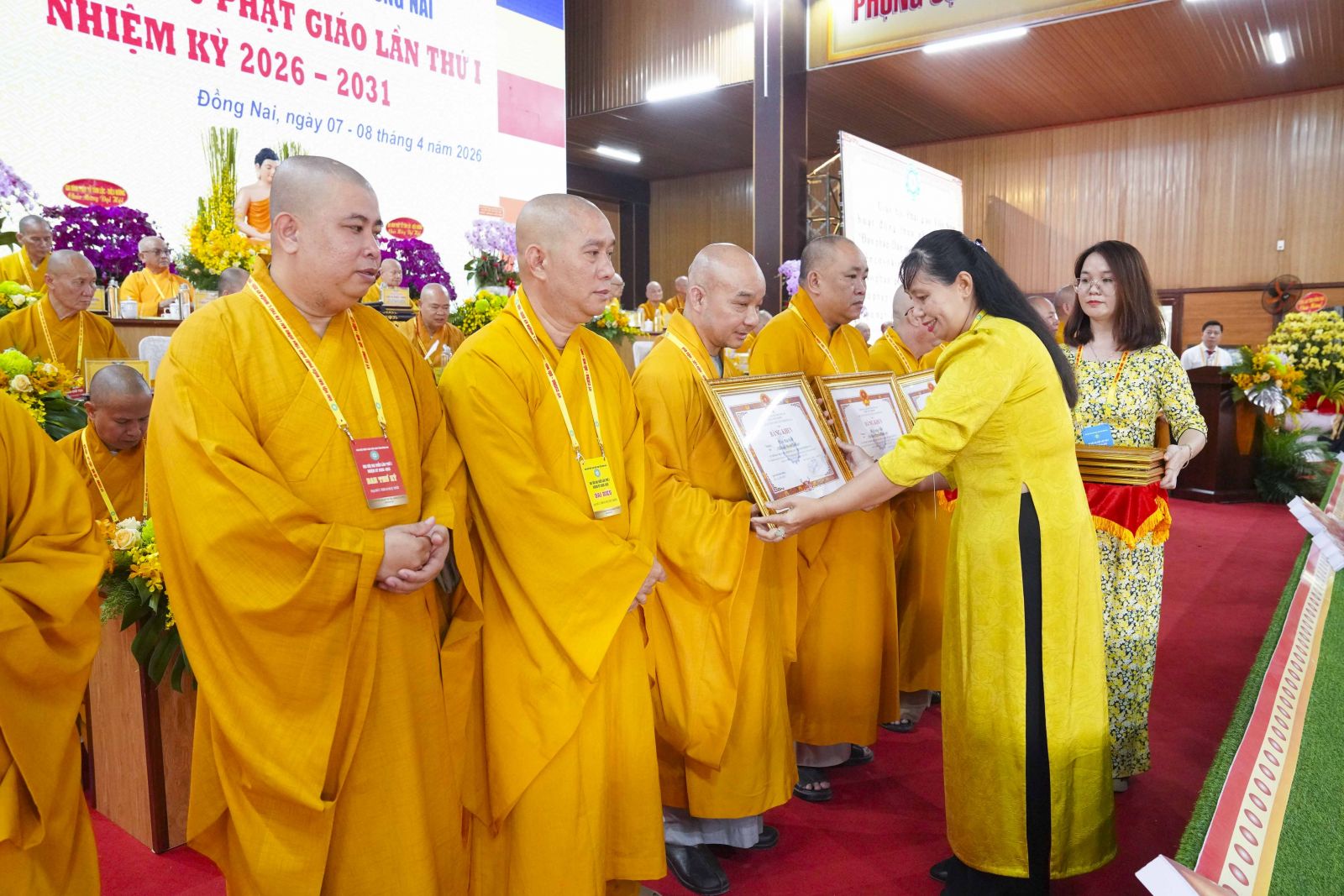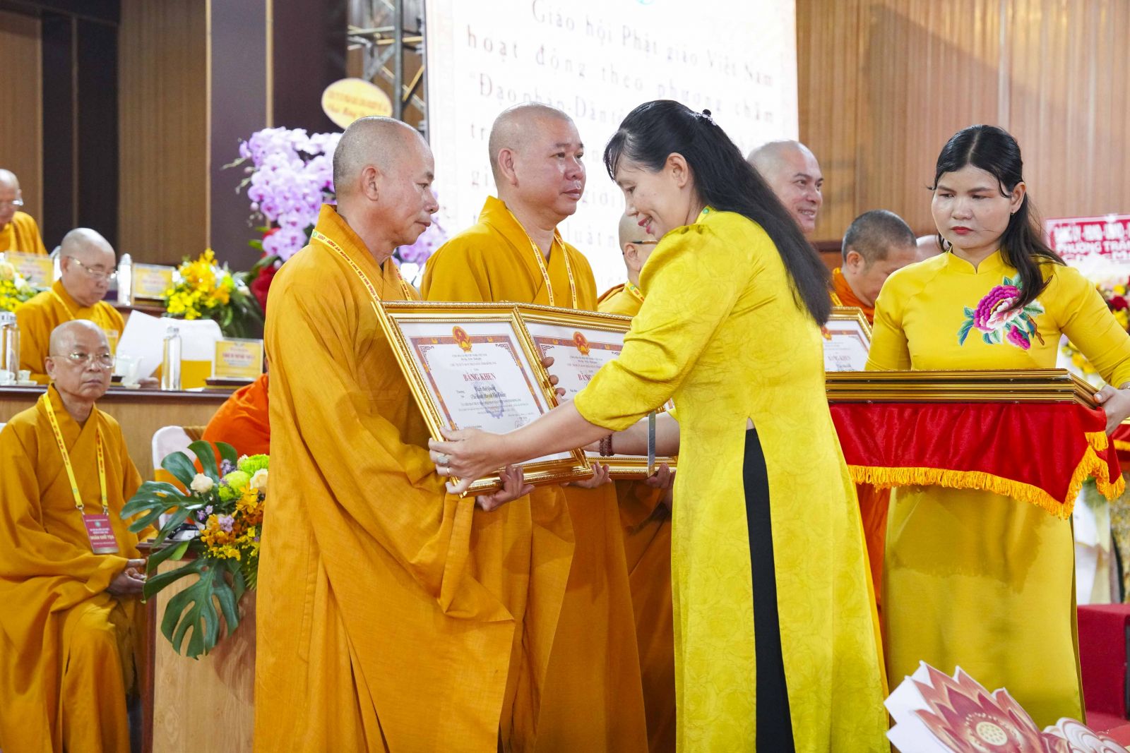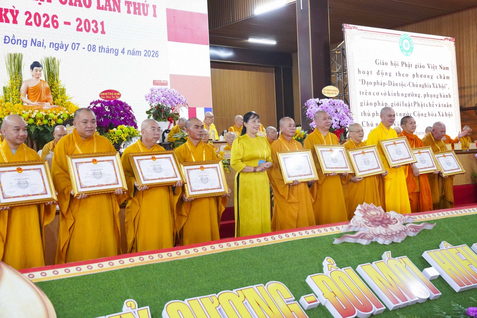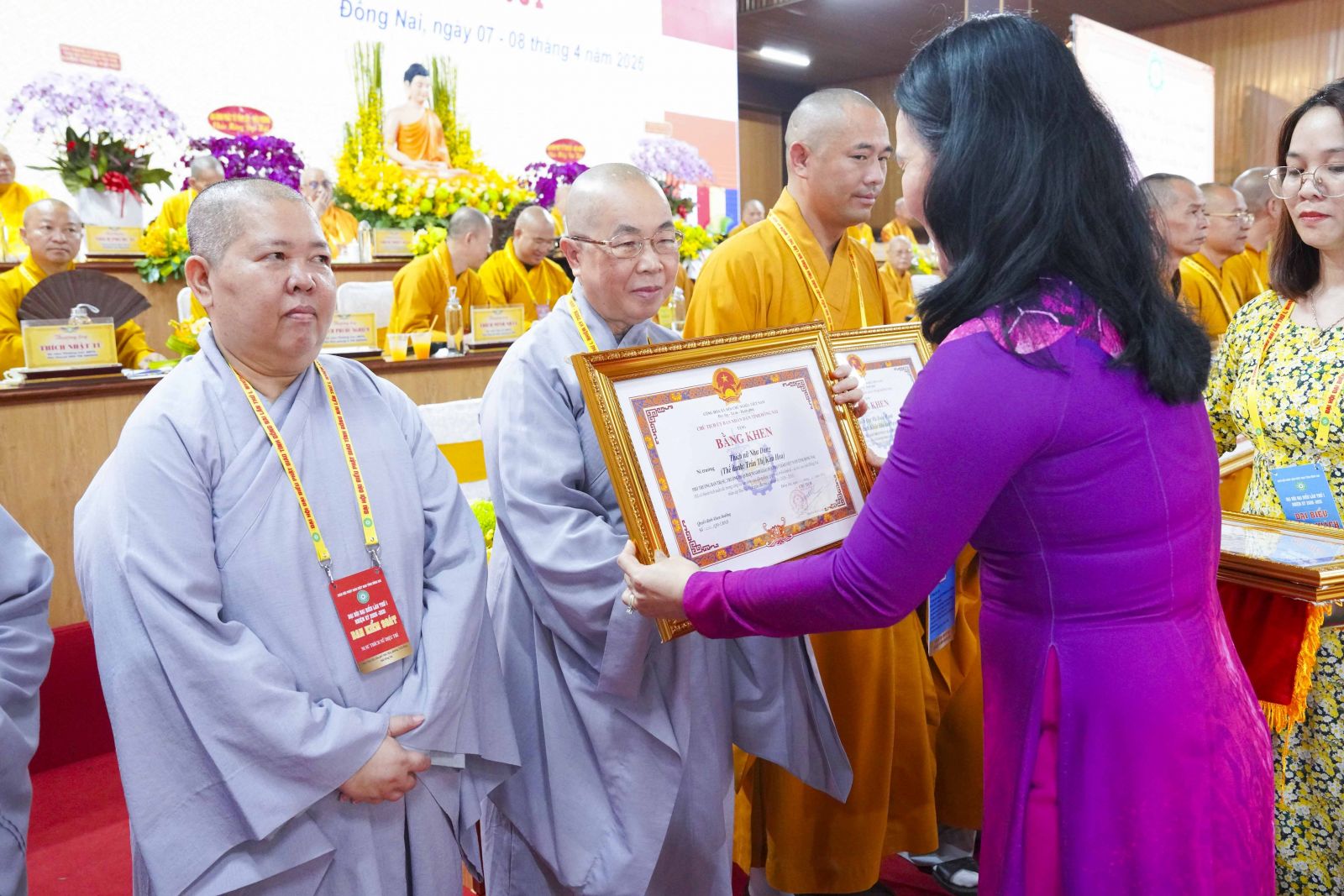 Tiếp đó, Đại đức Thích Thiện Trí thay mặt Ban Tổ chức thông qua báo cáo tóm tắt kết quả ngày làm việc thứ nhất và Lễ kỷ niệm 45 năm thành lập Giáo hội Phật giáo Việt Nam; đồng thời tiến hành trao Bằng Tuyên dương công đức của Trung ương Giáo hội cho 25 cá nhân có nhiều đóng góp tích cực, cùng Bằng khen của Ủy ban nhân dân tỉnh Đồng Nai.