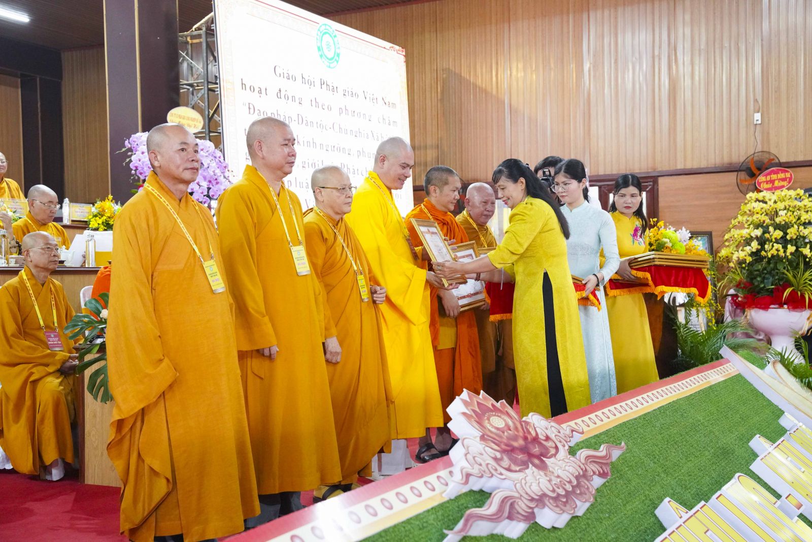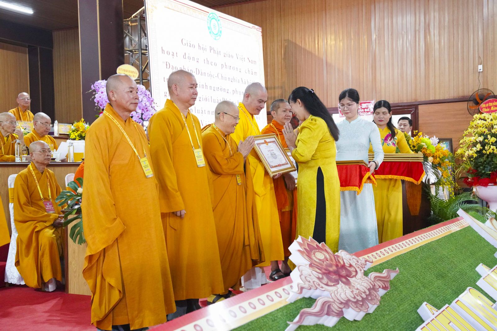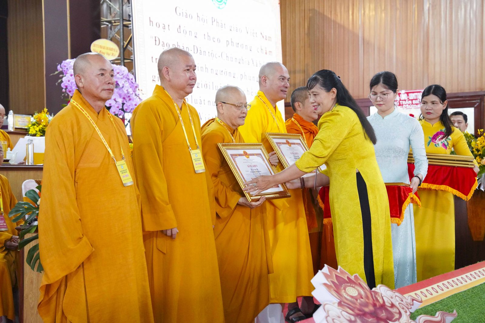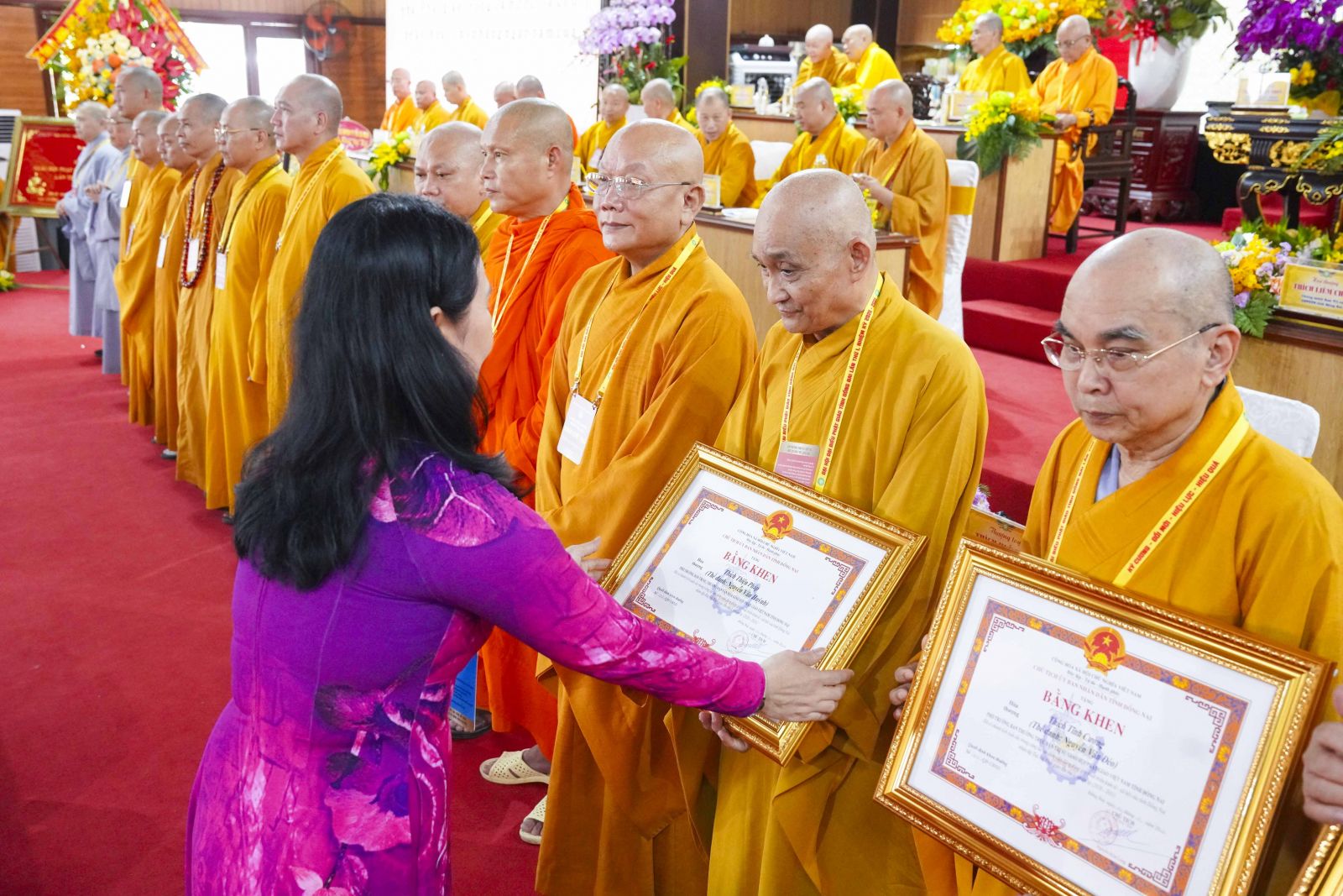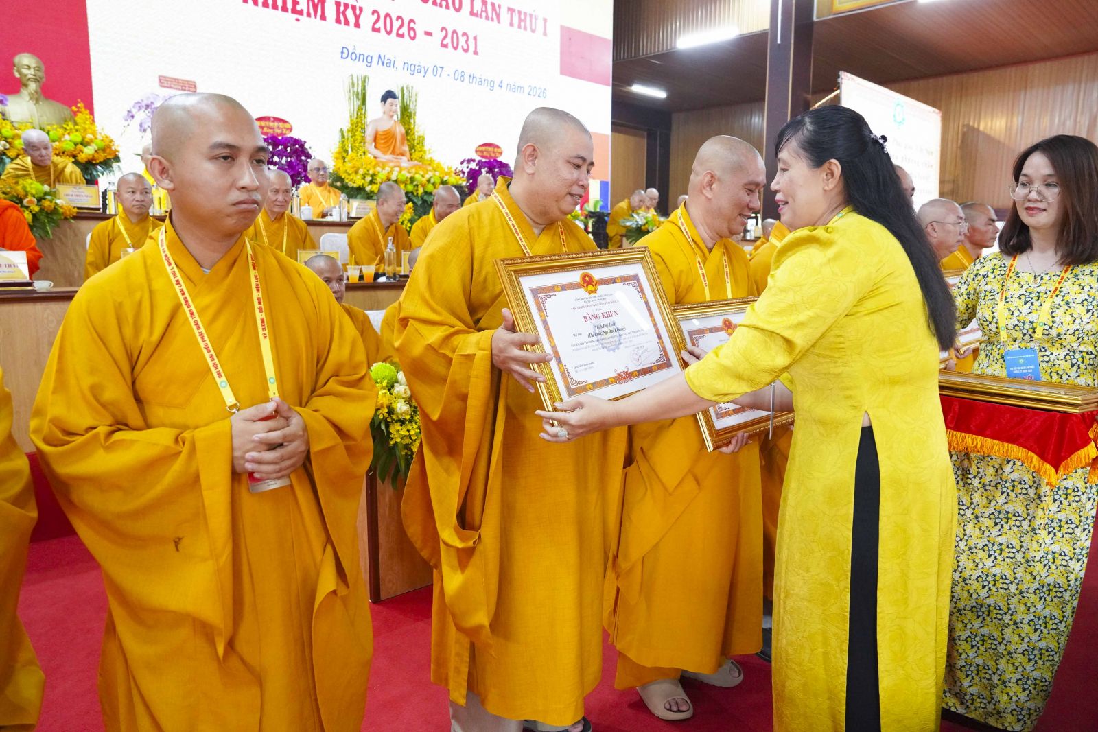 Tiếp đó, Đại đức Thích Thiện Trí thay mặt Ban Tổ chức thông qua báo cáo tóm tắt kết quả ngày làm việc thứ nhất và Lễ kỷ niệm 45 năm thành lập Giáo hội Phật giáo Việt Nam; đồng thời tiến hành trao Bằng Tuyên dương công đức của Trung ương Giáo hội cho 25 cá nhân có nhiều đóng góp tích cực, cùng Bằng khen của Ủy ban nhân dân tỉnh Đồng Nai.