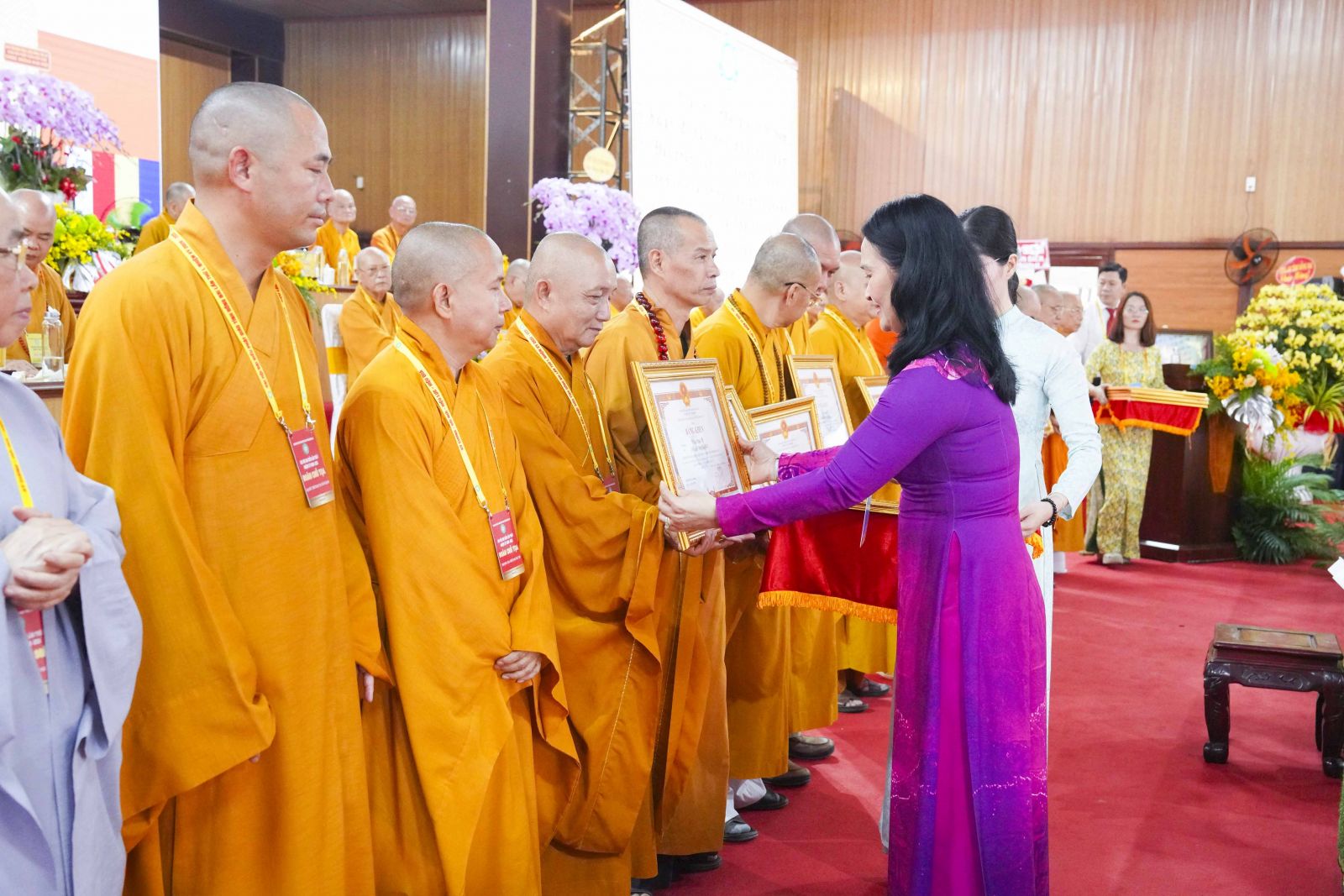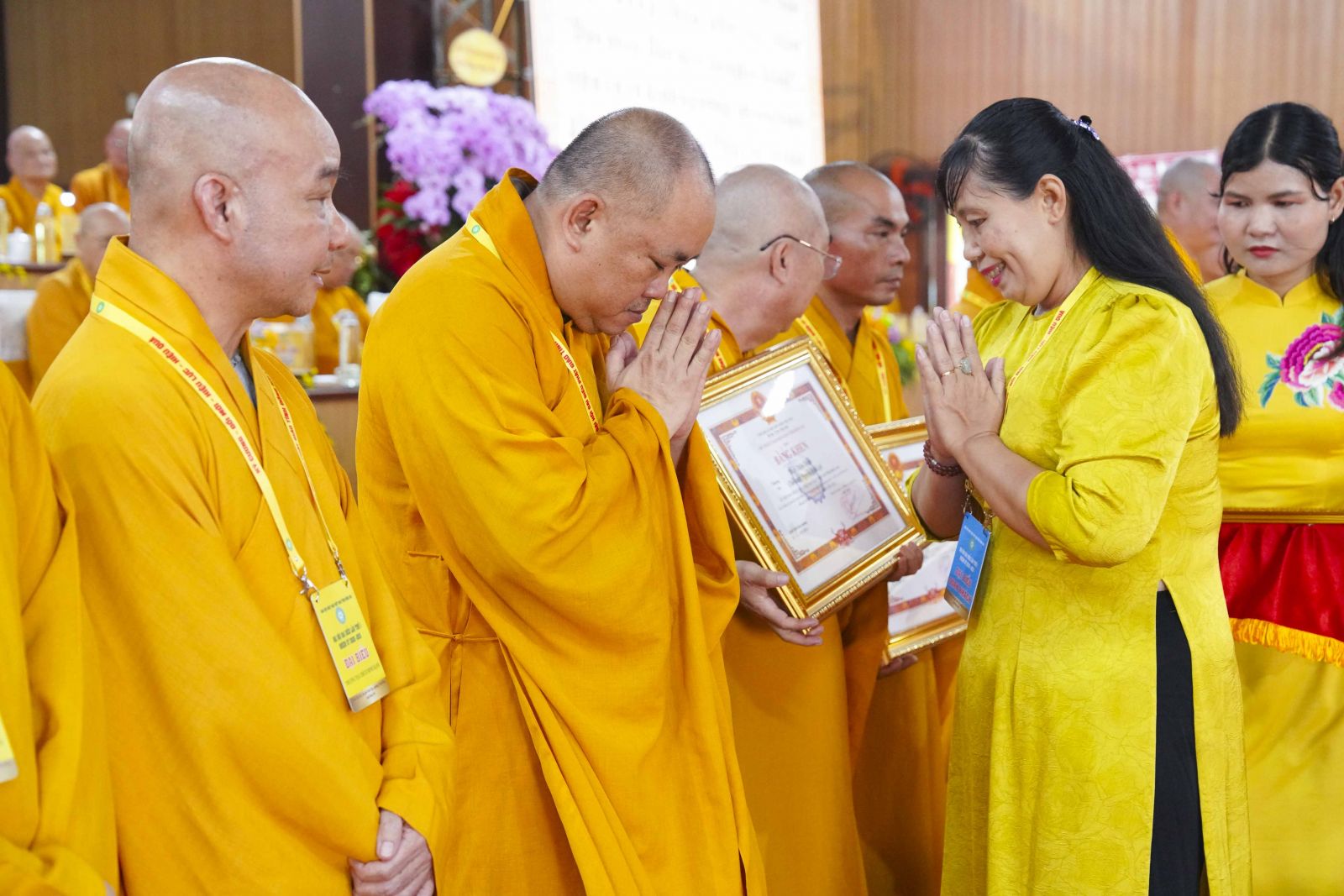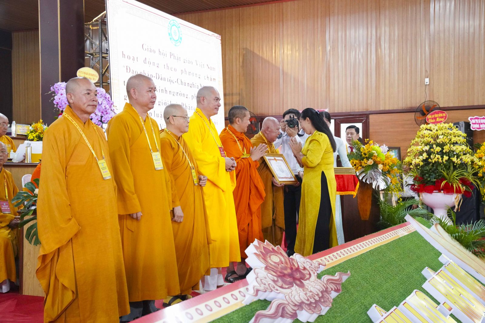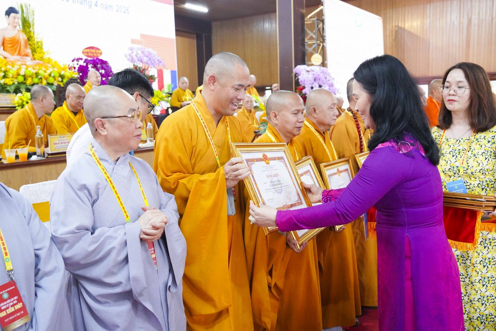 Tiếp đó, Đại đức Thích Thiện Trí thay mặt Ban Tổ chức thông qua báo cáo tóm tắt kết quả ngày làm việc thứ nhất và Lễ kỷ niệm 45 năm thành lập Giáo hội Phật giáo Việt Nam; đồng thời tiến hành trao Bằng Tuyên dương công đức của Trung ương Giáo hội cho 25 cá nhân có nhiều đóng góp tích cực, cùng Bằng khen của Ủy ban nhân dân tỉnh Đồng Nai.