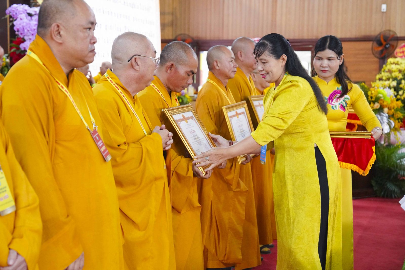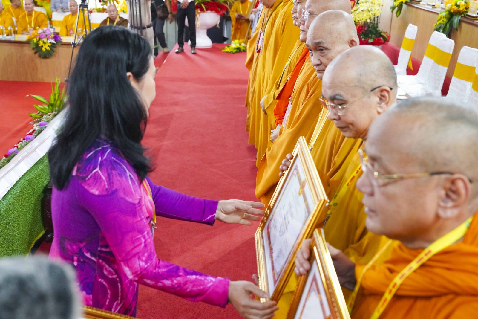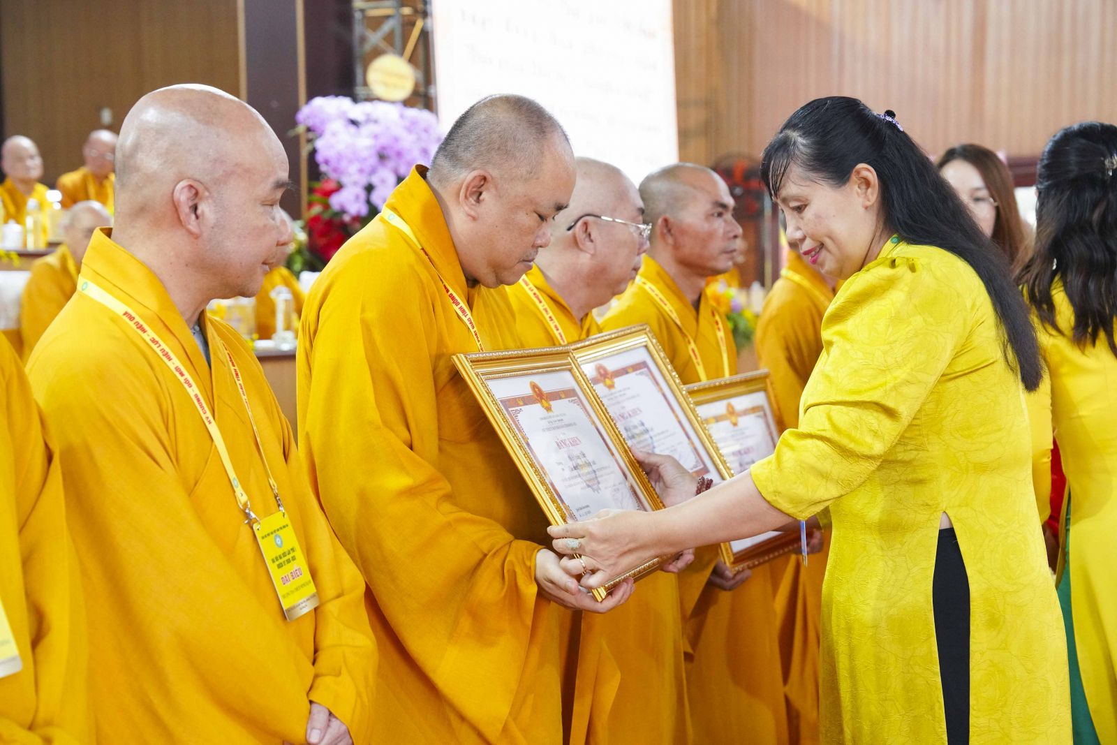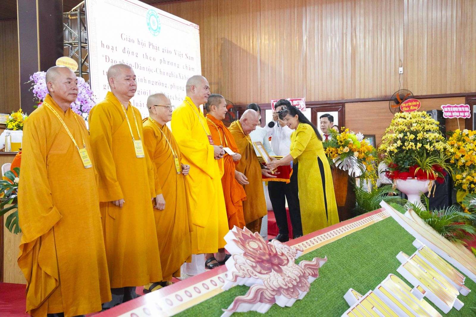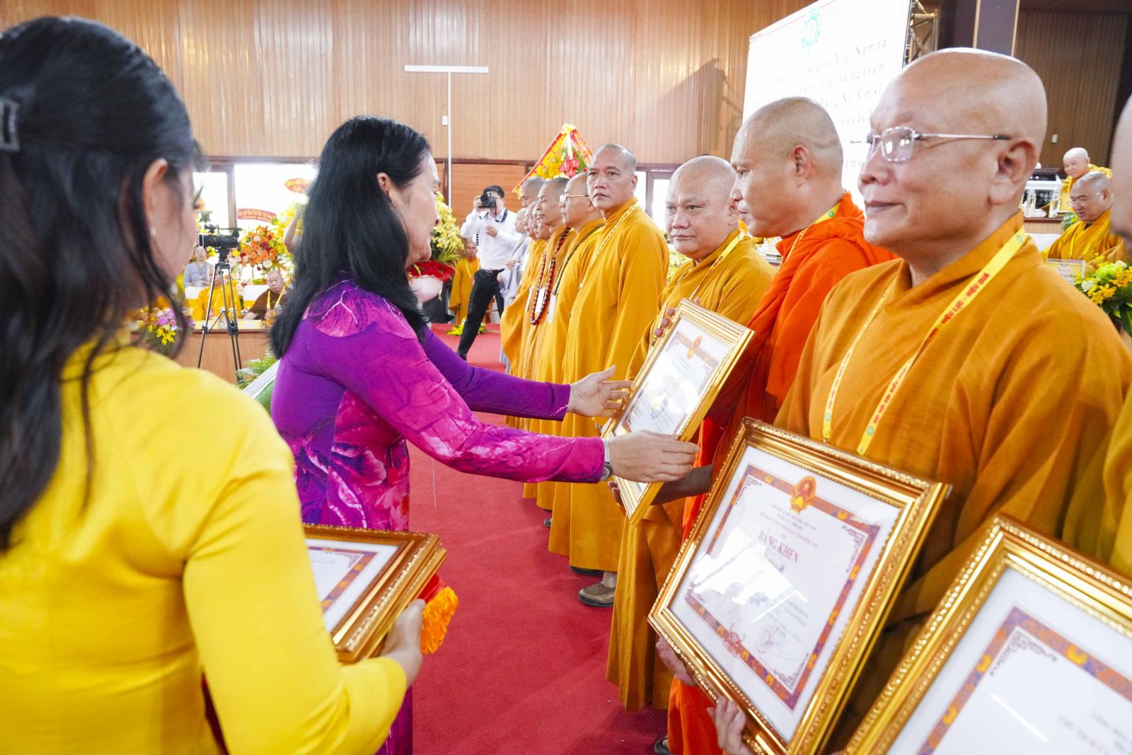 Tiếp đó, Đại đức Thích Thiện Trí thay mặt Ban Tổ chức thông qua báo cáo tóm tắt kết quả ngày làm việc thứ nhất và Lễ kỷ niệm 45 năm thành lập Giáo hội Phật giáo Việt Nam; đồng thời tiến hành trao Bằng Tuyên dương công đức của Trung ương Giáo hội cho 25 cá nhân có nhiều đóng góp tích cực, cùng Bằng khen của Ủy ban nhân dân tỉnh Đồng Nai.