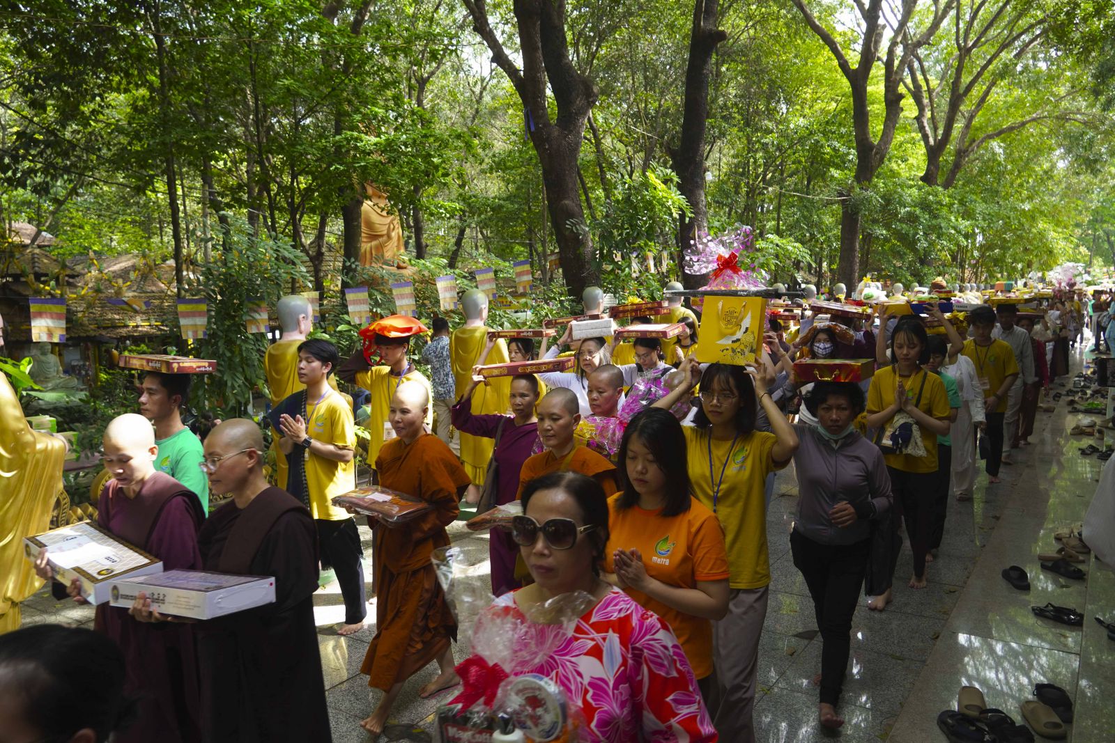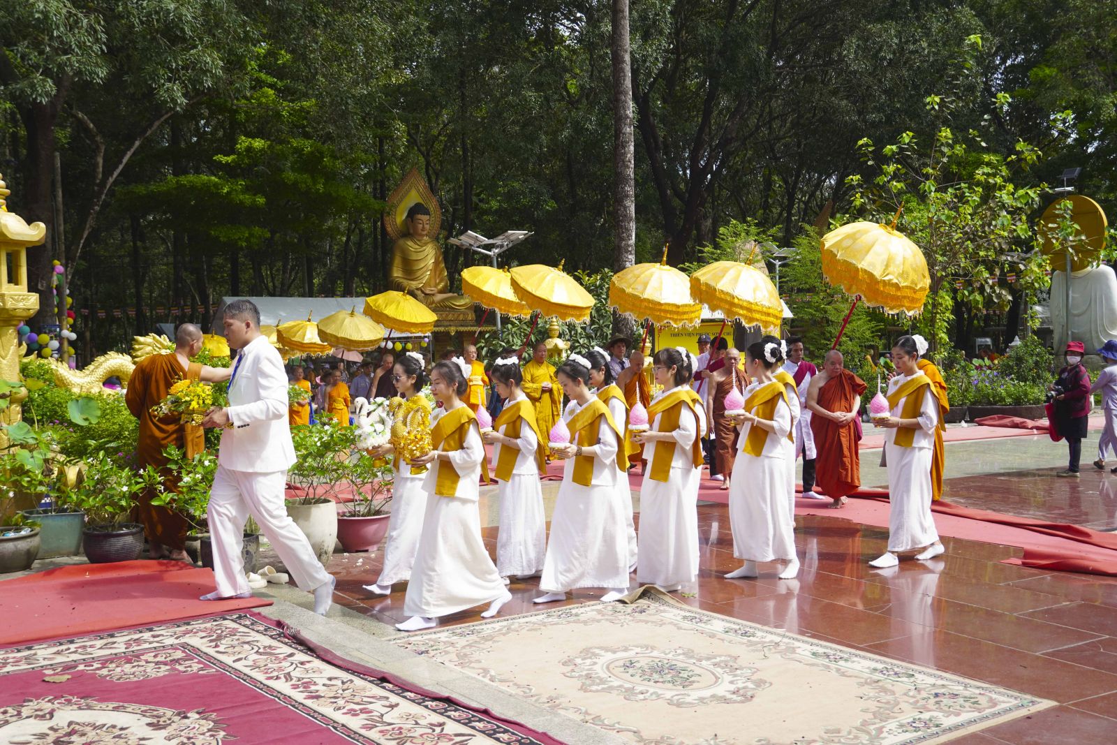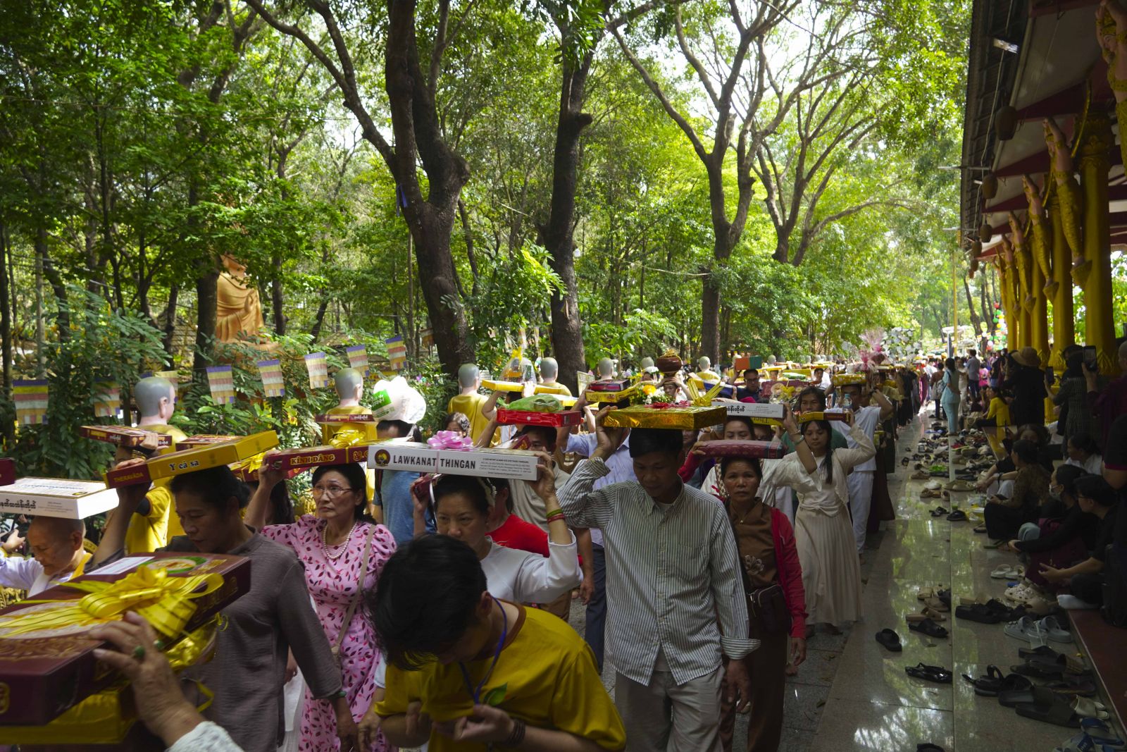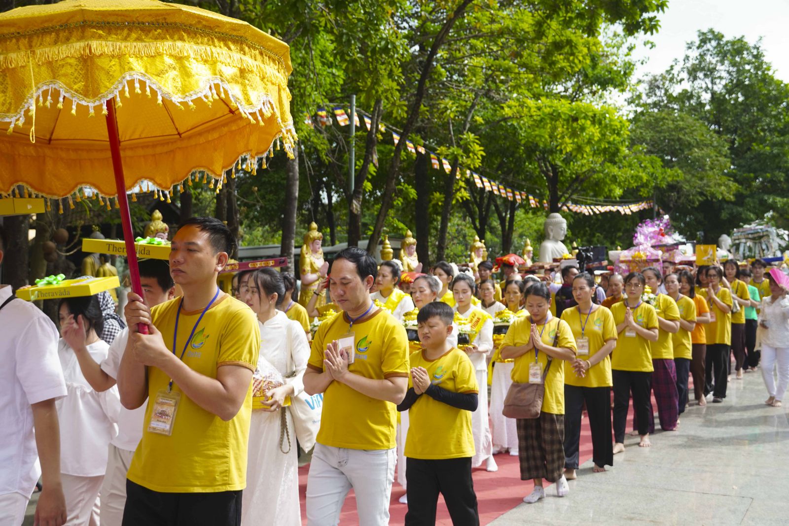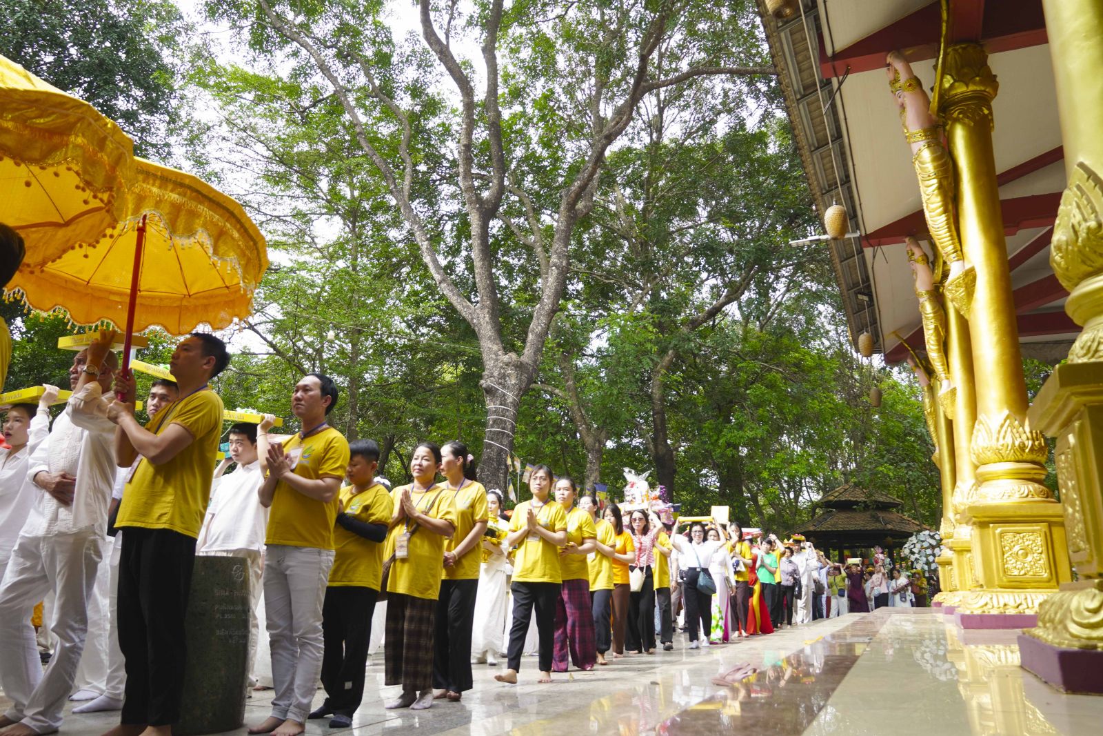 Sau thời pháp thoại, tất cả mọi người cùng thực hiện nghi thức nhiễu Phật ba vòng quanh ngôi chánh điện và cùng đồng tụng bài kệ “Ca-sa dâng y”. Đây là nghi thức vô cùng thiêng liêng đối với Phật giáo Nam Tông, nghi thức này mang ý nghĩa giúp cho mỗi vị hành giả cũng như Phật tử bày tỏ tấm lòng cung kính đối với ba ngôi Tam bảo, tịnh hoá được nghiệp chướng (tham, sân, si) và ba đường ác (súc sanh, ngạ quỷ, địa ngục). Nghi thức này cũng giúp cho quý Phật tử trước khi thỉnh cầu hoặc dâng y sẽ đón nhận một nguồn năng lượng tích cực, nhiếp tâm đến phát nguyện của chính bản thân và trưởng dưỡng tâm linh một cách mạnh mẽ.