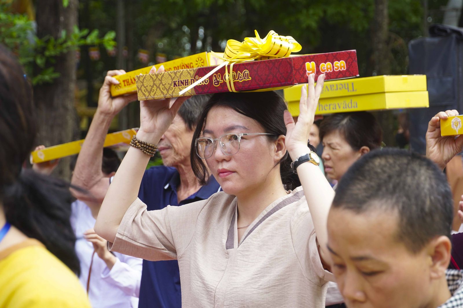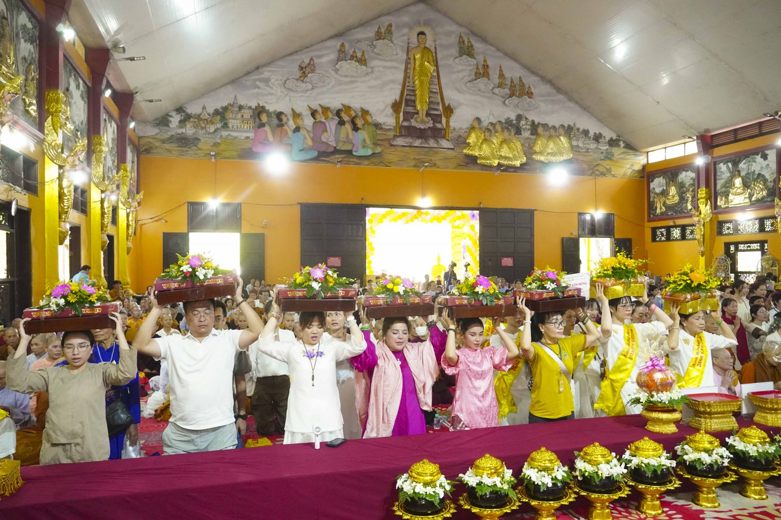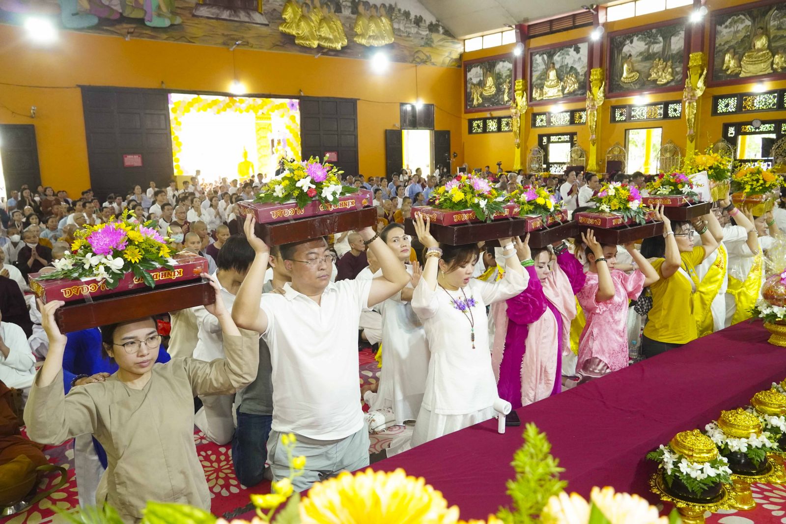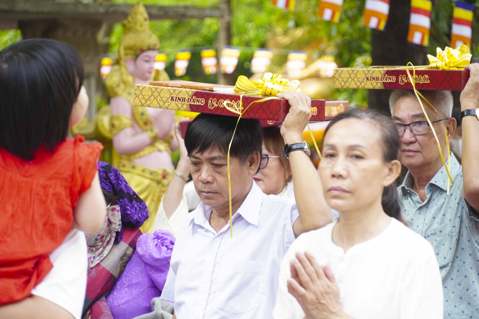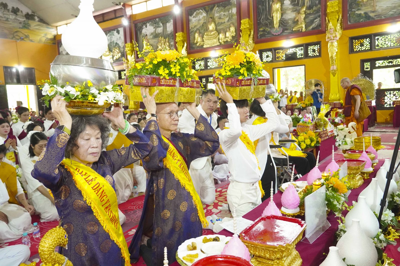 Đại diện tín chủ cũng thực hiện nghi thức tác bạch cúng dường, dâng y đến chư Tăng.
