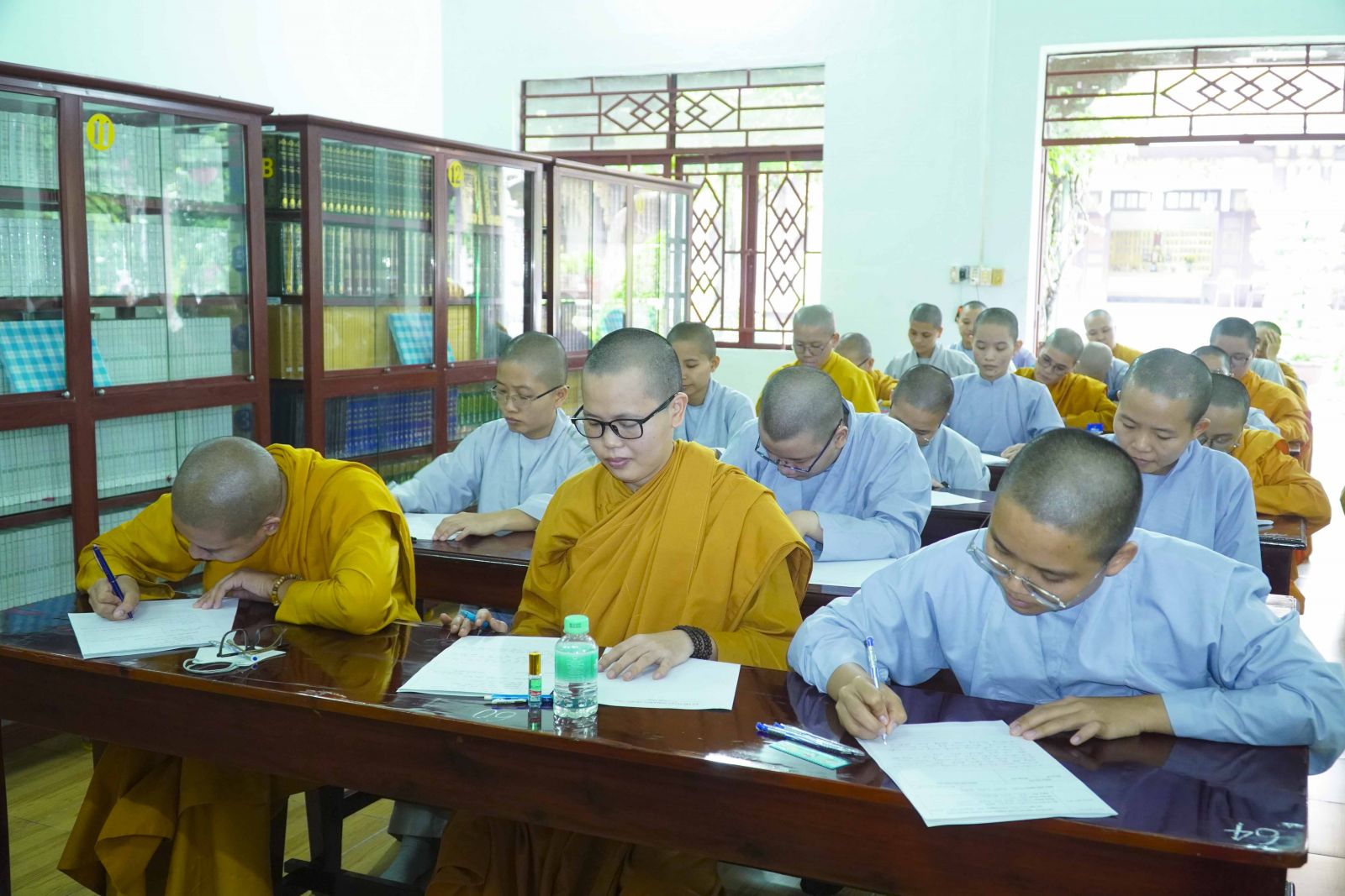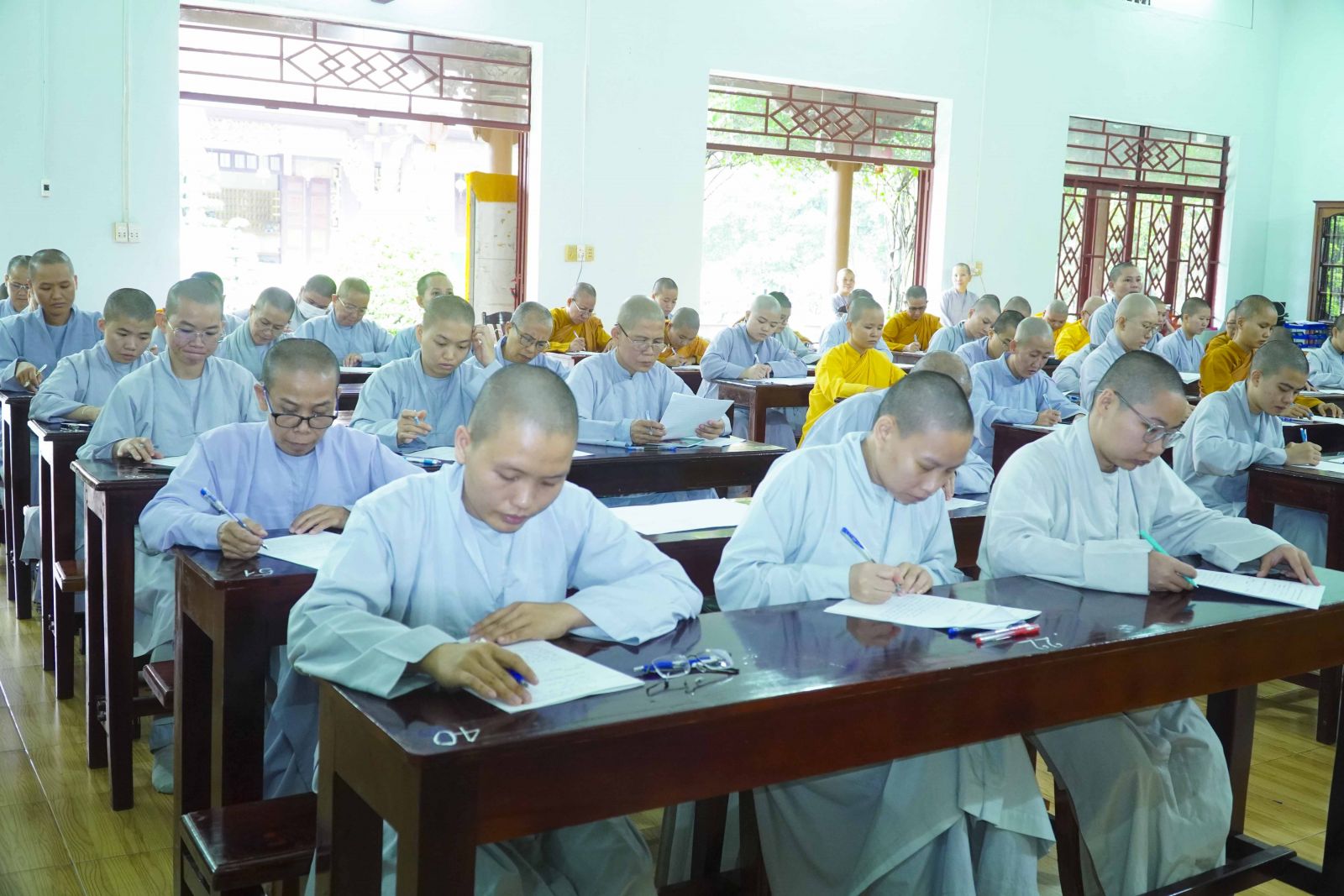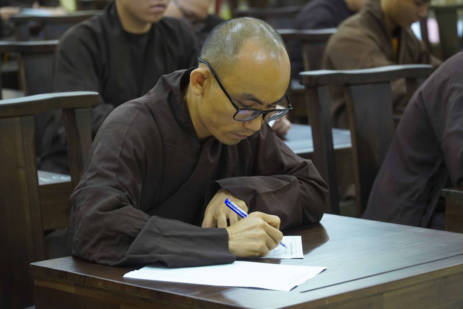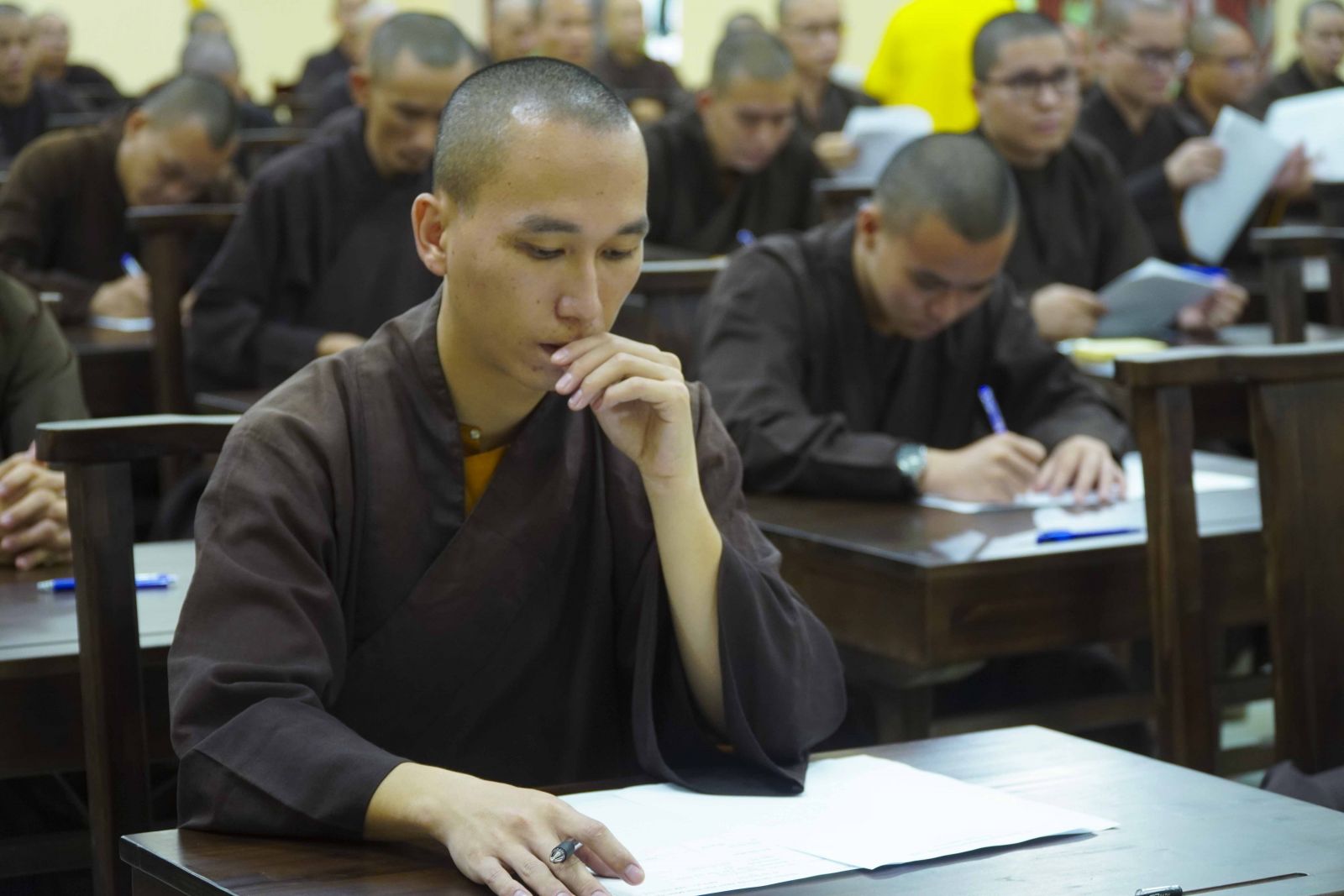 Sau lời Đạo từ của Hòa thượng Chứng minh, Tăng Ni sinh đã bước vào môn thi đầu tiên là Phật Pháp Căn Bản – thời gian: 90 phút và môn thi: Việt Văn – 90 phút.