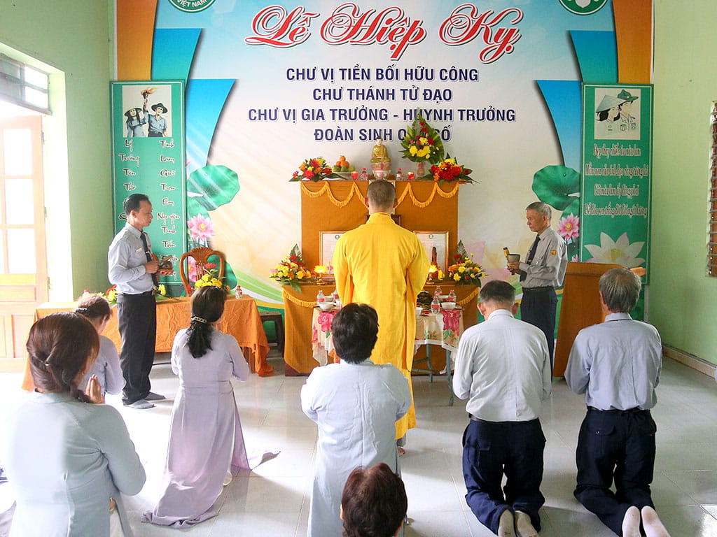 Trong không khí trang nghiêm và ấm áp tình lam, buổi lễ diễn ra với đầy đủ nghi thức truyền thống, thể hiện tinh thần đoàn kết, tinh tấn tu học và sinh hoạt của Gia đình Phật tử.