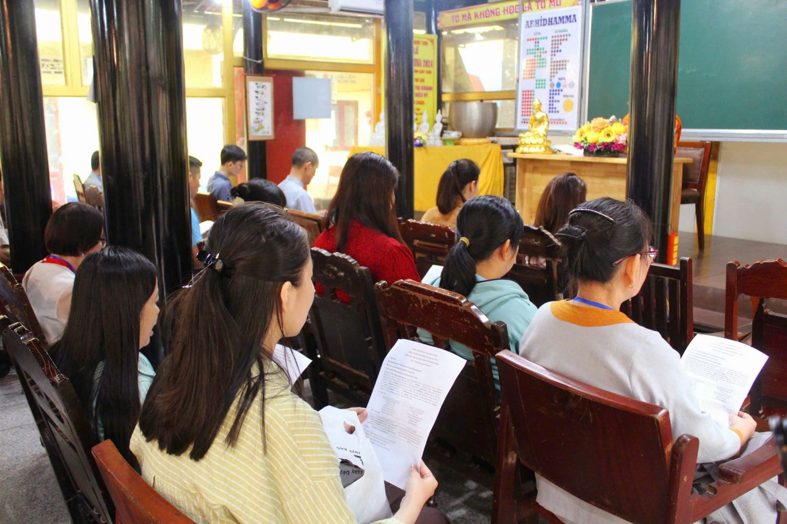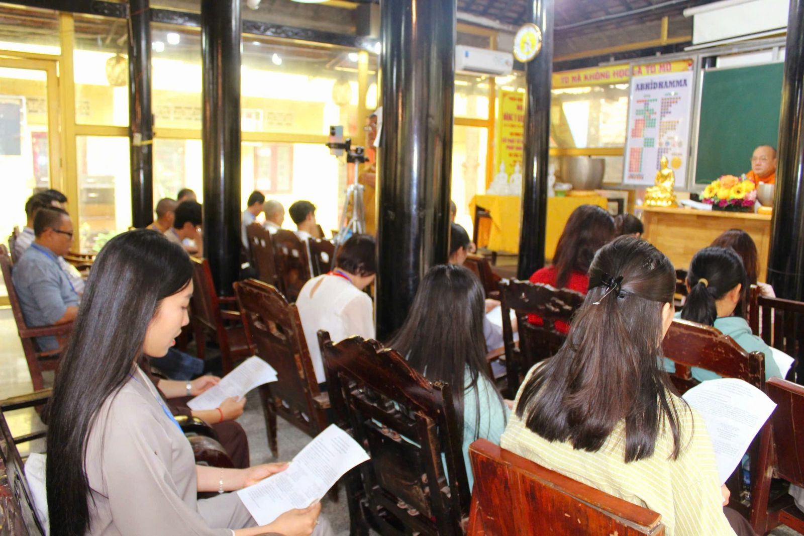Buổi chiều, đại lao hòa thượng trụ trì, đại đức Thích Phước Trí hướng dẫn khóa sinh tụng kinh Pháp Cú phẩm An Lạc. Đại đức hướng dẫn và chia sẻ đề tài làm sao có An Lạc, thông qua những bước căn bản: thực hành giới đức, kiểm soát tâm, sống tỉnh thức, buông bỏ, từ bi và hỷ xả.