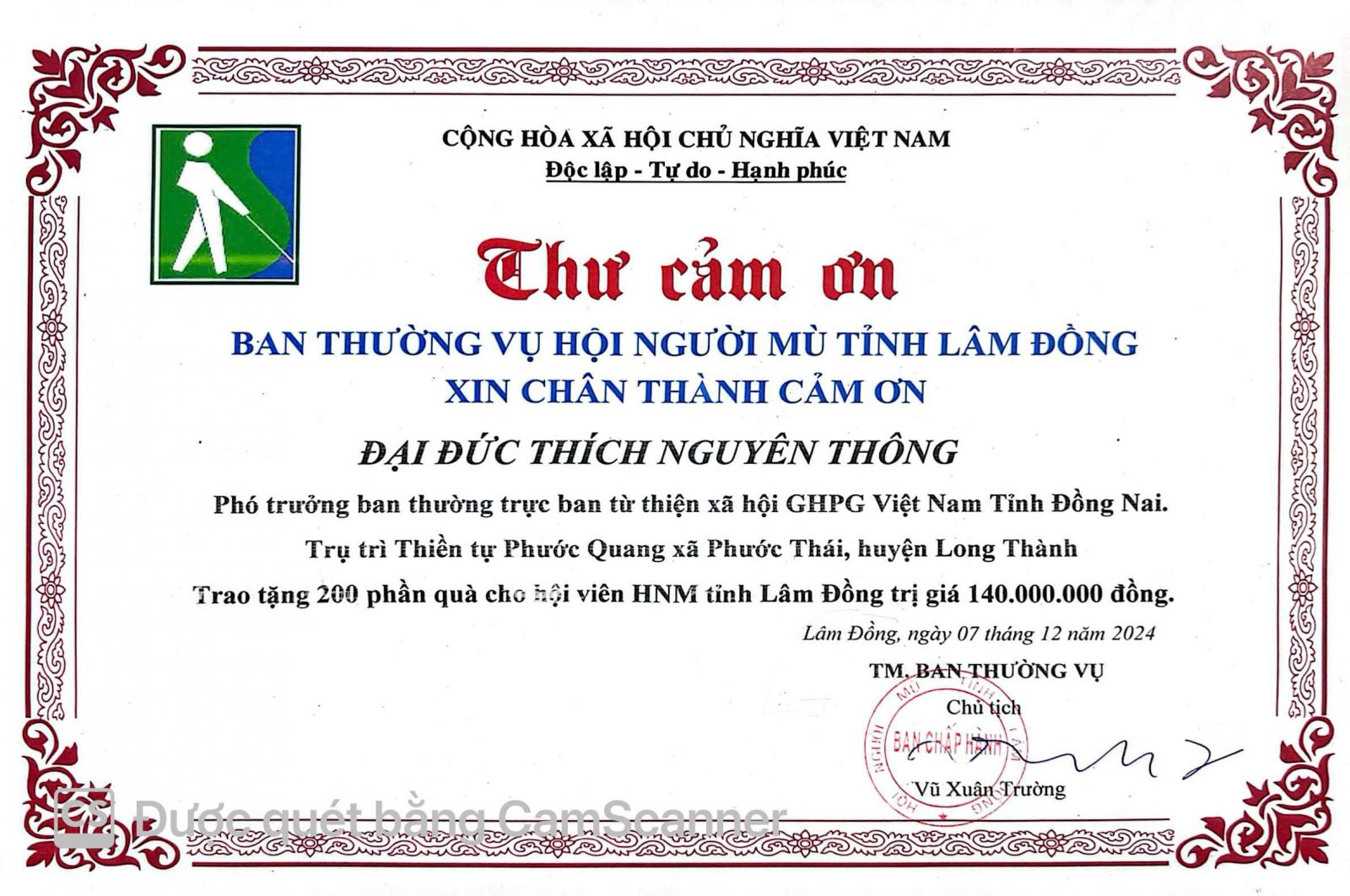 Đoàn đến thăm hỏi, trao tặng 200 phần quà động viên tinh thần đối với Hội người mù tại Tp. Đà Lạt, mỗi phần quà bao gồm các nhu yếu phẩm như: Gạo, mì, đường, nước tương, nước mắm, bánh tây, bột ngọt, giày dép, áo quần, dầu xanh, kẹo sữa, muối và 1 phong bì 130 ngàn đồng.
