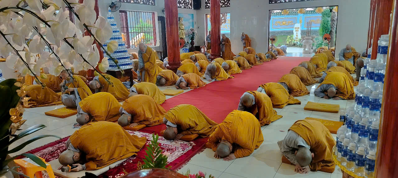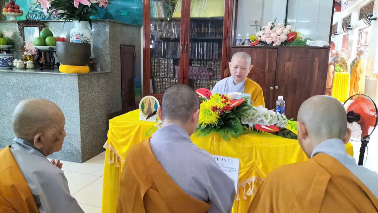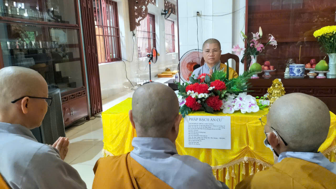 Sau nghi thức niêm hương bạch Phật tác pháp Yết Ma. NS Thích Nữ Tuệ Minh đại diện ban chức sự trường hạ Ni đối trước Đại Tăng thỉnh cầu giáo giới cho Ni chúng.