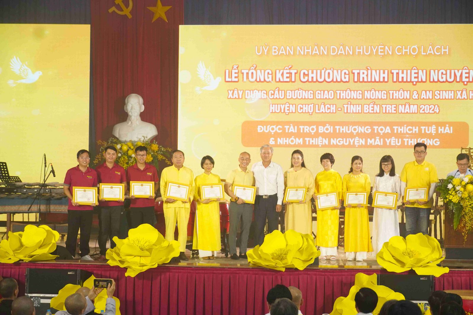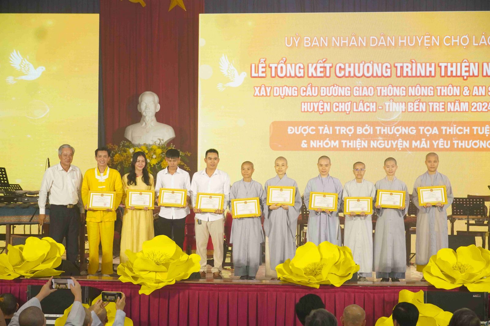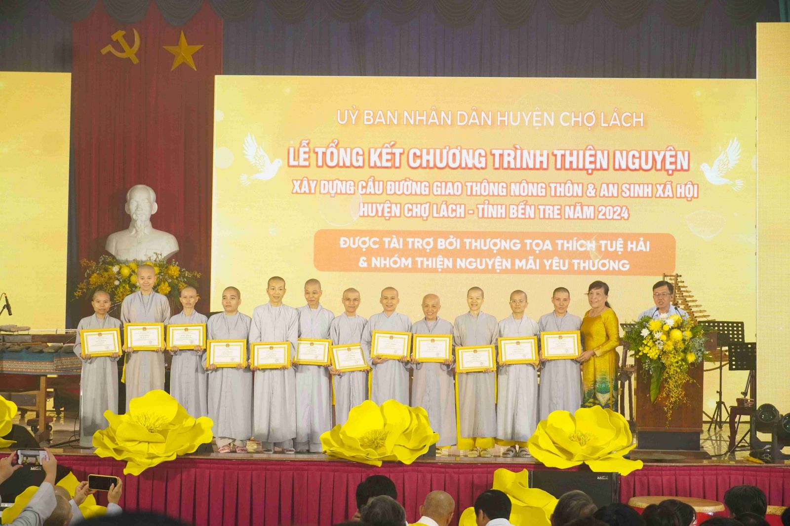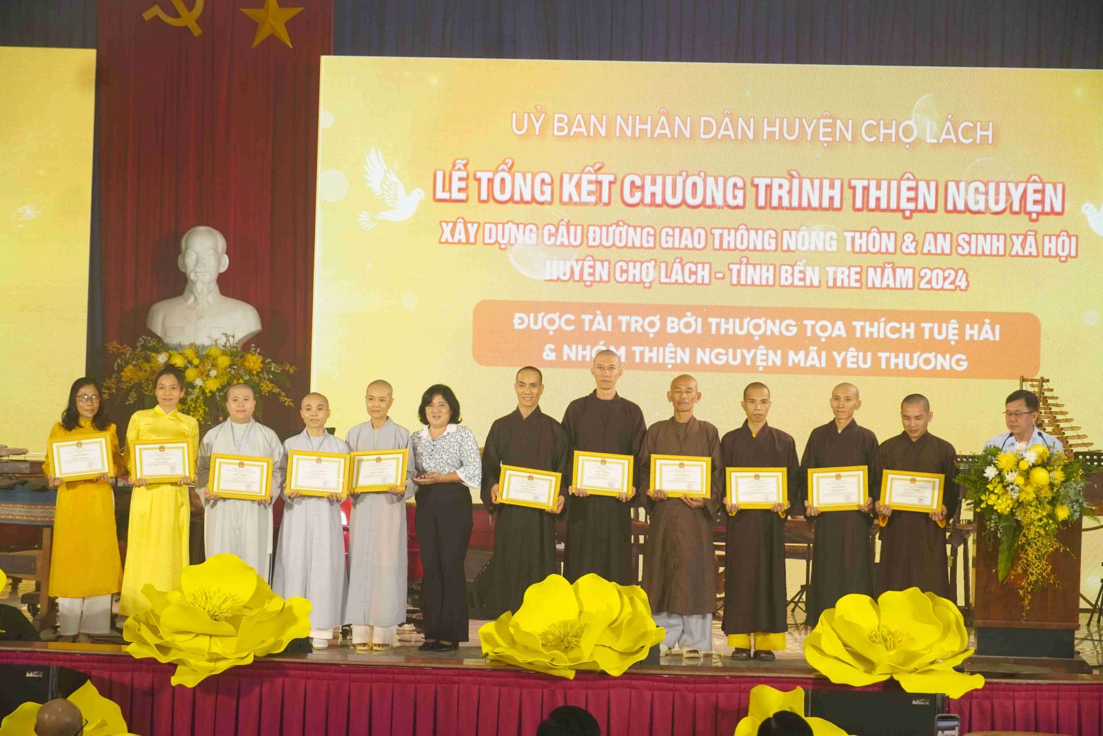 Tại buổi lễ, Ủy ban Nhân dân huyện Chợ Lách cũng đã trao tặng bằng tri ân tấm lòng vàng đến TT. Thích Tuệ Hải cùng toàn thể Tăng Ni, Phật tử Chùa Long Hương và nhóm Thiện nguyện Mãi Yêu Thương. Đây là món quà tri ân chân thành, sâu sắc và đầy ý nghĩa.