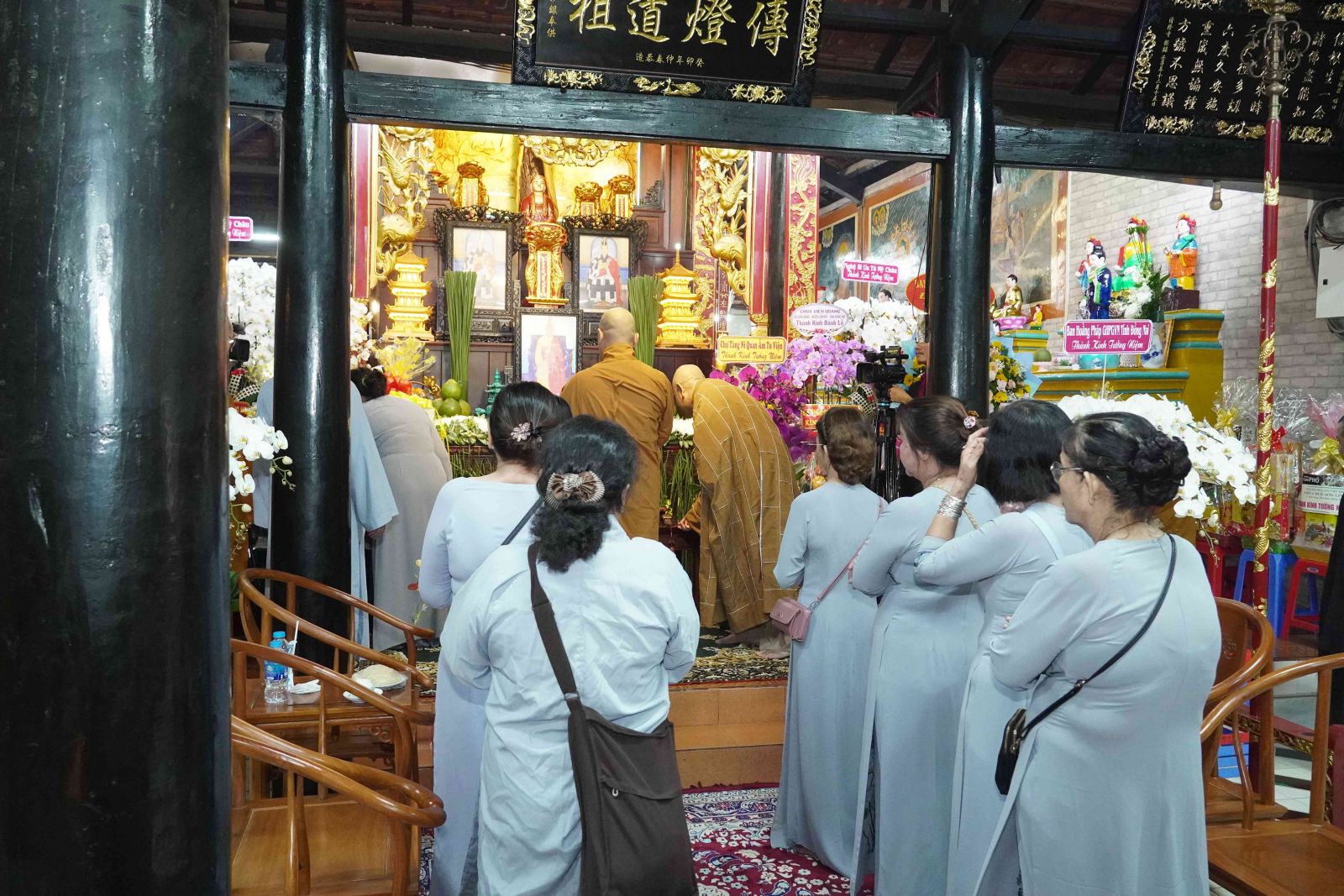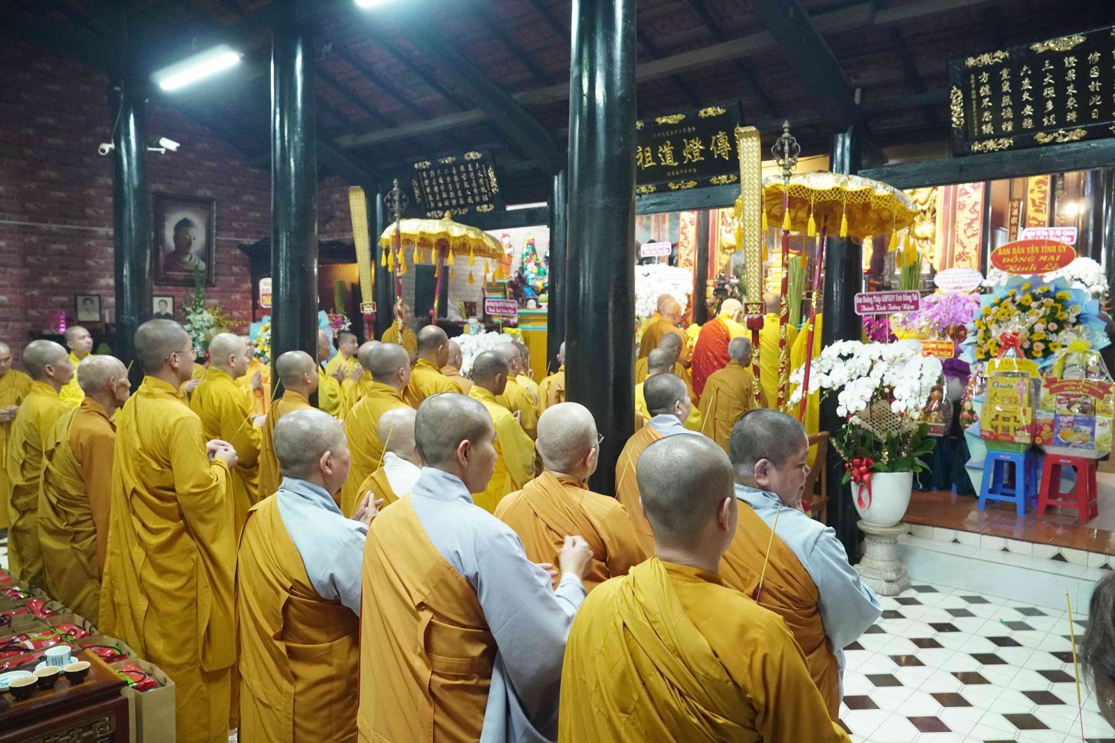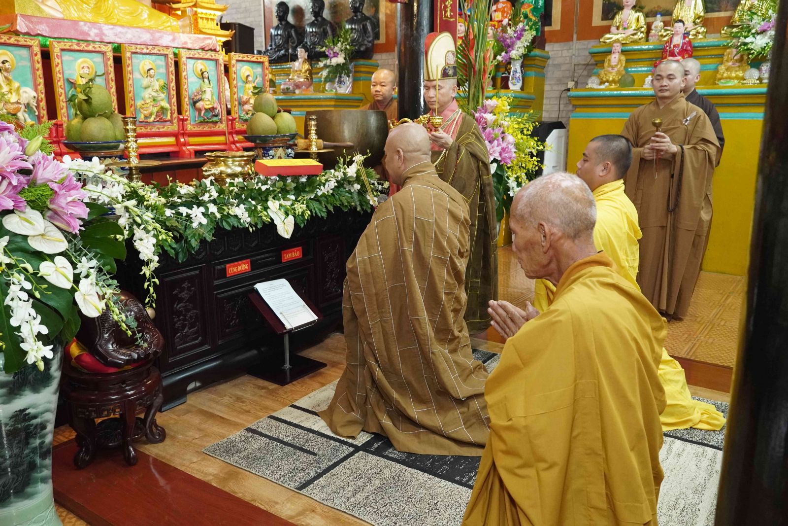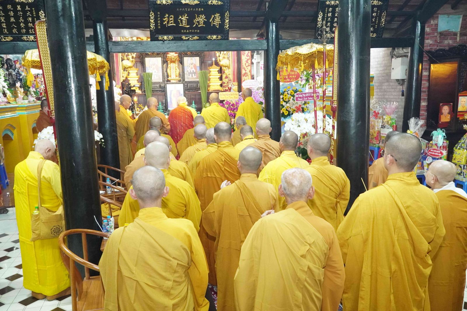Buổi lễ trang nghiêm, hương trầm quyện tỏa trước tổ đường, Tăng Ni phủ phục tôn kính một lòng hướng về chư vị Tổ sư khai sơn tạo tự.