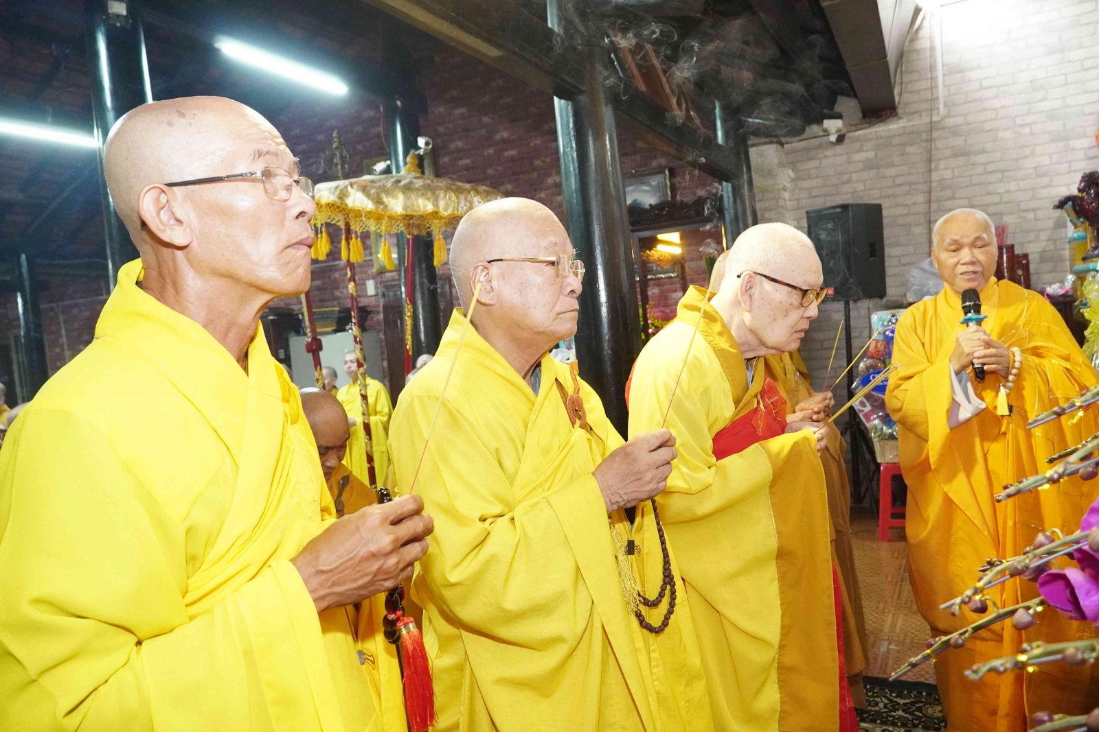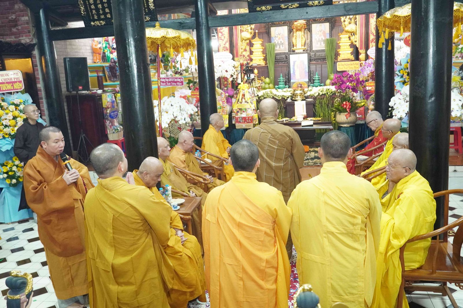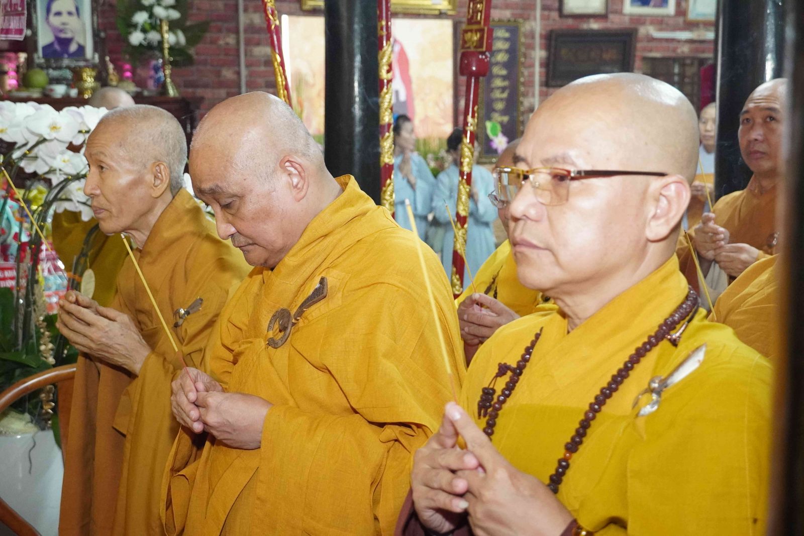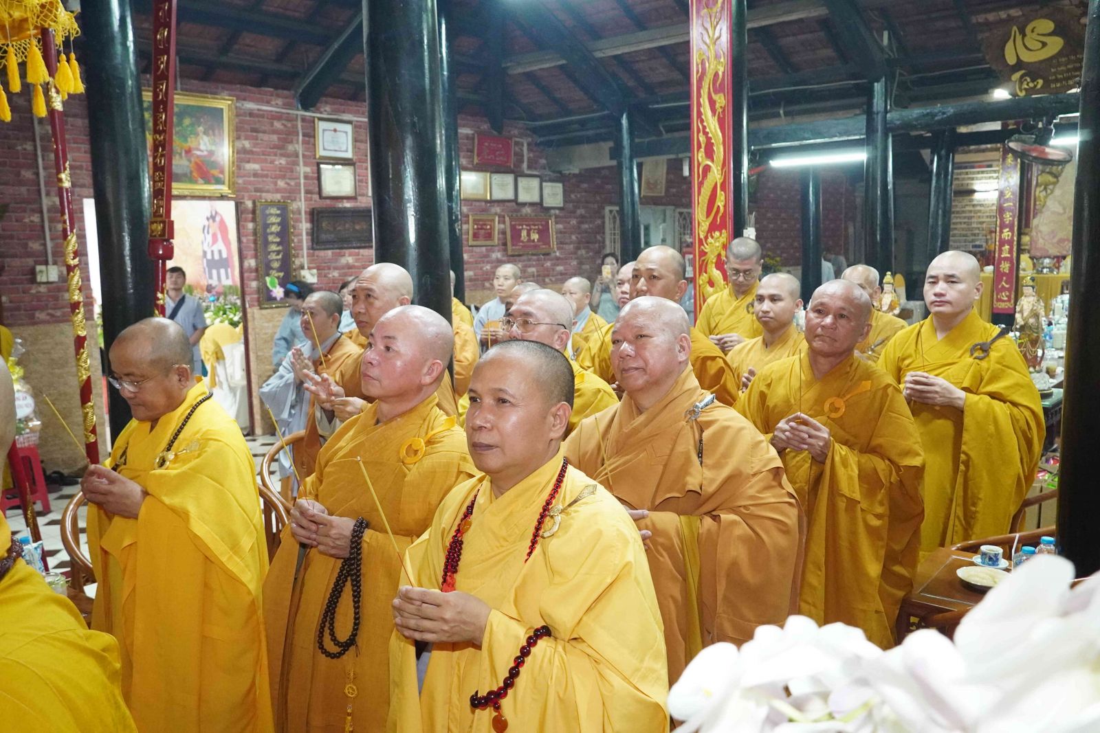 Buổi lễ trang nghiêm, hương trầm quyện tỏa trước tổ đường, Tăng Ni phủ phục tôn kính một lòng hướng về chư vị Tổ sư khai sơn tạo tự.