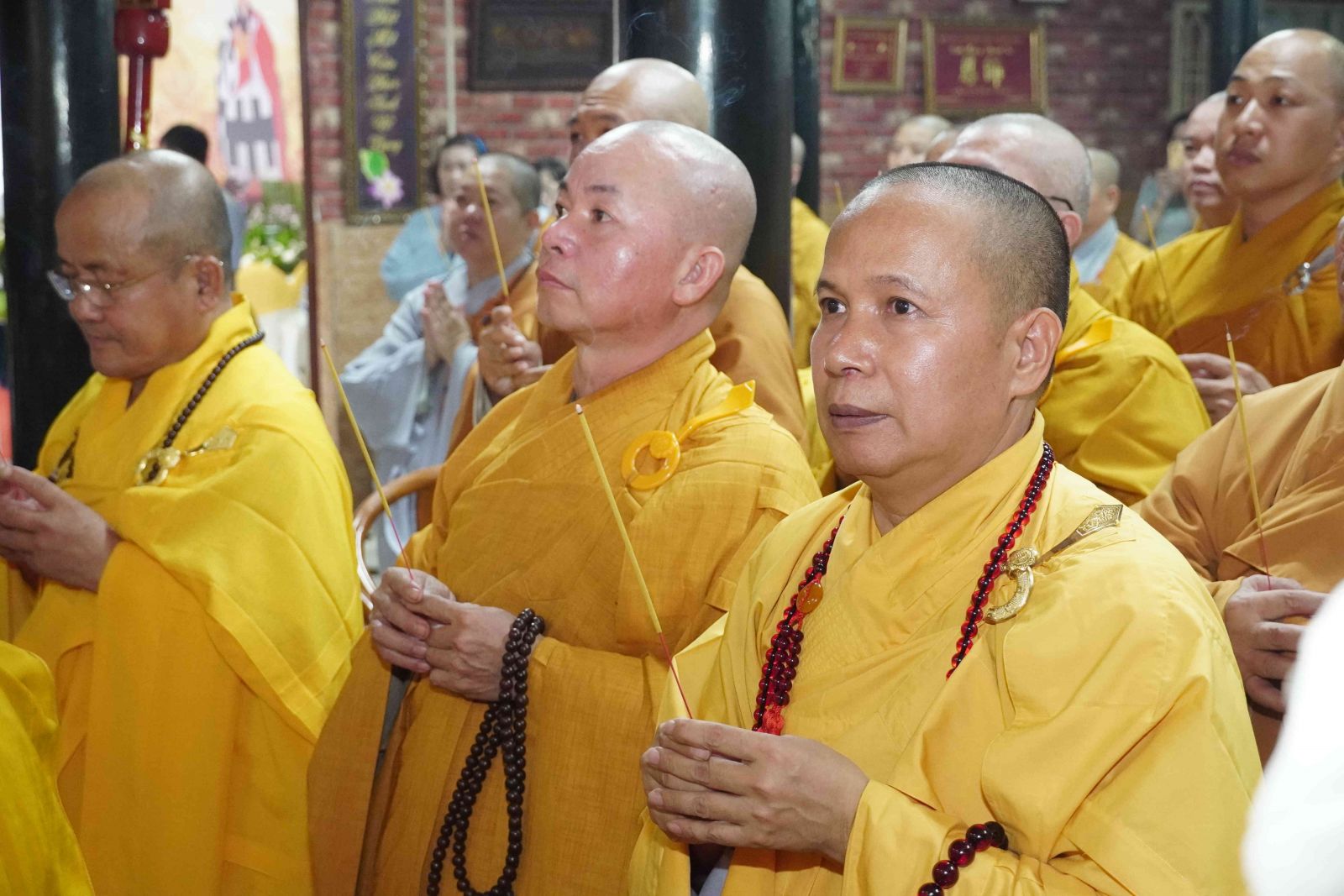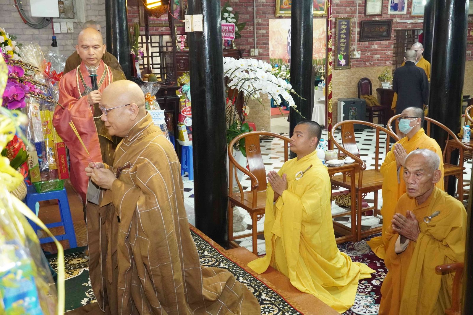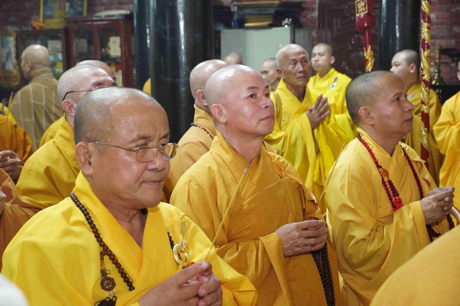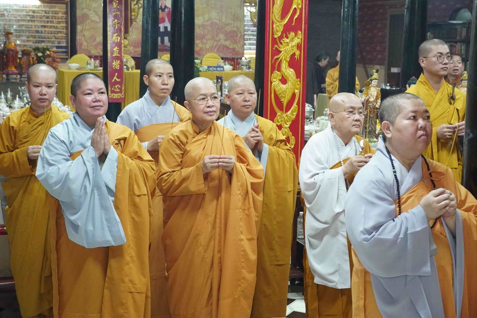 Buổi lễ trang nghiêm, hương trầm quyện tỏa trước tổ đường, Tăng Ni phủ phục tôn kính một lòng hướng về chư vị Tổ sư khai sơn tạo tự.