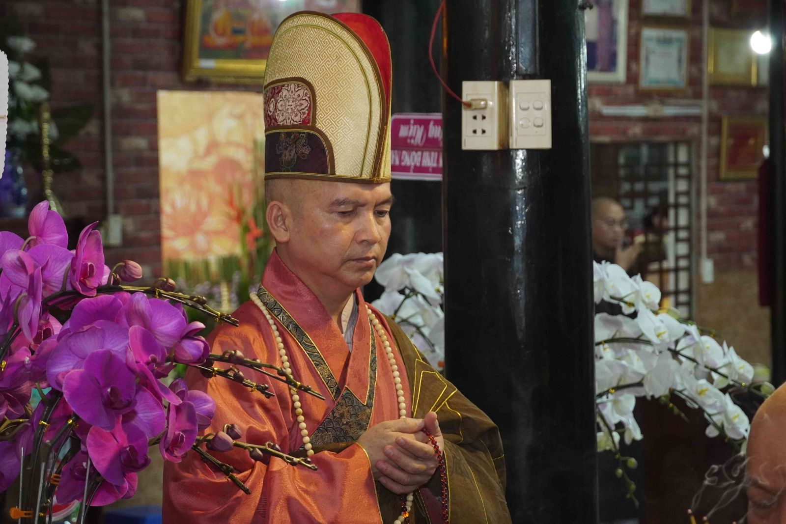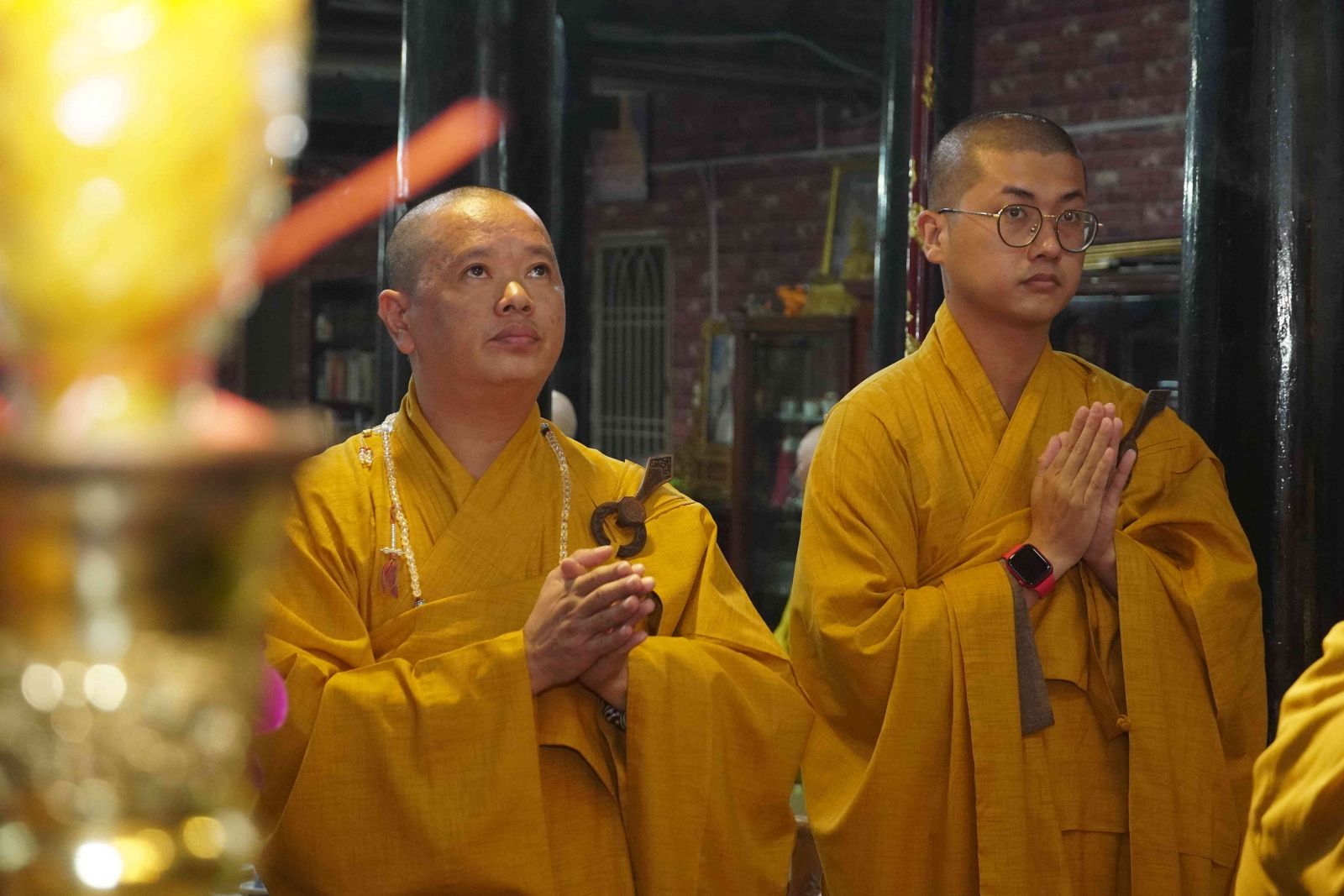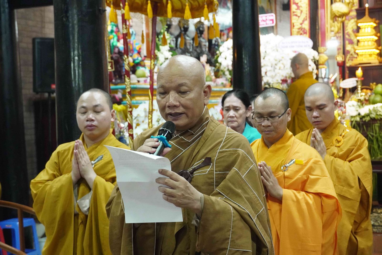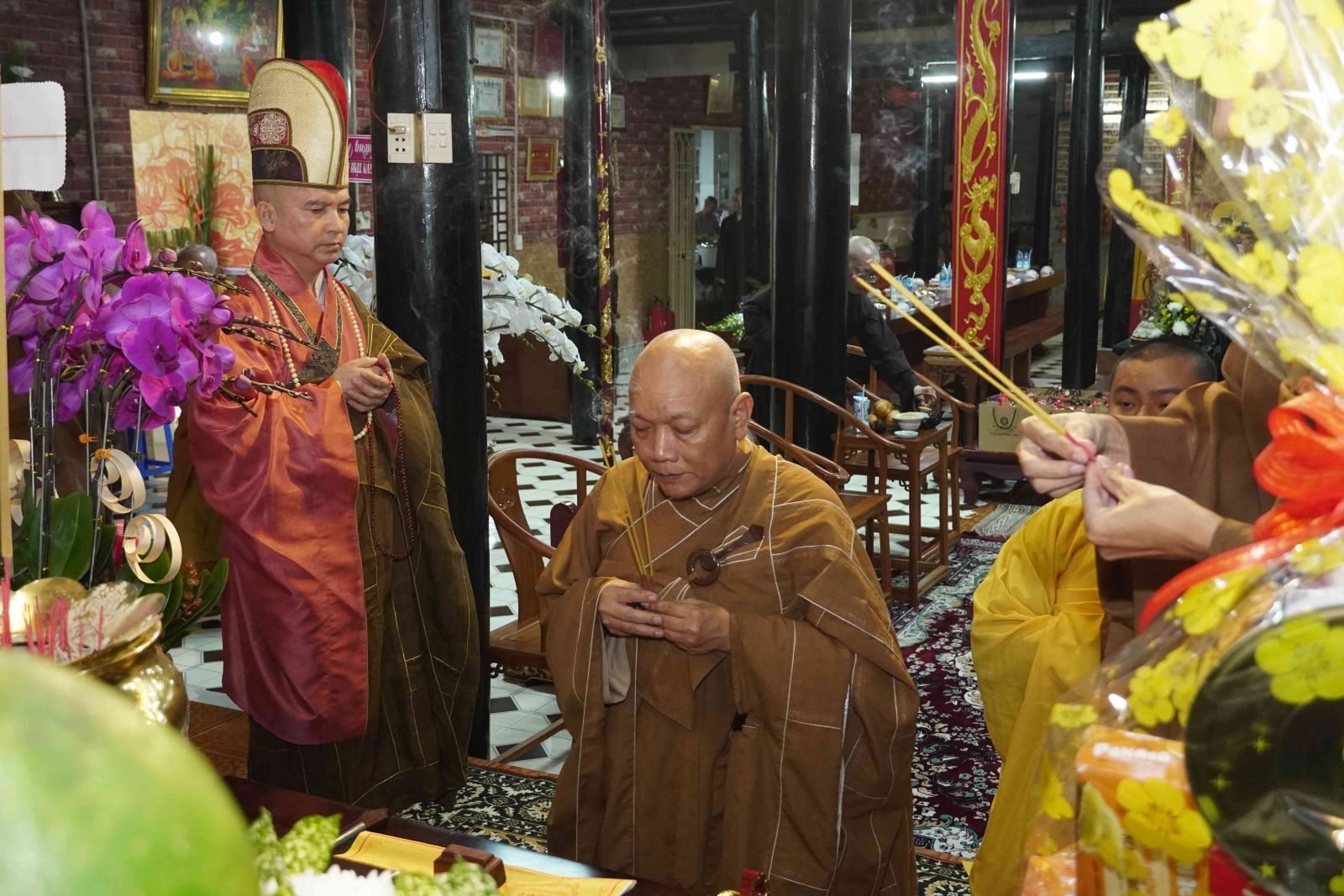 Buổi lễ trang nghiêm, hương trầm quyện tỏa trước tổ đường, Tăng Ni phủ phục tôn kính một lòng hướng về chư vị Tổ sư khai sơn tạo tự.