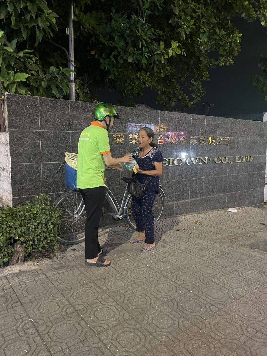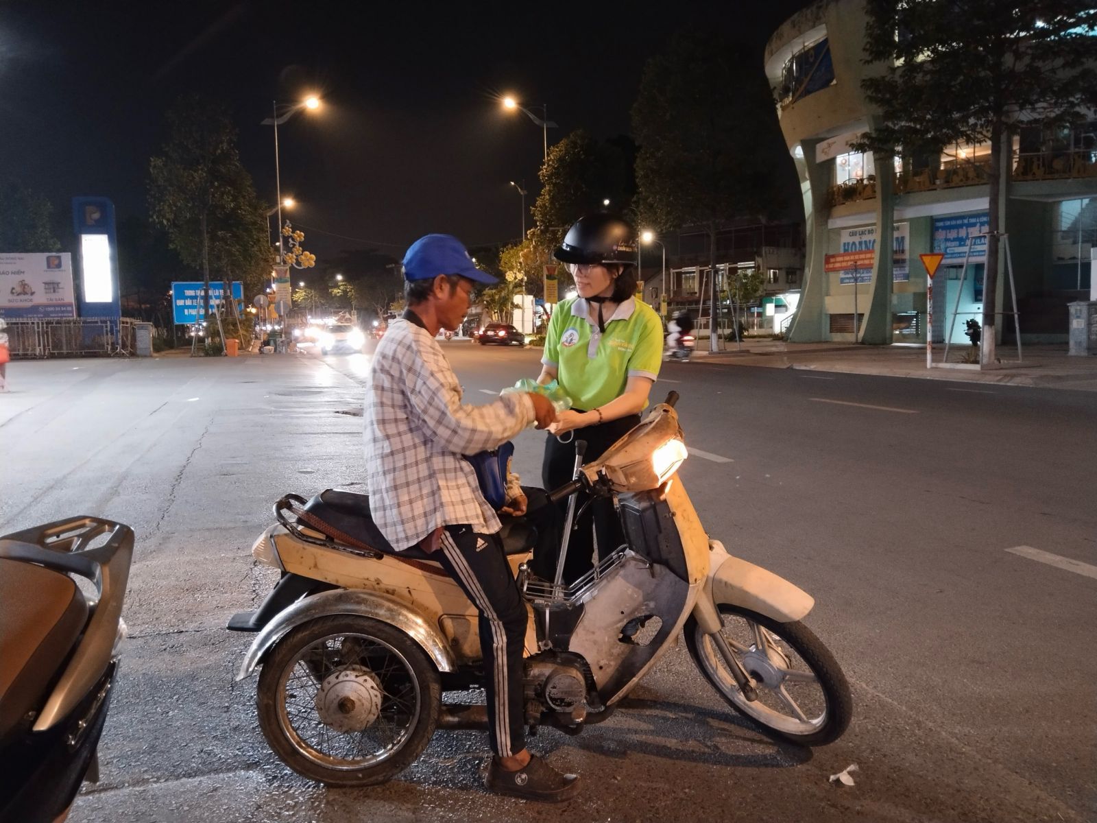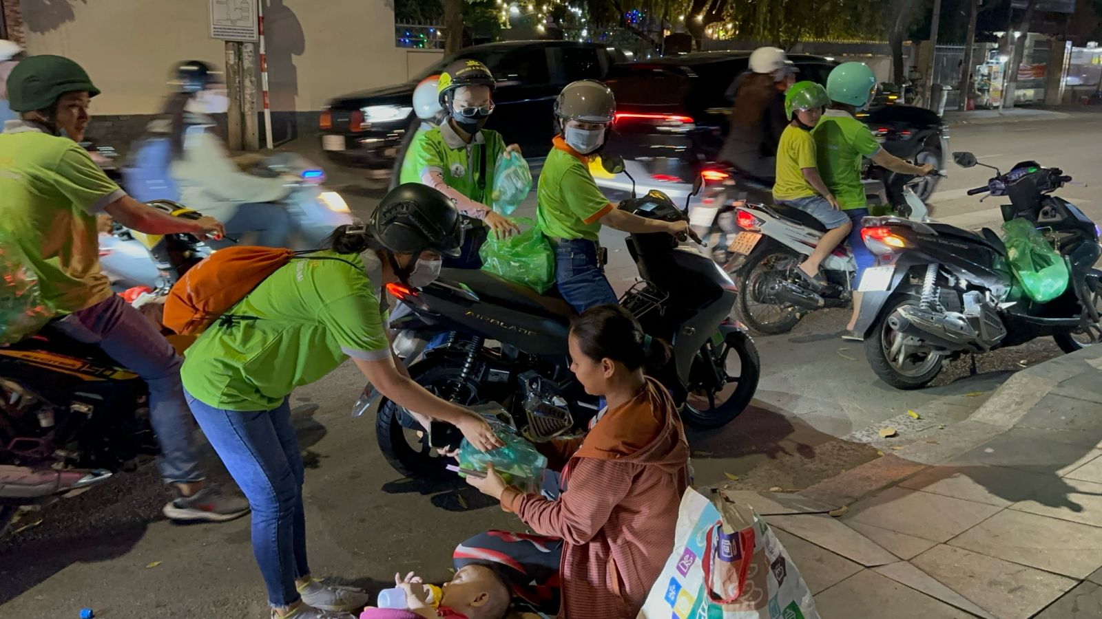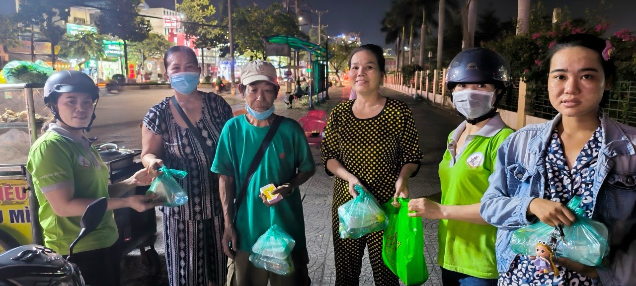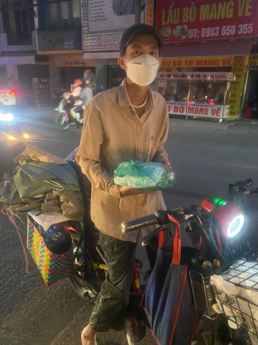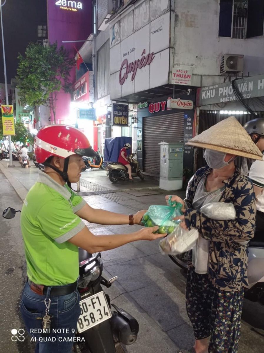 Phần ăn nhóm chuẩn bị có: bún chả nướng, nước suối, táo. Tất cả được các bạn đóng gói cẩn thận và sạch sẽ, đi dọc trên nhiều con phố trao tận tay đến những người lao động có hoàn cảnh khó khăn như lượm ve chai, bán vé số, lao công, những em bé theo cha mẹ kiếm sống trên đường phố....