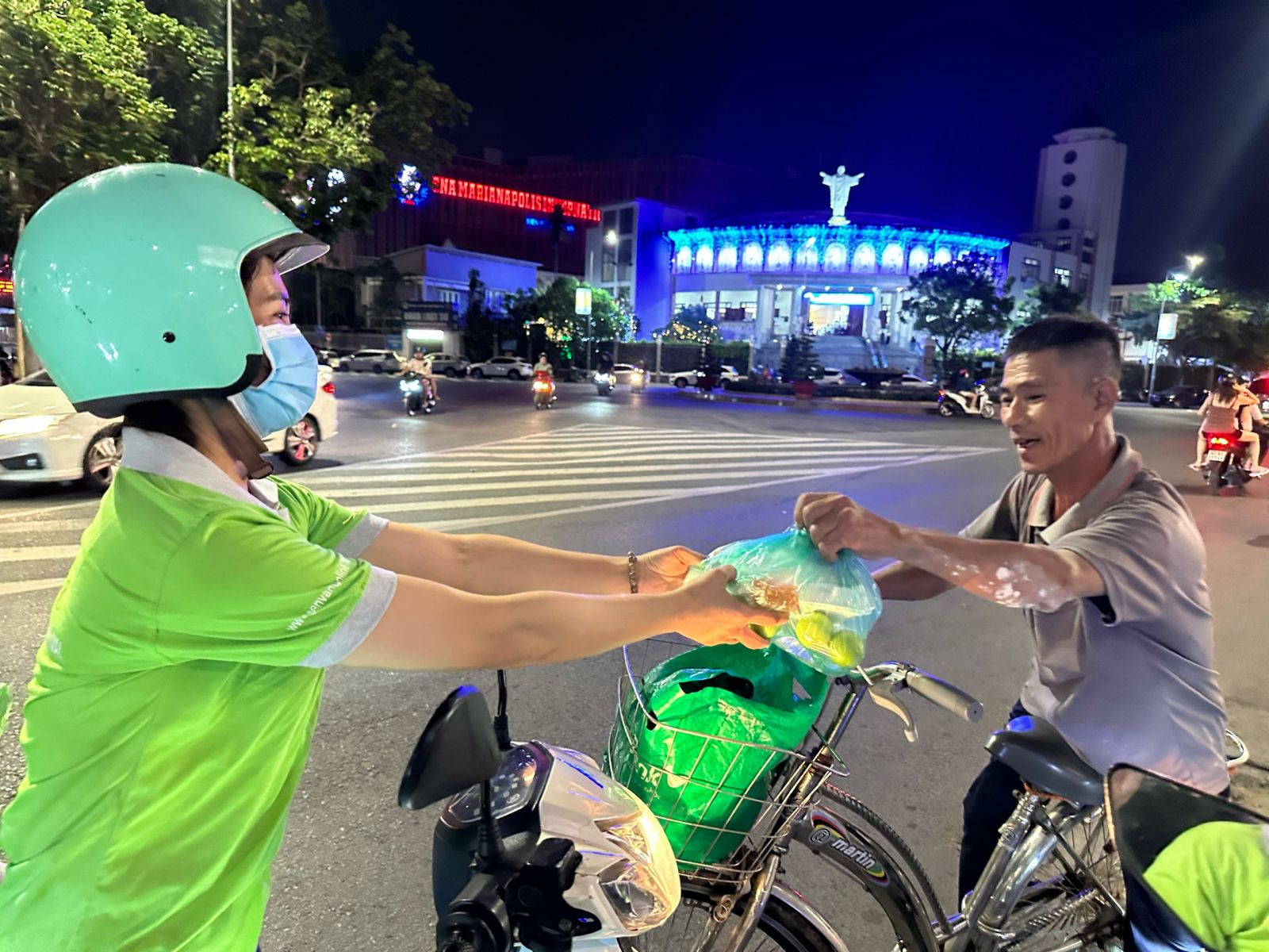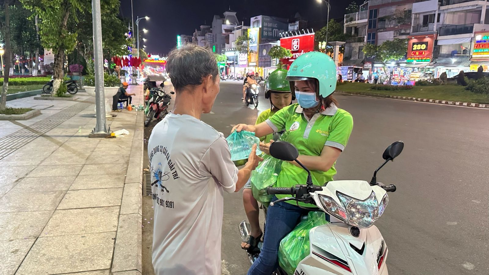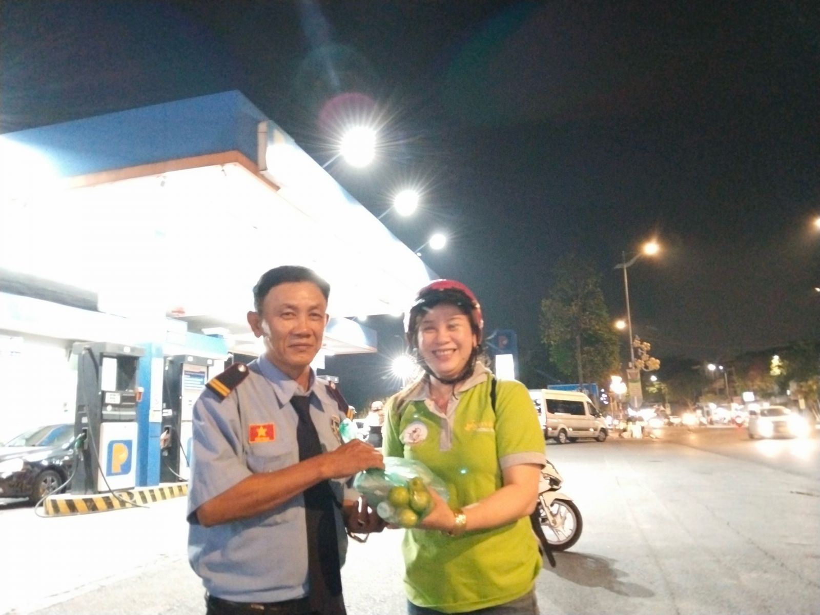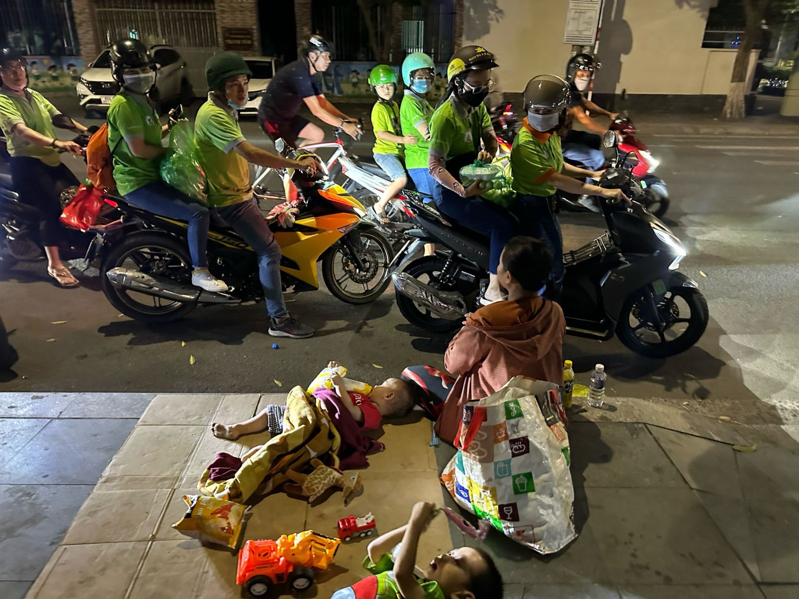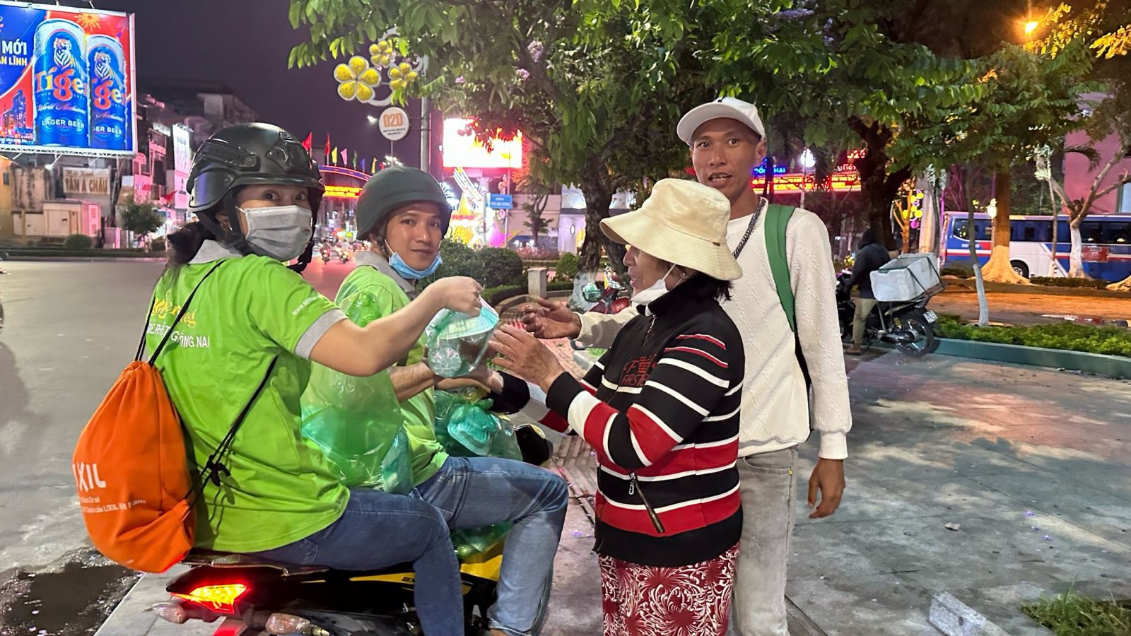 Phần ăn nhóm chuẩn bị có: bún chả nướng, nước suối, táo. Tất cả được các bạn đóng gói cẩn thận và sạch sẽ, đi dọc trên nhiều con phố trao tận tay đến những người lao động có hoàn cảnh khó khăn như lượm ve chai, bán vé số, lao công, những em bé theo cha mẹ kiếm sống trên đường phố....