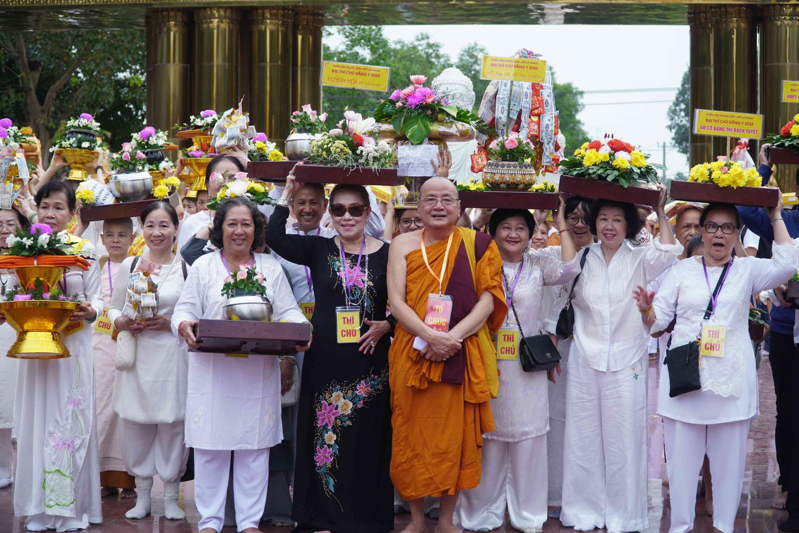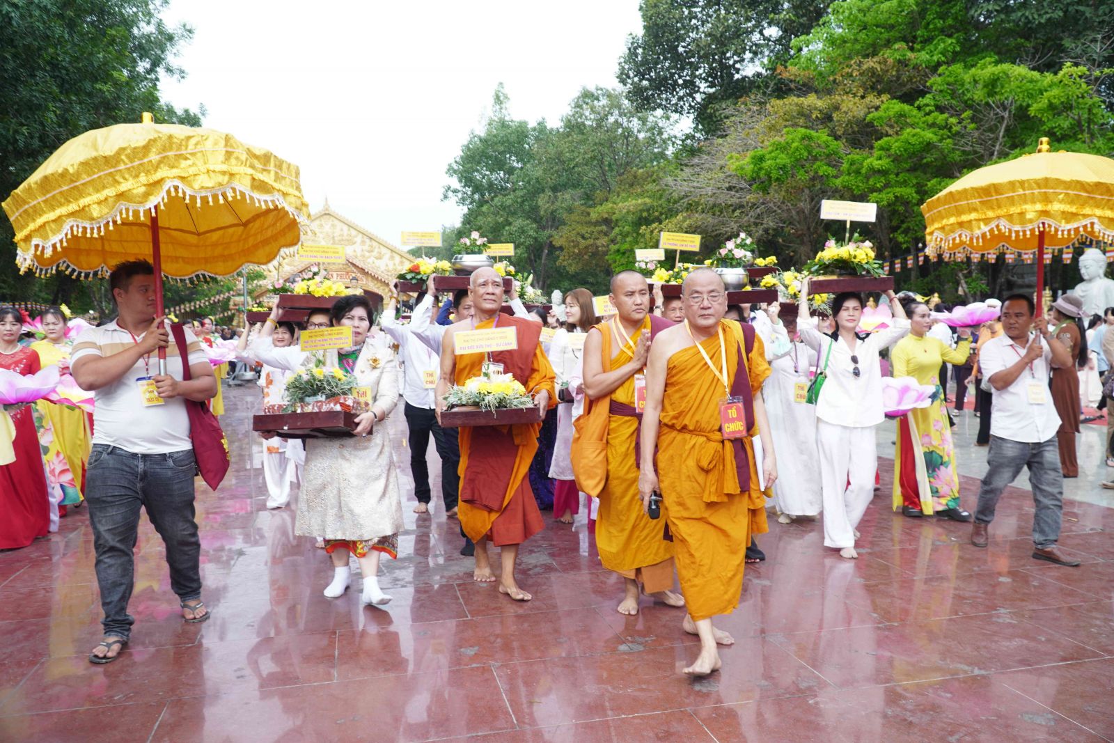 Theo sự dẫn đầu của HT trụ trì, đại chúng cử hành 3 vòng nhiễu Phật dâng Y Kathina tại khuôn viên quảng trường Bồ Đề.