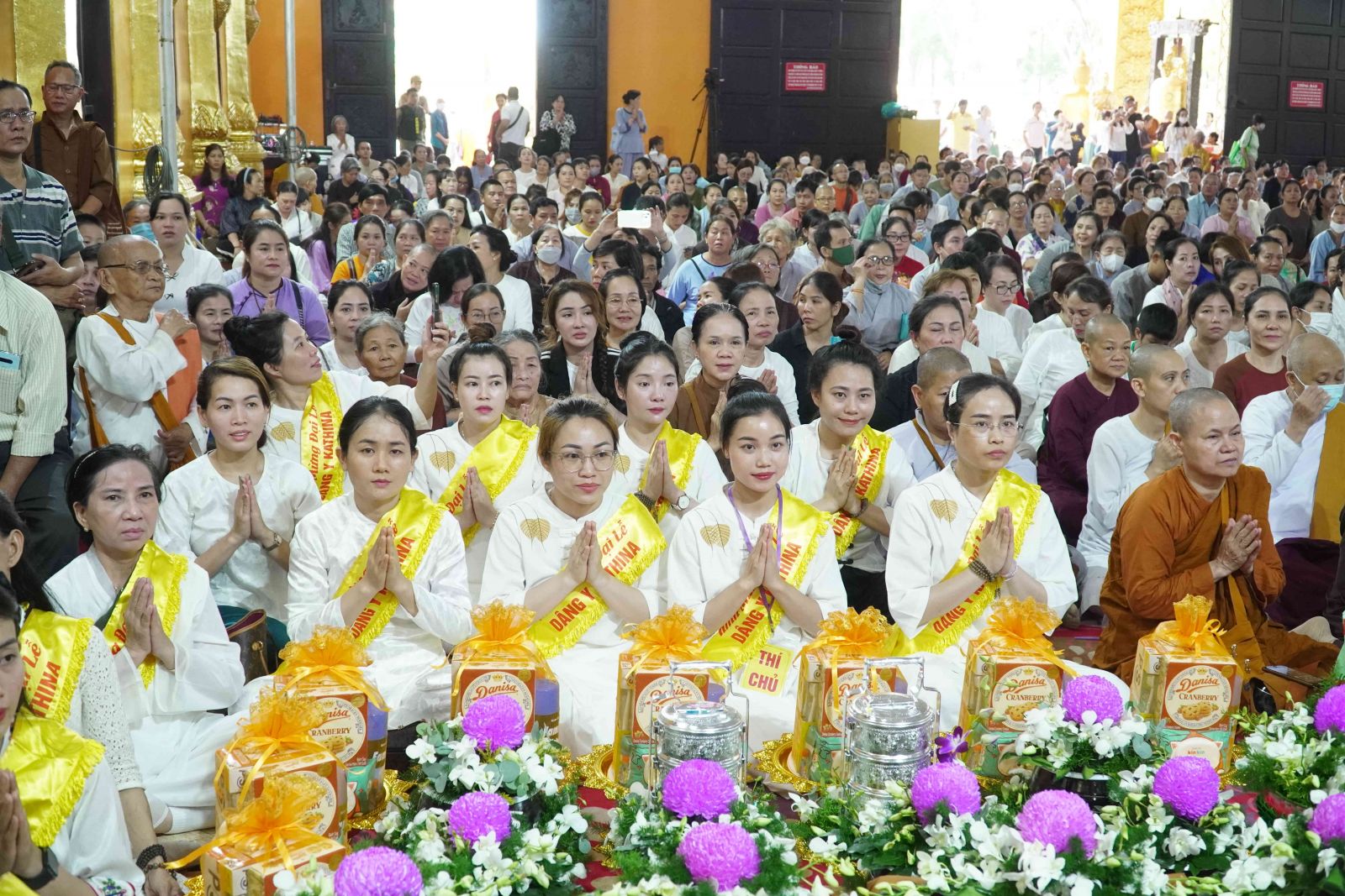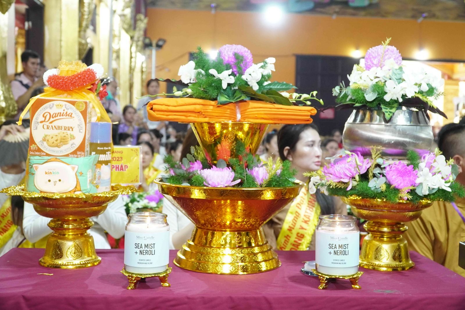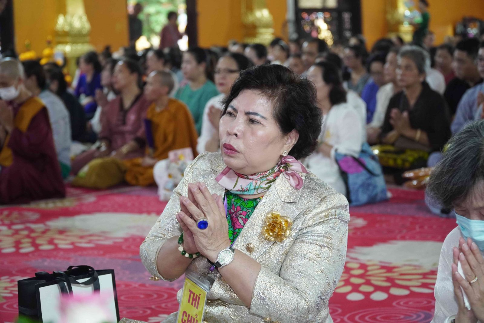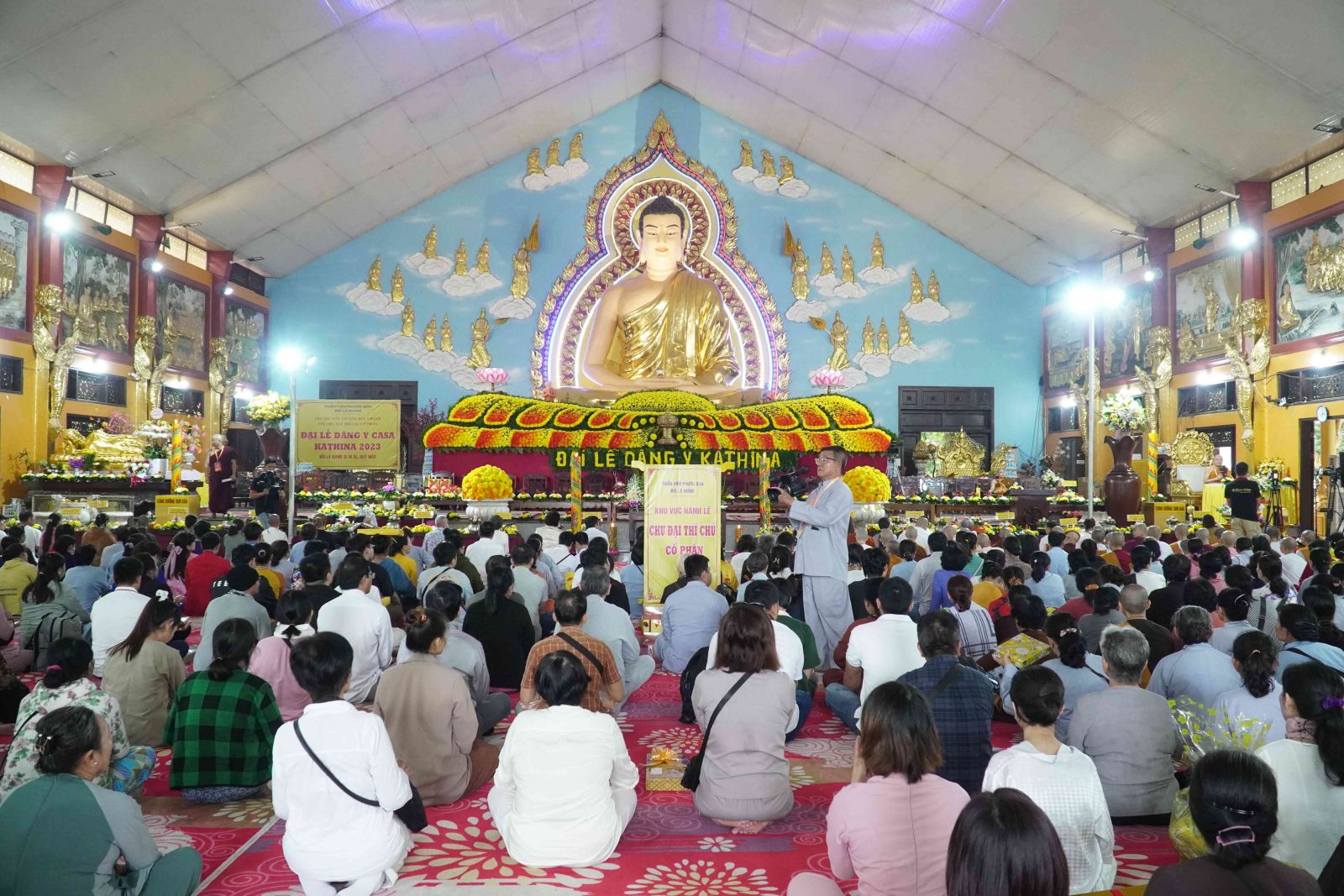 Đại diện chư thí chủ hùn phước dâng Y Kathina, PT Lê Thị Giàu tác trình duyên sự. Nhị vị tuyên Luật sư cử hành nghi thức tuyên ngôn Tăng sự, trao y mừng tuổi hạ, dâng huê trai Tăng.