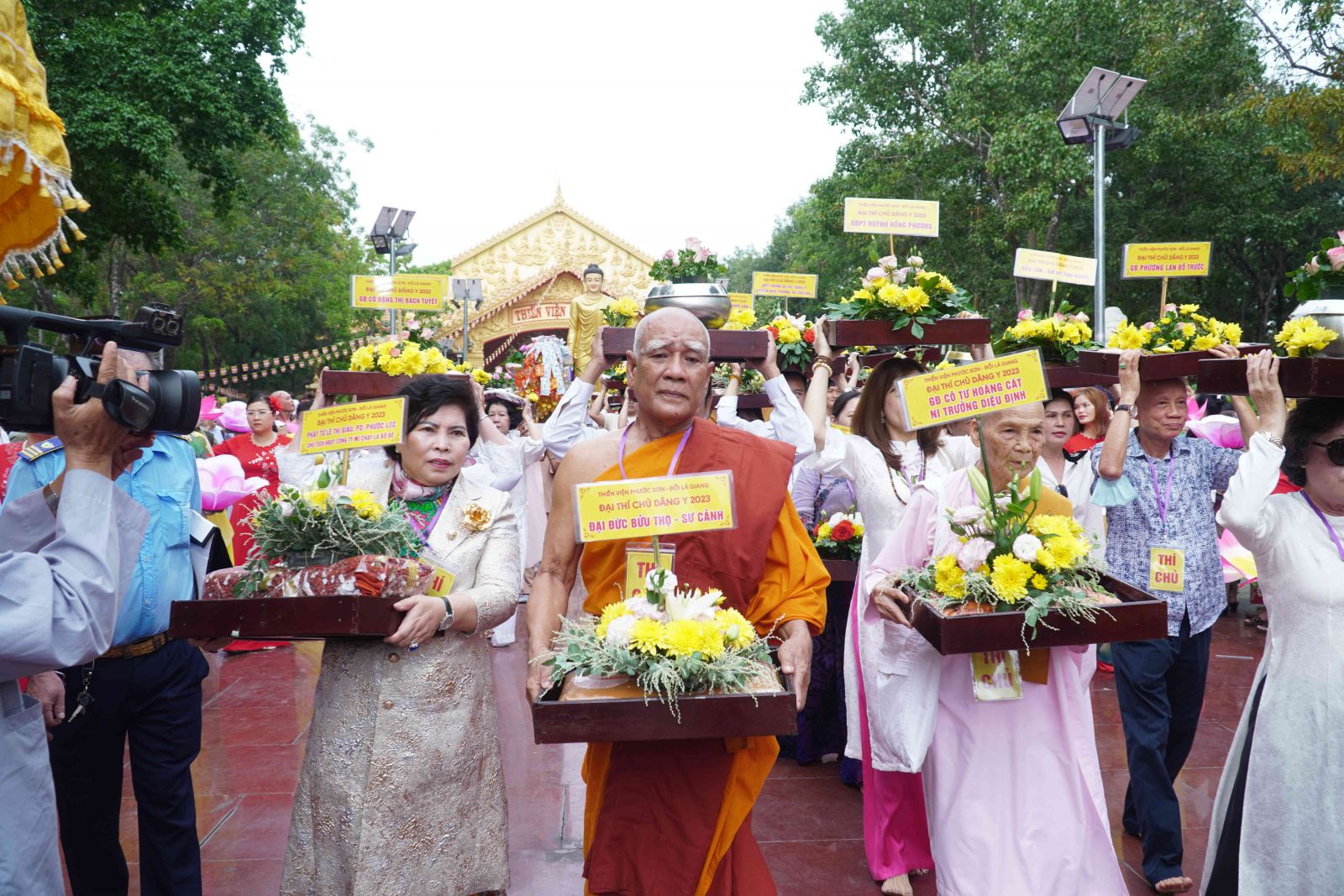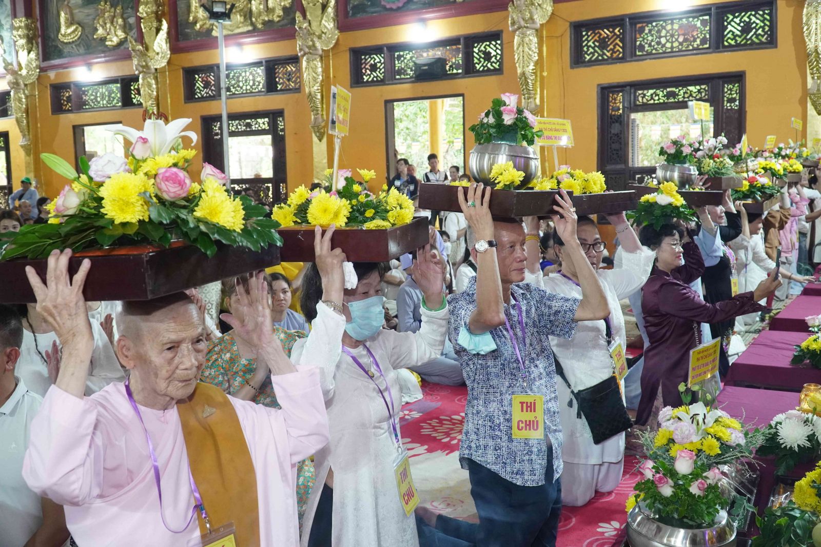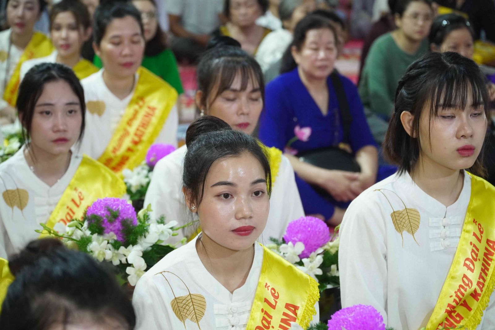 Đại diện chư thí chủ hùn phước dâng Y Kathina, PT Lê Thị Giàu tác trình duyên sự. Nhị vị tuyên Luật sư cử hành nghi thức tuyên ngôn Tăng sự, trao y mừng tuổi hạ, dâng huê trai Tăng.