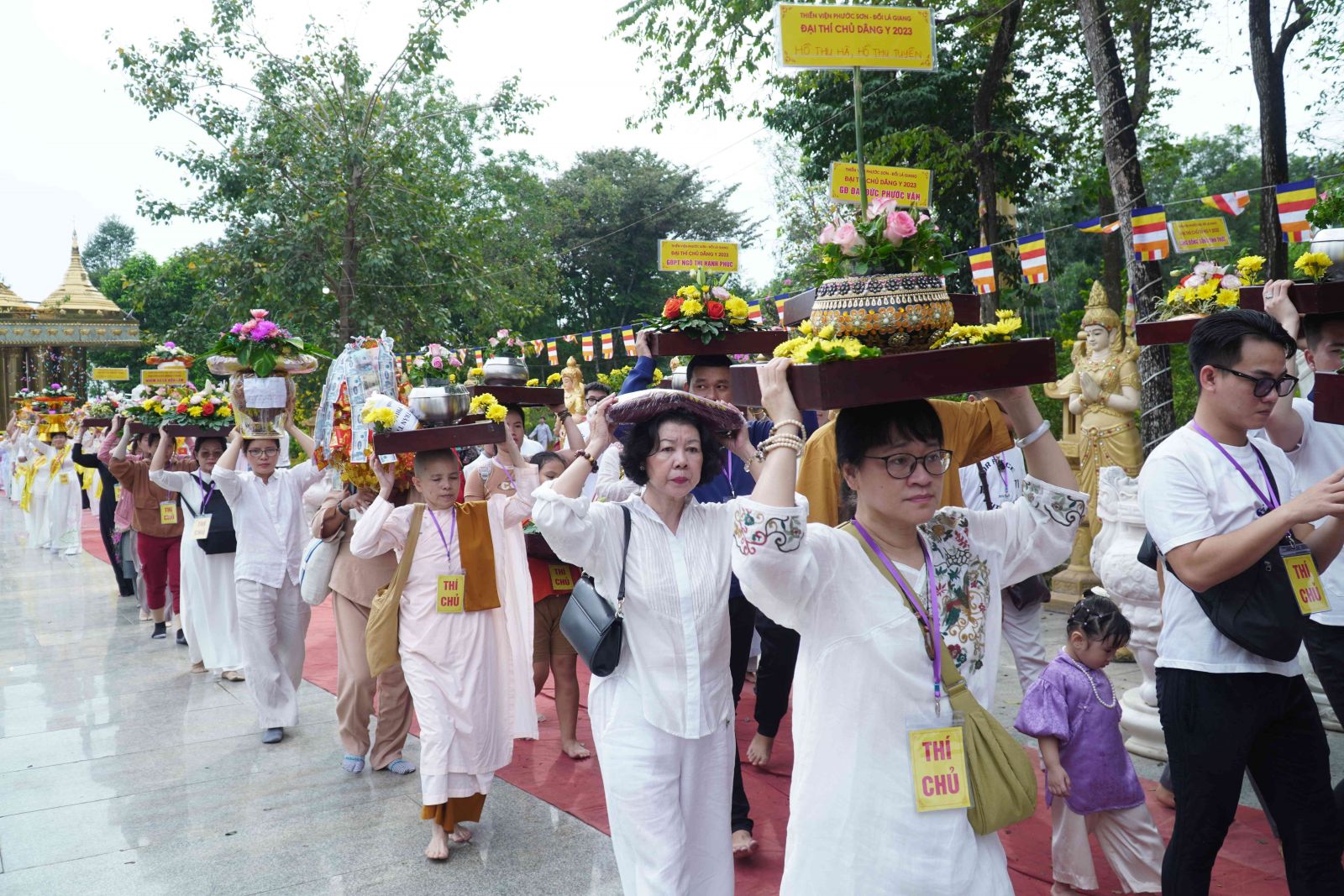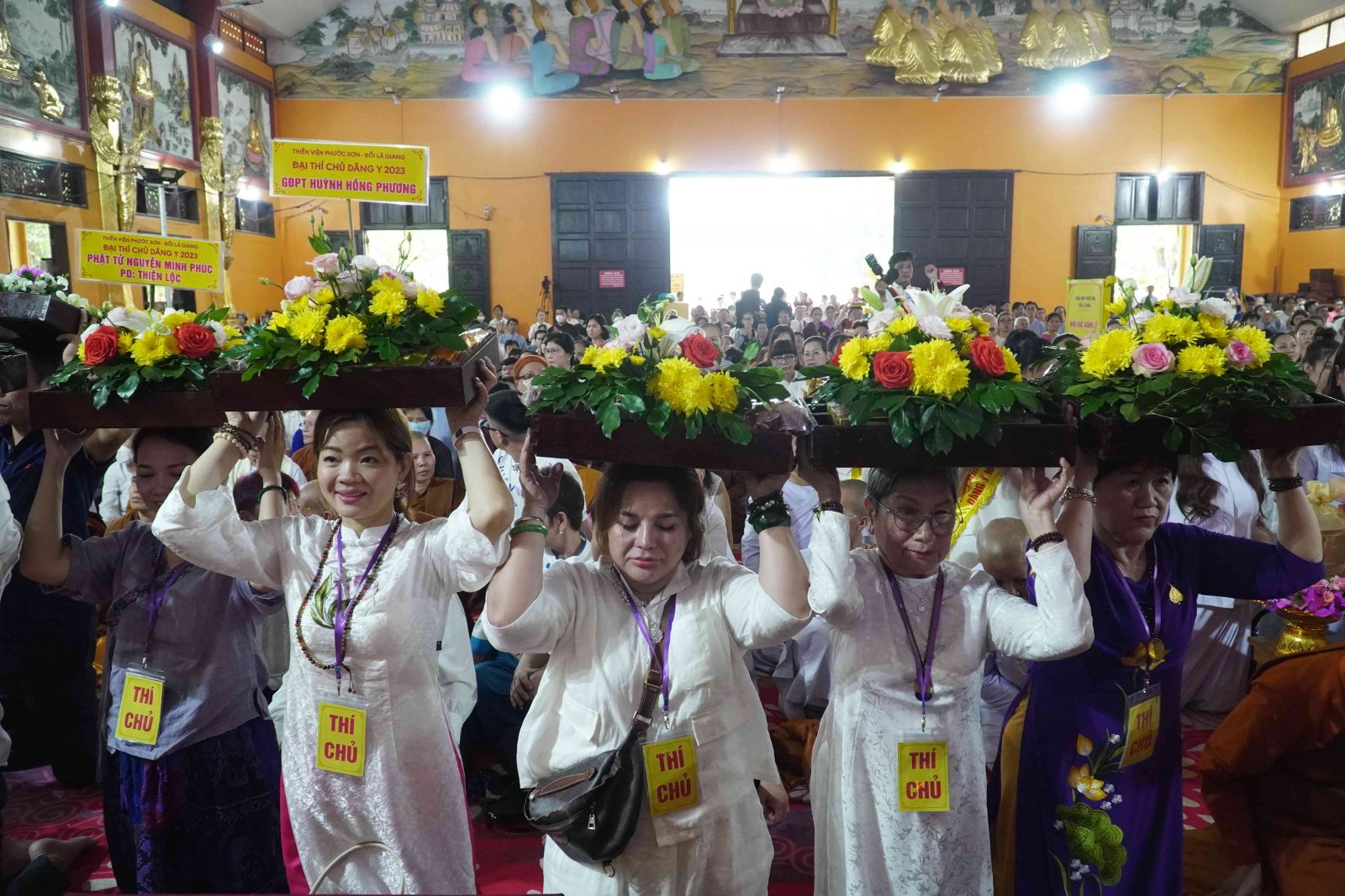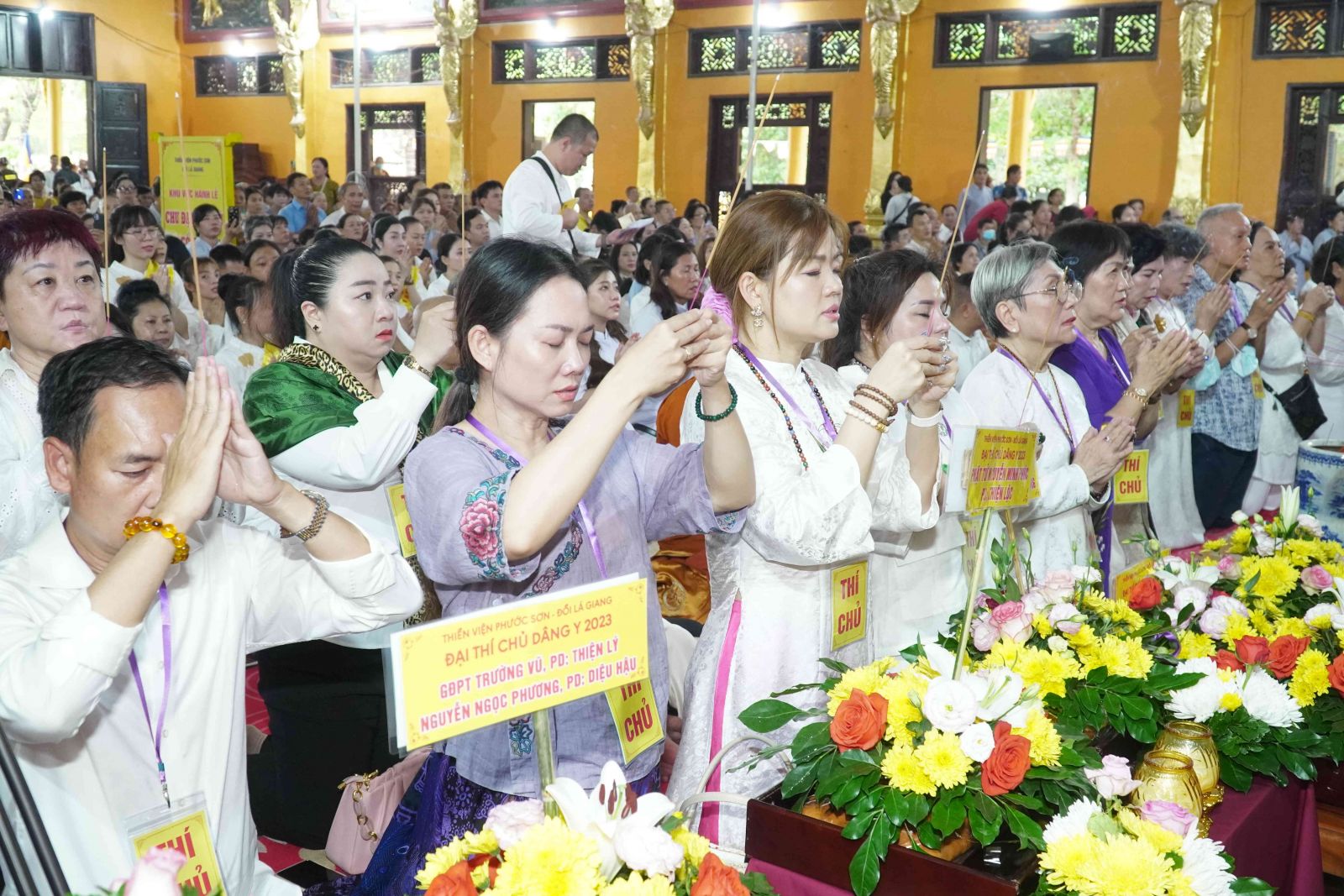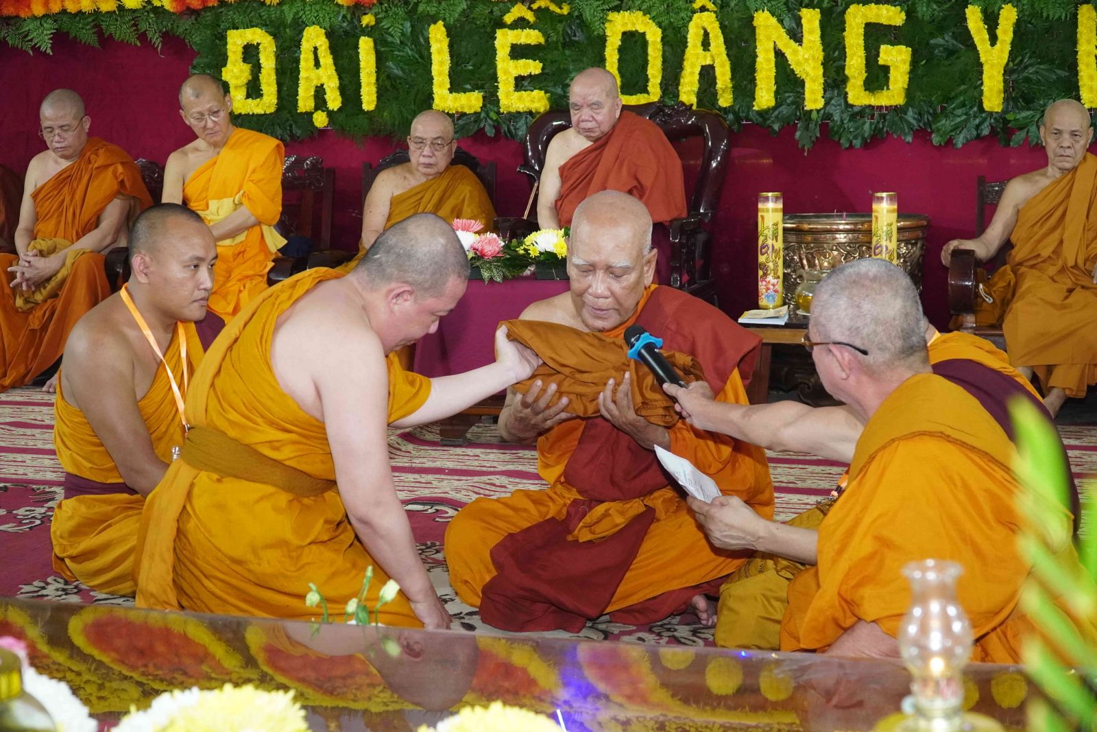 Đại diện chư thí chủ hùn phước dâng Y Kathina, PT Lê Thị Giàu tác trình duyên sự. Nhị vị tuyên Luật sư cử hành nghi thức tuyên ngôn Tăng sự, trao y mừng tuổi hạ, dâng huê trai Tăng.