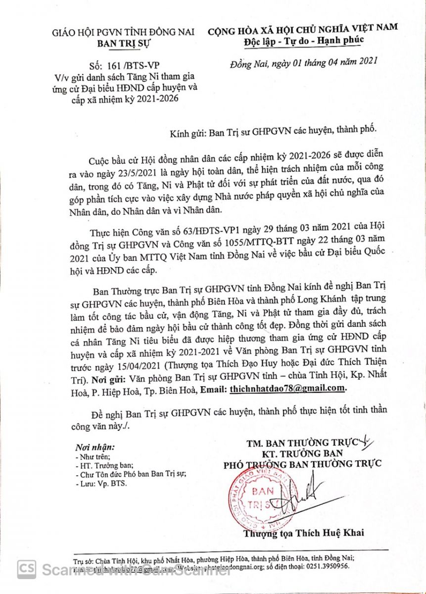 Ban Thường trực Ban Trị sự GHPGVN tỉnh Đồng Nai kính đề nghị Ban Trị sự GHPGVN các huyện, thành phố Biên Hòa và thành phố Long Khánh tập trung làm tốt công tác bầu cử, vận động Tăng, Ni và Phật tử tham gia đầy đủ, trách nhiệm để bảo đảm ngày hội bầu cử thành công tốt đẹp. Đồng thời gửi danh sách cá nhân Tăng Ni tiêu biểu đã được hiệp thương tham gia ứng cử HĐND cấp huyện và cấp xã nhiệm kỳ 2021-2021 về Văn phòng Ban Trị sự GHPGVN tỉnh trước ngày 15/04/2021 (Thượng tọa Thích Đạo Huy hoặc Đại đức Thích Thiện Trí).