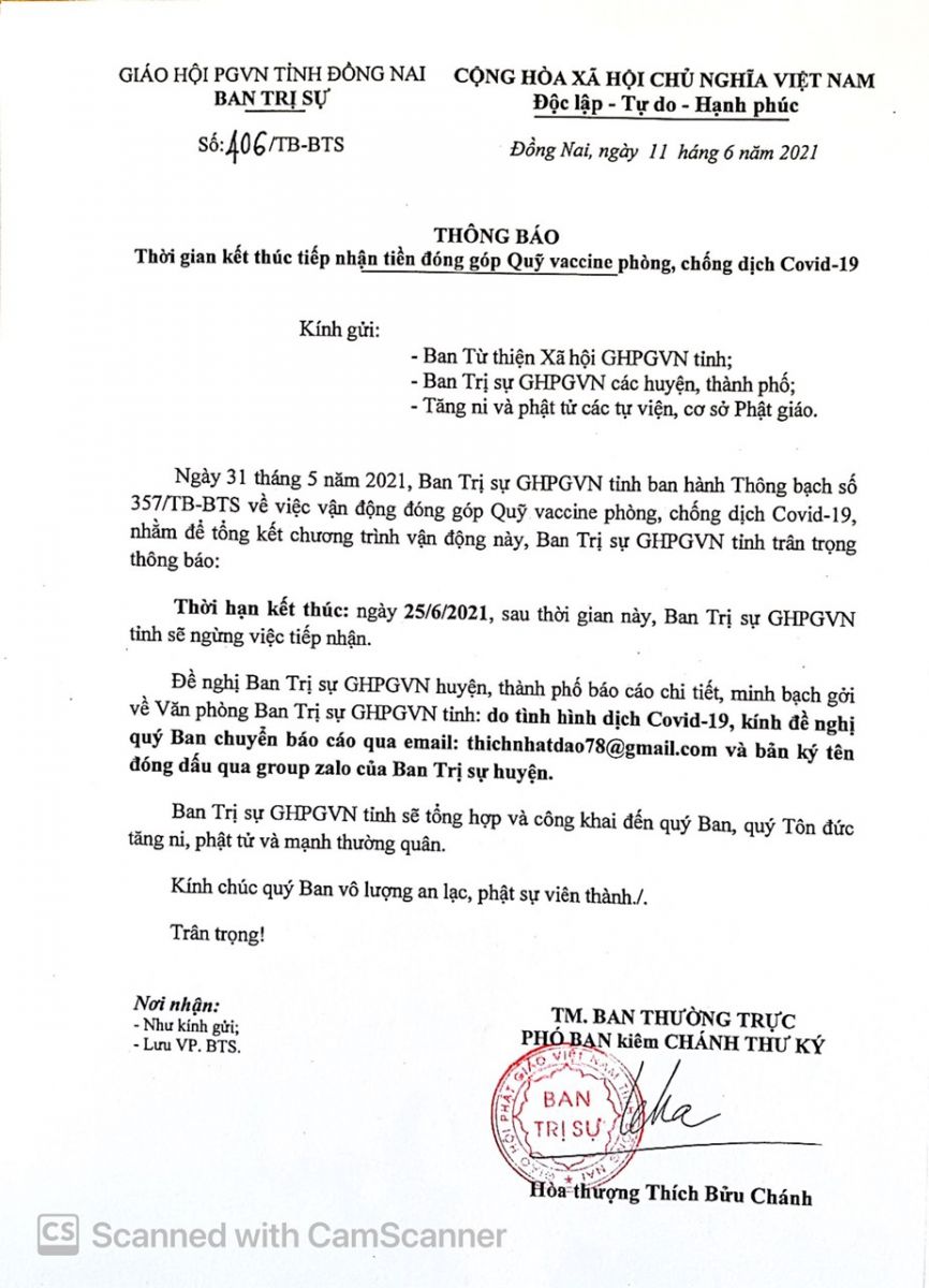 Ngày 31 tháng 5 năm 2021, Ban Trị sự GHPGVN tỉnh ban hành Thông bạch số 357/TB-BTS về việc vận động đóng góp Quỹ vaccine phòng, chống dịch Covid-19, nhằm để tổng kết chương trình vận động này, Ban Trị sự GHPGVN tỉnh trân trọng thông báo: