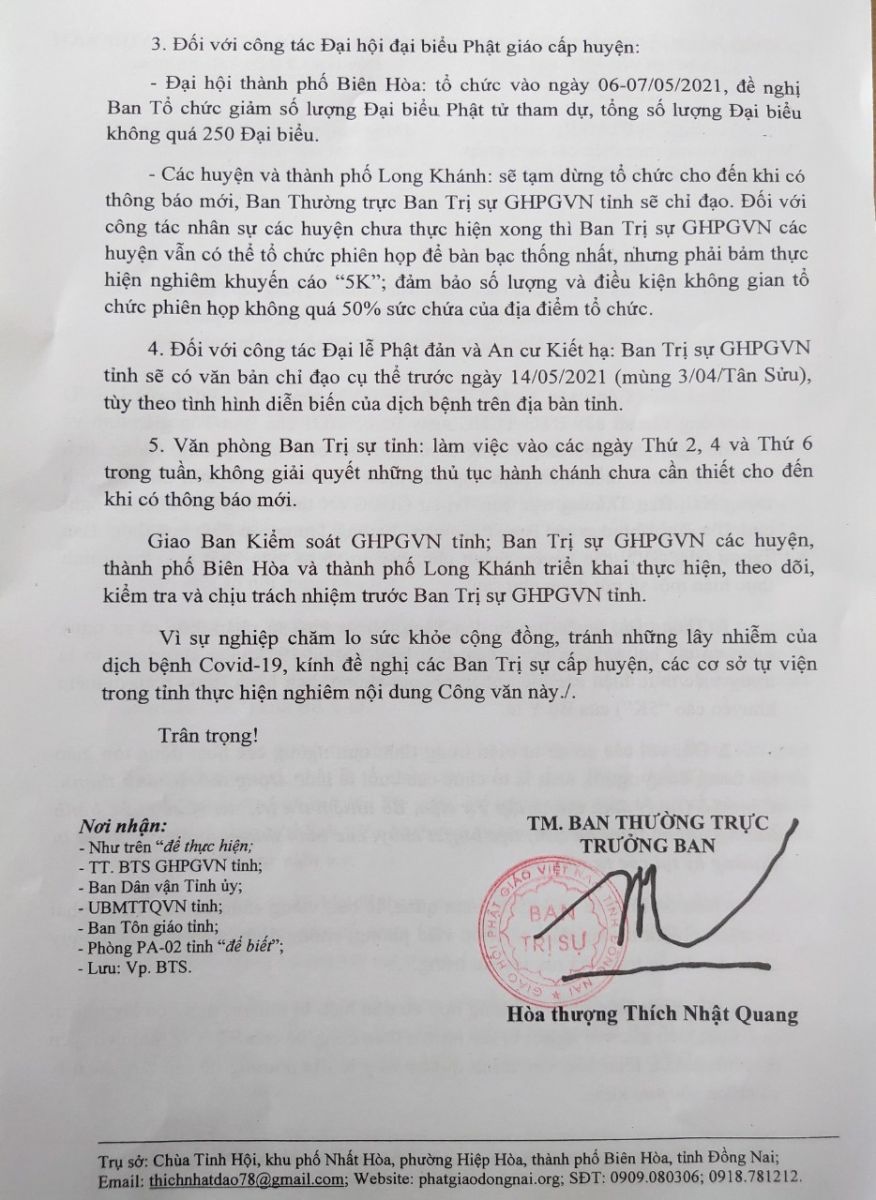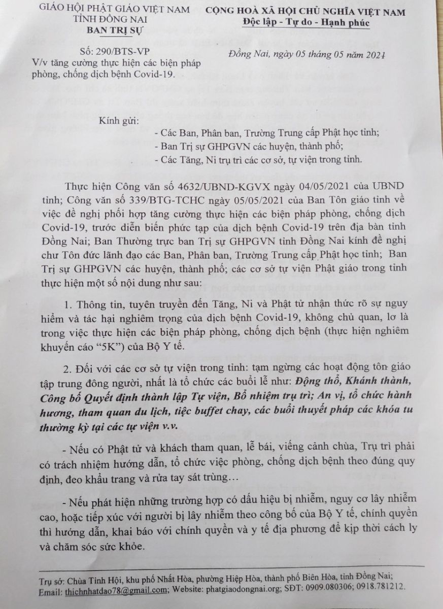 Ban Thường trực Ban Trị sự GPGVN tỉnh Đồng Nai kính đề nghị chư Tôn đức lãnh đạo các Ban, Phân ban, Trường Trung cấp Phật học tỉnh; Ban Trị sự GHPGVN các huyện, thành phố, các cơ sở tự viện Phật giáo trong tỉnh thực hiện một số nội dung như sau: