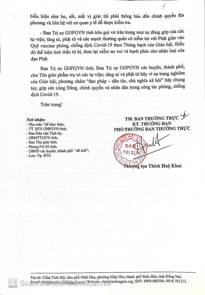 Ban Trị sự GHPGVN tỉnh Đồng Nai cũng đã ban hành nhiều văn bản hướng dẫn các tự viện; tăng ni, tín đồ Phật giáo trong việc thực hiện các biện pháp phòng, chống dịch Covid-19. Nhằm bảo vệ sức khỏe cho bản thân của tăng ni, tín đồ Phật giáo nói riêng và sức khỏe cộng đồng nói chung theo các khuyến cáo và hướng dẫn của ngành y tế; đồng thời không để việc lây nhiễm mất kiểm soát trong các tự viện, tăng ni và phật tử làm ảnh hưởng chung đến hình ảnh của những người theo Phật giáo, Ban Trị sự GHPGVN tỉnh kêu gọi toàn thể các tự viện, tăng ni và phật tử thực hiện một số nội dung như sau: