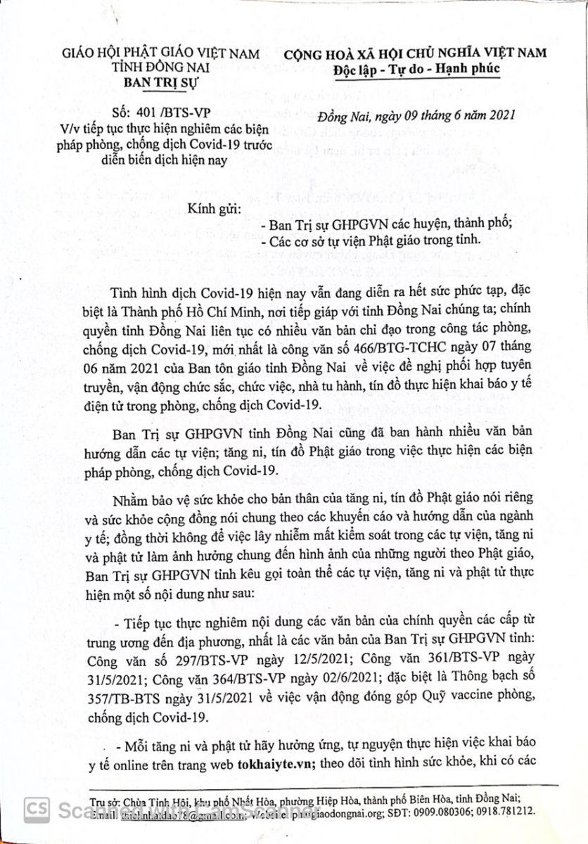 | GIÁO HỘI PHẬT GIÁO VIỆT NAM TỈNH ĐỒNG NAI BAN TRỊ SỰ Số: 401 BTS-VP V/v tiếp tục thực hiện nghiêm các biện pháp phòng, chống dịch Covid-19 trước diễn biến dịch hiện nay |