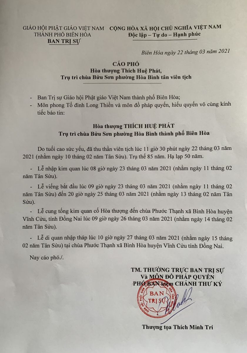 - Lễ cung tống kim quan cố Hòa thượng đến chùa Phước Thạnh, xã Bình Hòa, huyện Vĩnh Cửu, tỉnh Đồng Nai lúc 09 giờ ngày 26 tháng 03 năm 2021 (nhằm ngày 14 tháng 02 năm Tân Sửu).