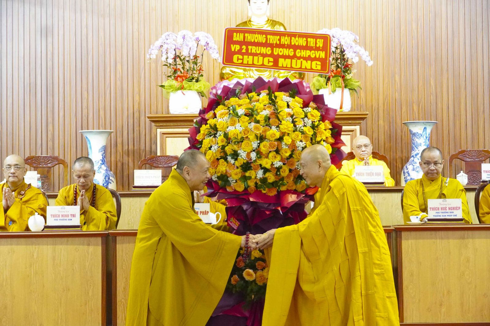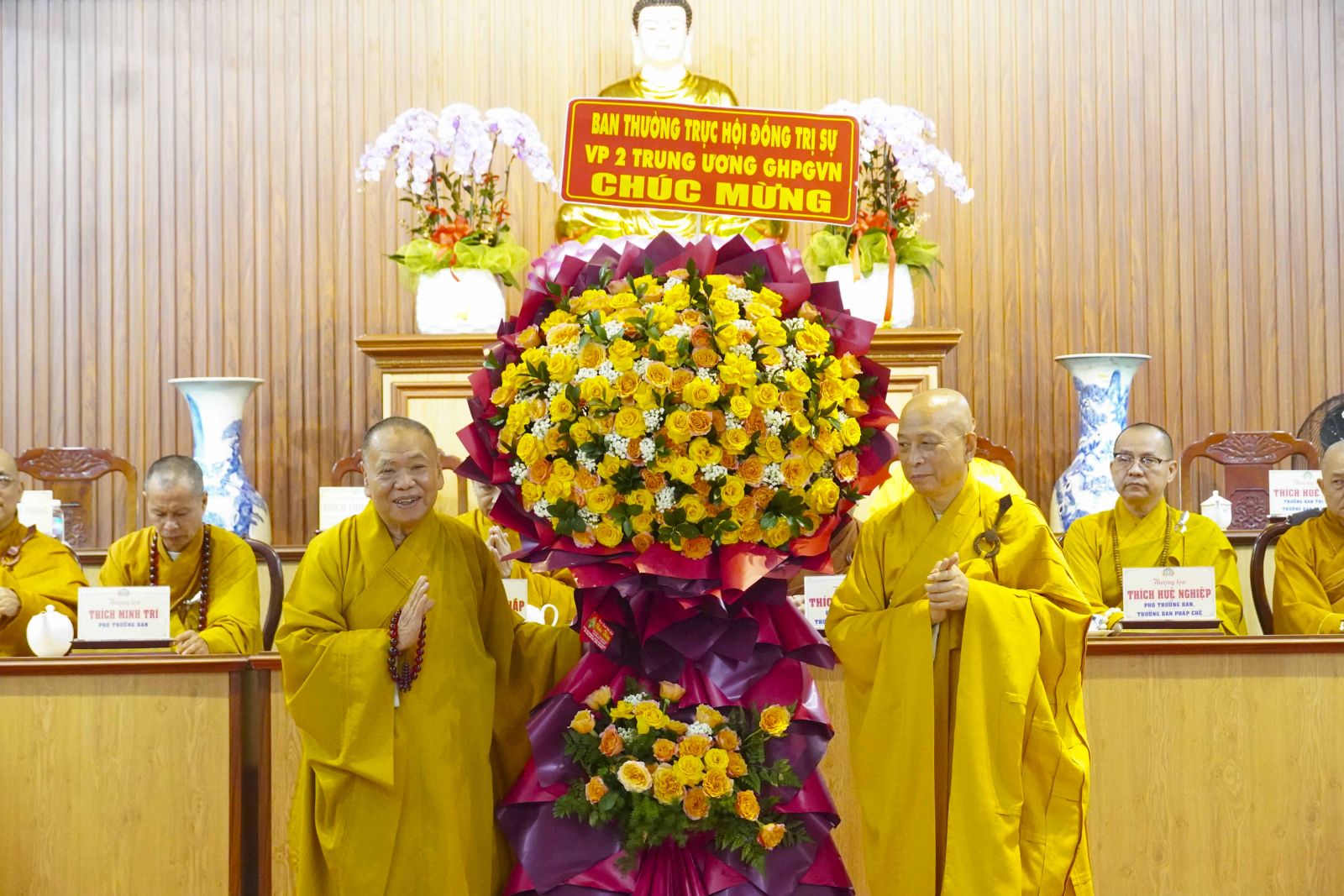 Ngoài những lời pháp ngữ, Ban Tổ chức Khóa Huân tu cũng đón nhận lẵng hoa chúc mừng của Hội đồng Trị sự chúc mừng khai mạc.