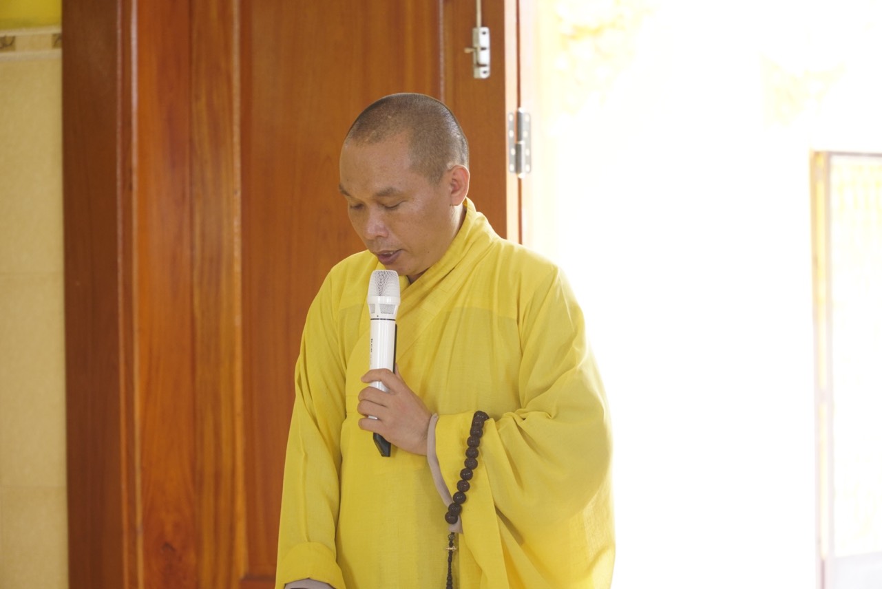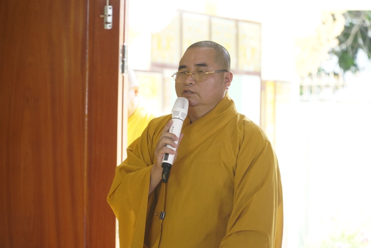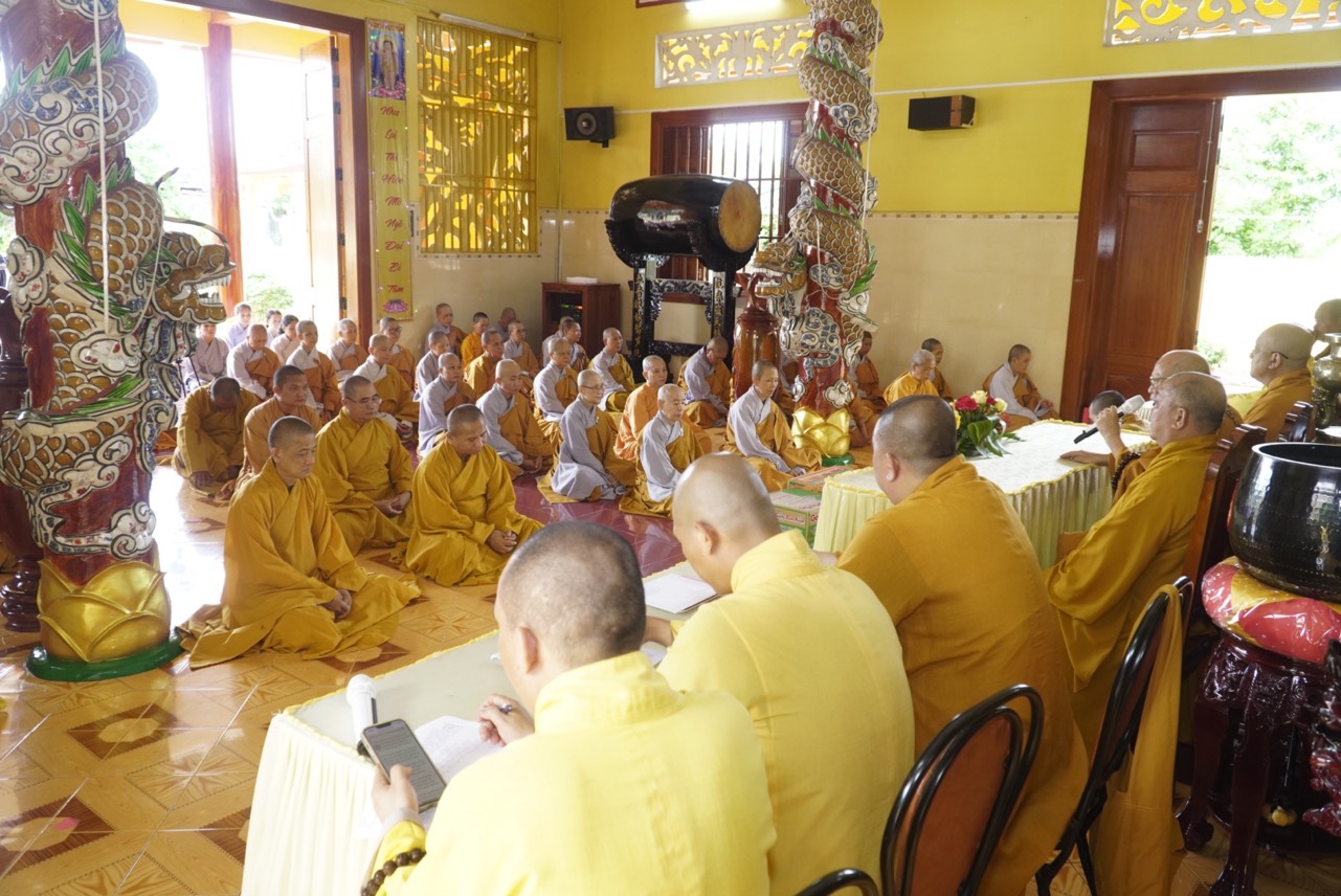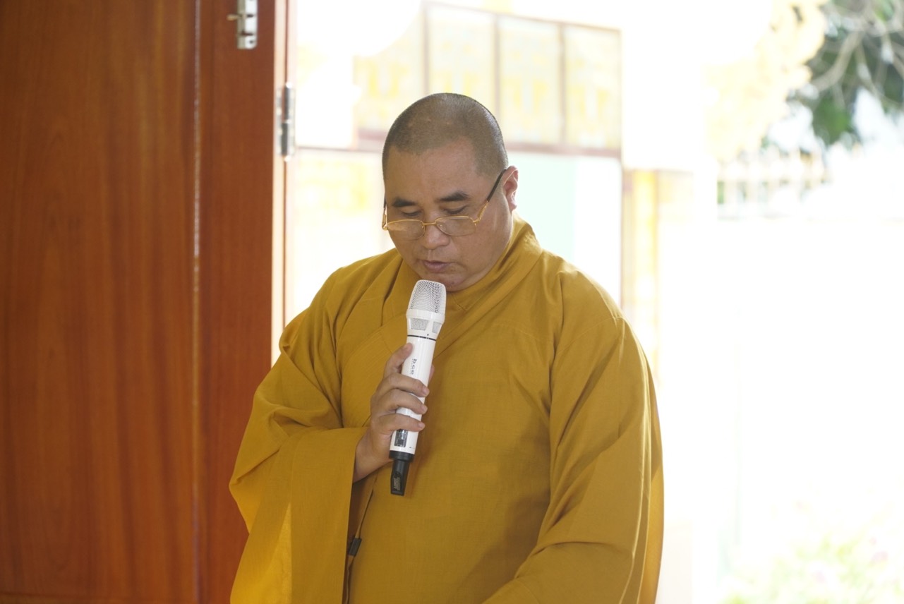 Tại hạ trường huyện Định Quán, ĐĐ. Thích Huệ Hạnh – Chánh thư ký Ban Trị sự GHPGVN huyện Định Quán đã báo cáo công tác tổ chức An cư Kiết hạ tại huyện Định Quán trong năm 2023.