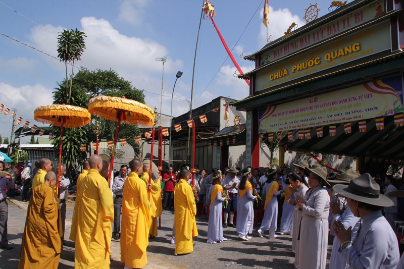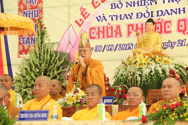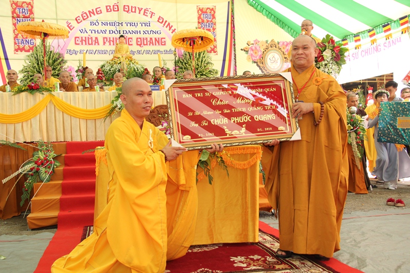 Đại đức Tân trụ trì đã phát nguyện trước Chư tôn đức phát nguyện nghiêm trì giới luật của người xuất gia học đạo, làm tròn nhiệm vụ sứ giả như lai, hoằng pháp độ sanh, thực hiện đúng hiến chương giáo hội, luôn tinh tấn thực hành kinh luật luận, trau dồi kiến thức, kiến tạo đời sống tâm linh tốt đời đẹp đạo, góp phần an sinh xã hội, đem lại ấm no, hạnh phúc cho mọi người. Để tròn trách nhiệm này, ĐĐ mong luôn được sự chỉ dạy của Chư tôn đức, sự góp sức của Phật tử và sự ủng hộ của các cấp chính quyền. Đại diện Phật tử Chùa Phước Quang cũng phát biểu bày tỏ sự vui mừng, cảm niệm ân đức Chư tôn Thiền đức đã bổ nhiệm một sứ giả Như Lai về Chùa để Phật tử được hướng dẫn tu học theo chánh pháp.