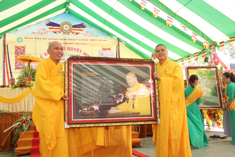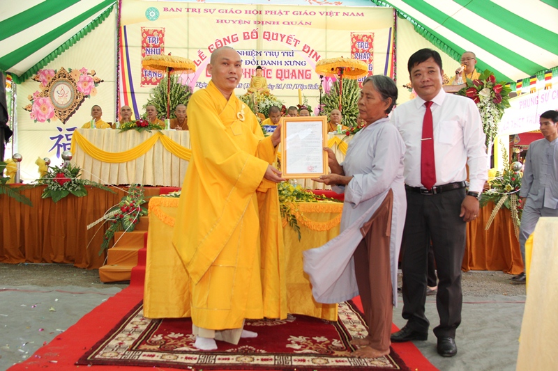 Để chúc mừng sự quang lâm của Chư tôn đức trong ngày vui trọng đại này, các em Phật tử đã dâng những lẵng hoa tươi thắm khi những ca từ của bài hát “Kính mến Thầy” được cất lên. Sau khi ĐĐ Thích Thiện Trí đọc các quyết định, ĐĐ Thích Quảng Tịch đã lần lượt đón nhận quyết định bổ nhiệm trụ trì do HT Thích Liêm Chính trao và QĐ thay đổi danh xưng chùa do TT Thích Chơn Trí trao. Đại diện các cấp Giáo hội, các Chùa, tự viện, thân quyến, bằng hữu, các cấp chính quyền đã trao những lẵng hoa tươi thắm và những tặng phẩm đến Tân Trụ trì.