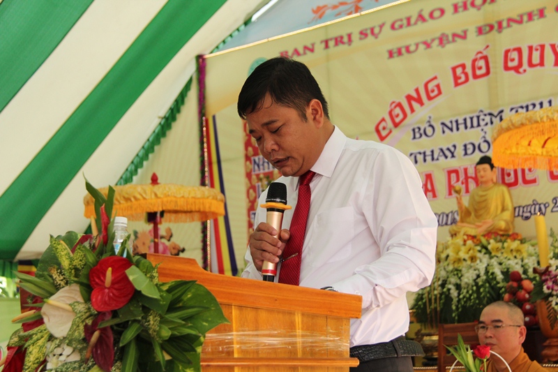 Ông Trần Hữu Hạnh, đại diện các cấp chính quyền phát biểu chúc mừng Tân trụ trì và mong muốn Chư Tăng, Phật tử Chùa Phước Quang sinh hoạt đúng hiến chương giáo hội, góp phần vào an sinh xã hội, chúc buổi lễ thành công tốt đẹp.