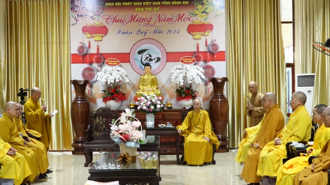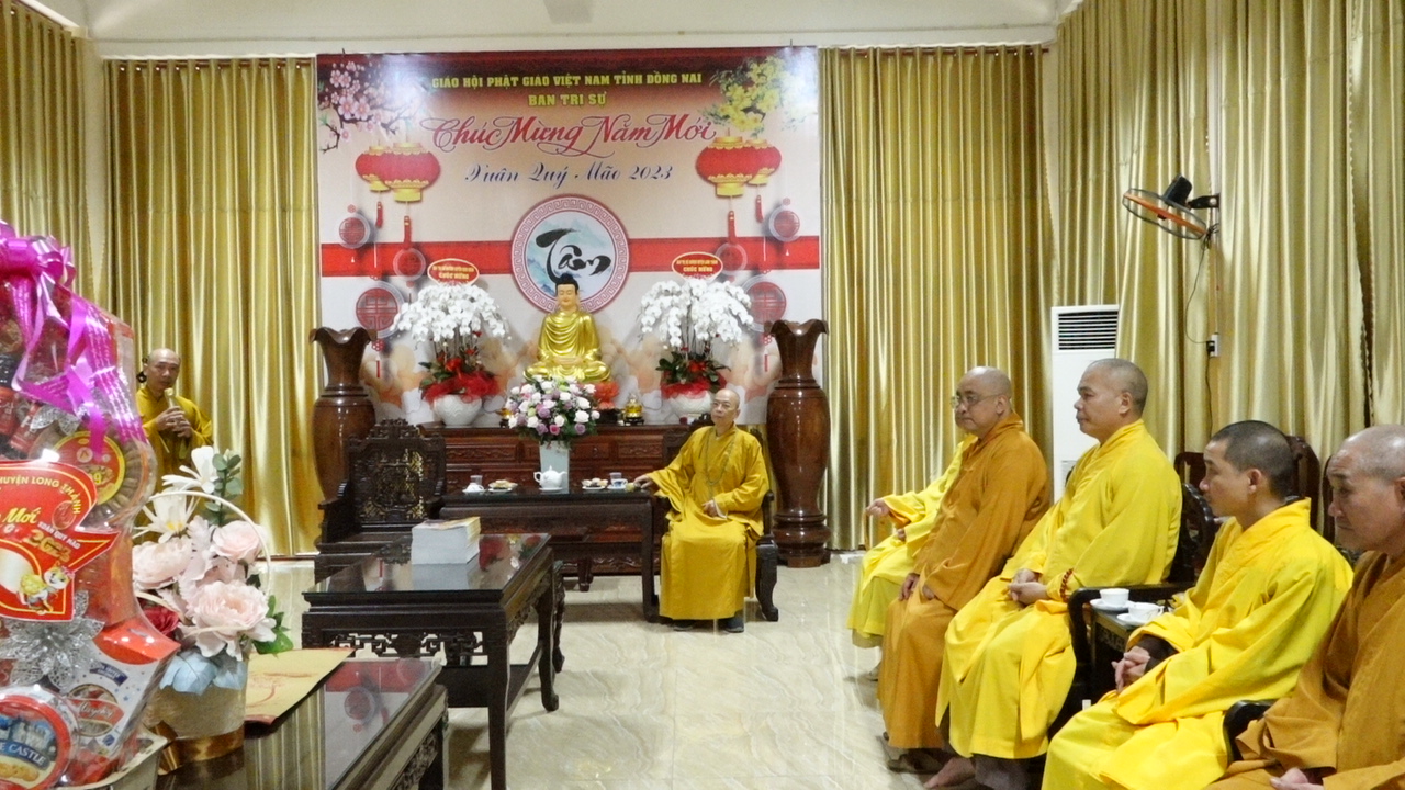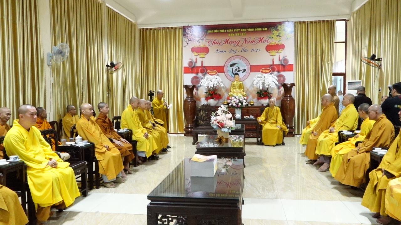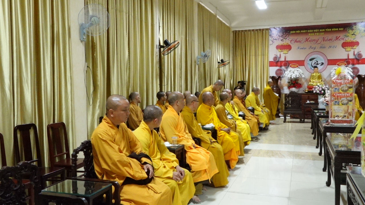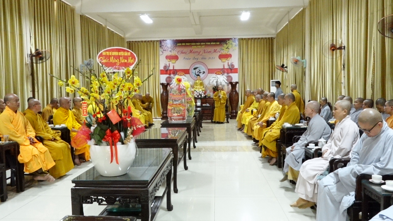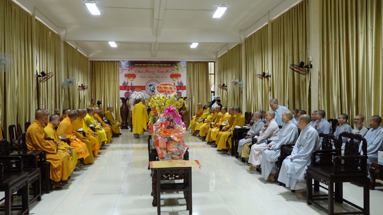 Về đại diện các phái đoàn có TT. Thích Huệ Tánh – Phó Ban Trị sự GHPGVN tỉnh, Trưởng Ban Trị sự GHPGVN Tp. Long Khánh; TT. Thích Thiện Pháp – Phó Ban Trị sự GHPGVN tỉnh, Trưởng Ban Trị sự GHPGVN huyện Nhơn Trạch; TT. Thích Minh Trì – Phó Ban Trị sự GHPGVN tỉnh, Trưởng Ban Trị sự GHPGVN huyện Trảng Bom; TT. Thích Pháp Đăng – Trưởng Ban Trị sự GHPGVN huyện Thống Nhất; ĐĐ. Thích Đạt ma Chí Hải – Trưởng Ban Trị sự GHPGVN huyện Long Thành; ĐĐ. Thích Quảng Lý – Trưởng Ban Trị sự GHPGVN huyện Cẩm Mỹ; ĐĐ. Thích Kiến Tịnh – Phó trưởng ban Thường trực Ban Trị sự GHPGVN huyện Vĩnh Cửu; TT. Thích Thiện Thọ - Phó Trưởng ban Thường trực Ban Trị sự GHPGVN Tp. Biên Hòa; TT. Thích Huệ Quang – Phó Trưởng ban Thường trực Ban Trị sự GHPGVN huyện Xuân Lộc; cùng chư tôn đưc Tăng Ni thường trực Ban Trị sự GHPGVN các huyện và thành phố đồng về Chúc tết.