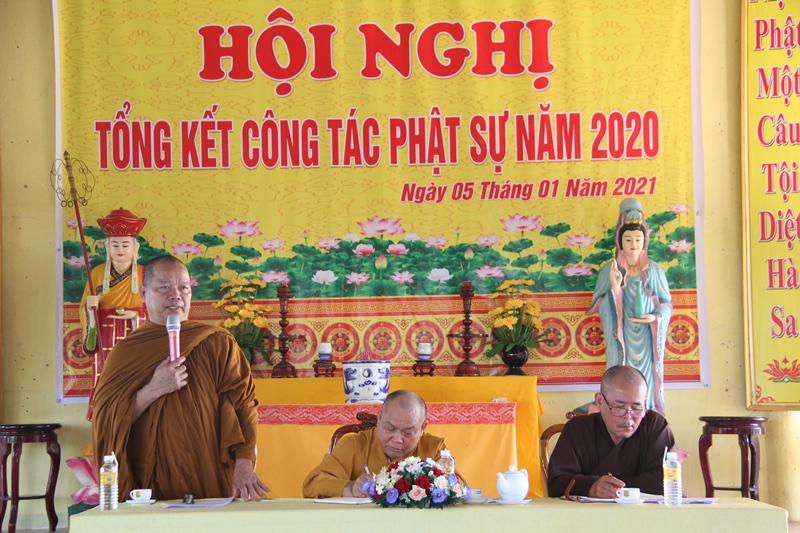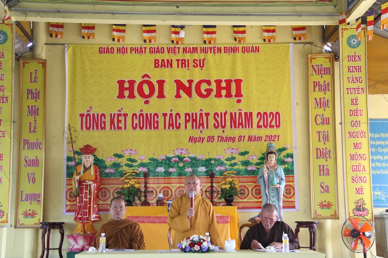 Đại đức Thích Huệ Hạnh – Phó Thư ký BTS GHPGVN huyện Định Quán báo cáo tổng kết Phật sự năm 2020: huyện Định Quán có 38 cơ sở Phật giáo với 111 Tăng, Ni, hơn 15.000 tín đồ sinh hoạt, có 6 đơn vị Gia đình Phật tử sinh hoạt thường xuyên. Ngoài những hoạt động thường niên như An cư Kiết hạ, các ngày Đại lễ, cầu siêu nạn nhân tử vong vì giao thông, về công tác từ thiện trên 10 tỷ đồng, trong đó có xây và trao tặng 5 căn nhà tình thương, phát cơm từ thiện, phát gạo trong mùa dịch, phát cơm bệnh nhân, thuốc nam từ thiện, ủng hộ lũ lụt,… BTS GHPGVN huyện còn tổ chức đoàn cứu trợ đồng các tỉnh miền Trung sau ảnh hưởng lũ lụt; Ban Hướng dẫn Phật tử GHPGVN huyện đã tổ chức đồng bộ các lớp giáo lý căn bản cho phật tử tại gia tại các cơ sở tự viện.