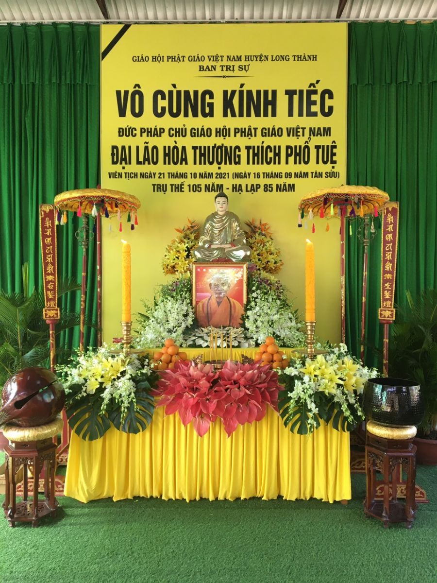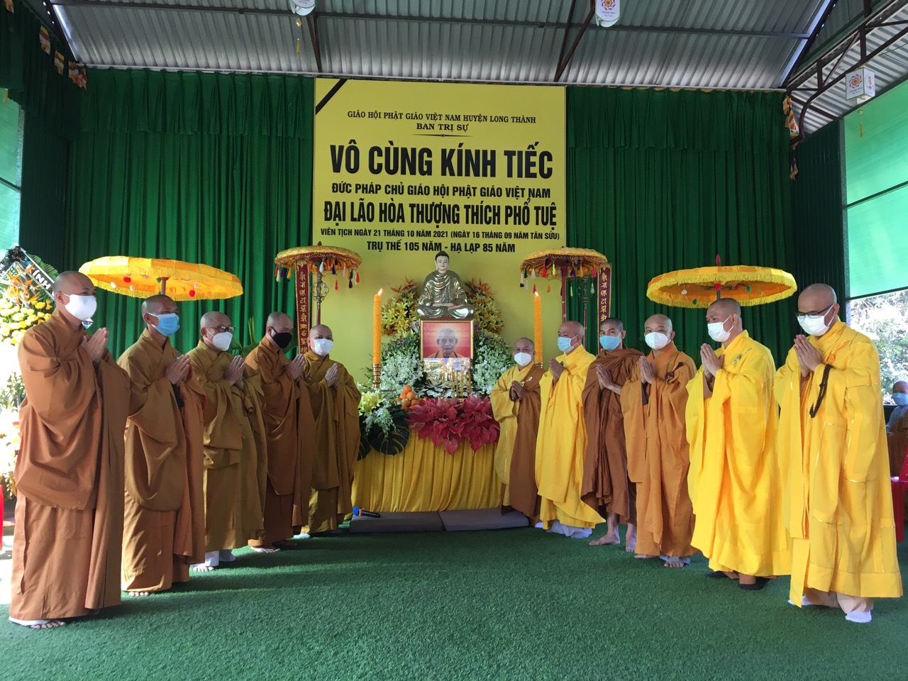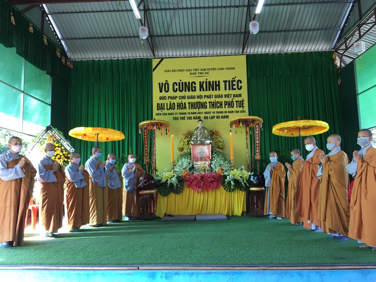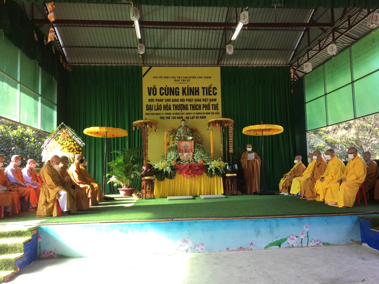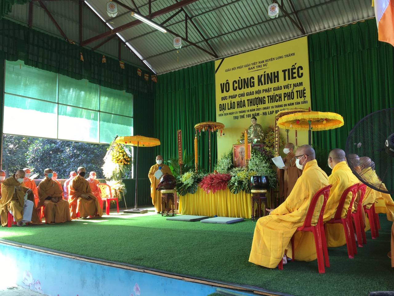 Trang nghiêm tại buổi lễ, ĐĐ. Thích Đạt Ma chí Hải – Phó trưởng Ban Trị sự GHPGVN huyện cung tuyên tiểu sử Hòa Thượng Pháp chủ. Cả một đời xuất gia tu học, Cố đại lão Hoà thượng đã dụng tâm trau dồi kinh điển và cống hiến hết mình bằng trí tuệ Bát nhã và tâm từ rộng lớn cho Đạo pháp và xã hội. Để bày tỏ niềm thương kính và lòng tri ân sâu sắc đến Hoà thượng, trước Linh án trang nghiêm, Thượng tọa Thích Minh Từ - Chánh thư ký Ban Trị sự thay lời Tăng Ni và Phật tử huyện Long Thành kính dâng lời ai điếu cảm niệm. Điếu văn của Ban Trị sự thể hiện tâm hiếu kính tràn đầy của hàng hậu bối đối với bậc trưởng lão lãnh đạo cao nhất của GHPGVN, nêu cao công đức sâu dày của bậc chân tu thạc đức suốt một đời tận tụy phụng sự chúng sanh, góp phần xây dựng khối đại đoàn kết dân tộc, hiển hưng Đạo pháp, khắc ghi hình ảnh tiêu biểu của Tăng sĩ ngày nay cho ngàn đời sau noi gương tu học.