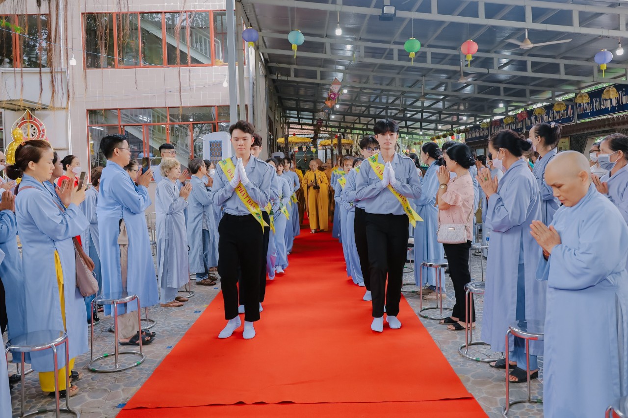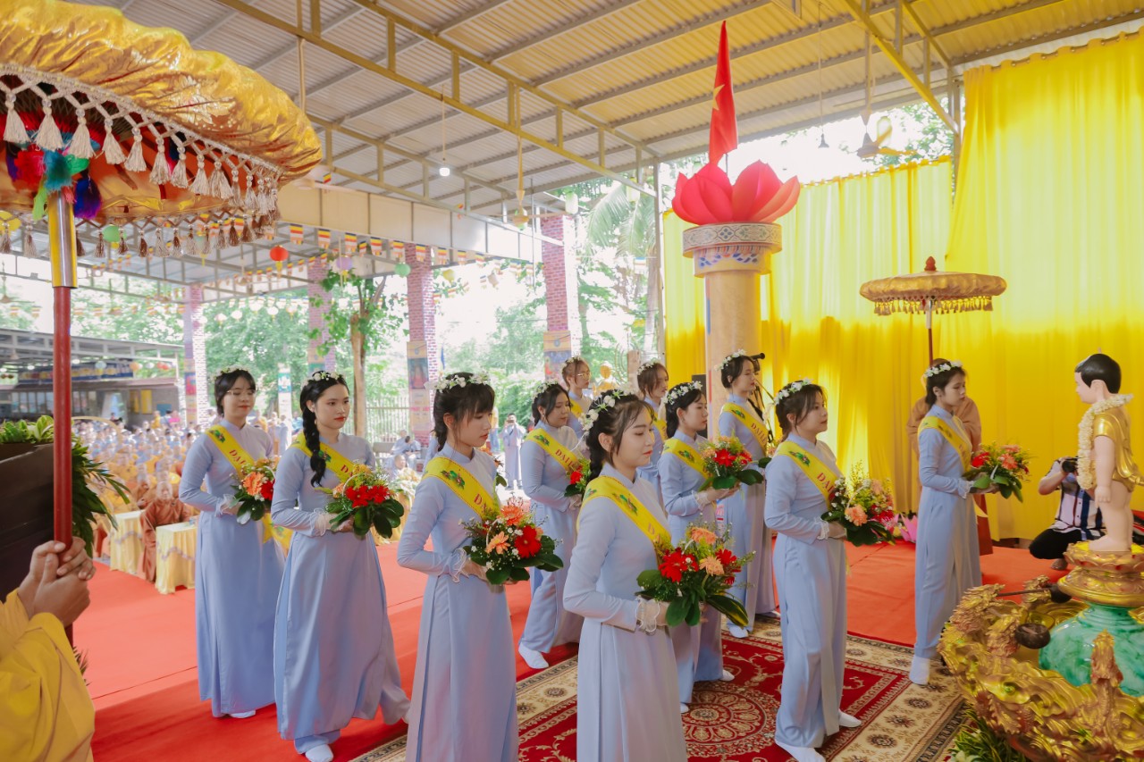 Đại Lễ diễn ra với các nghi thức niệm Phật cầu gia bị, chào Quốc kỳ Đạo kỳ phút nhập từ bi quán và phần dâng hoa cúng dường của các em GĐPT.