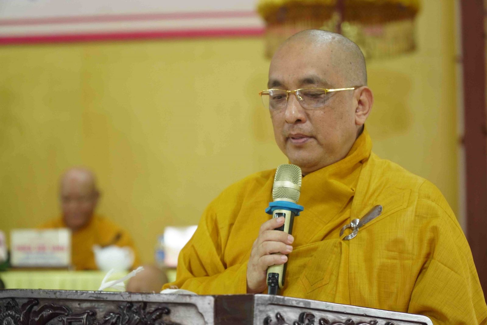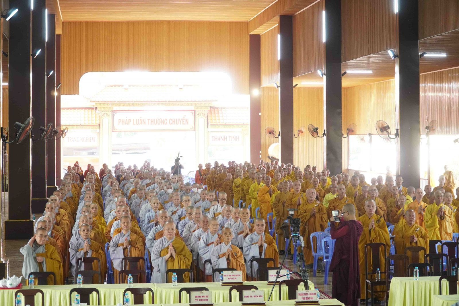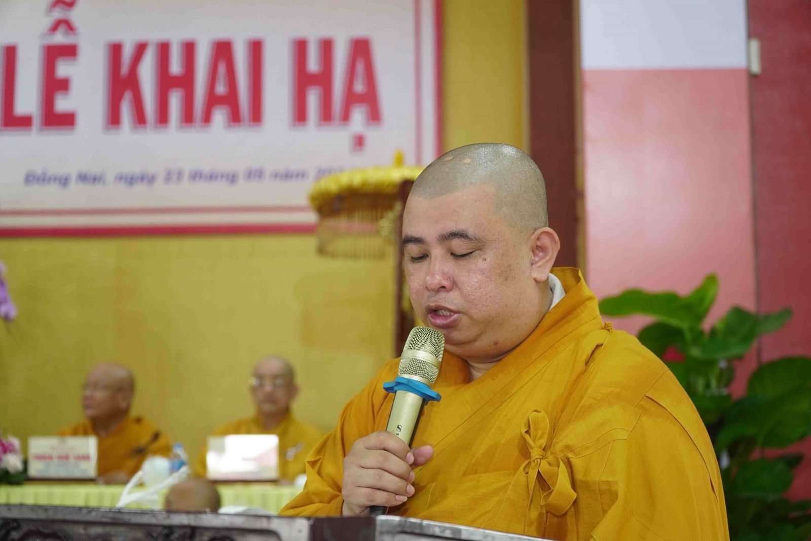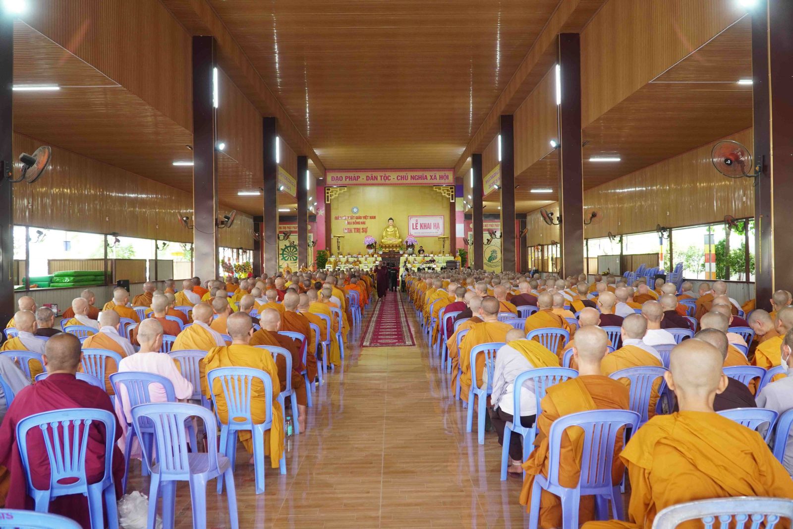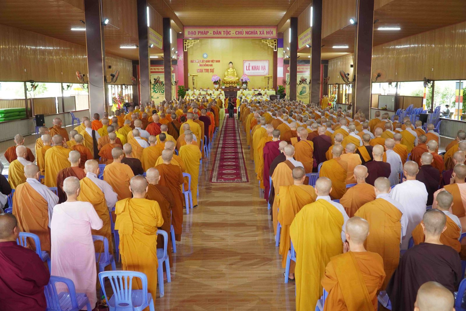Sau phát biểu khai mạc của Thượng tọa Thích Huệ Khai, TT. Thích Đạo Huy đã báo cáo cho biết Phật giáo tỉnh có 5 trường hạ An cư tập trung của hệ phái Bắc tông và Nam tông, gồm: chùa Tỉnh Hội (chư Tăng), Chùa Long Vân (chư Ni), Chùa Phật Hiện (Trường Trung cấp Phật học - cơ sở Tăng), Chùa Huệ Giác (Trường Trung cấp Phật học - cơ sở Ni) và thiền viện Phước Sơn (Phật giáo Nam tông Kinh).